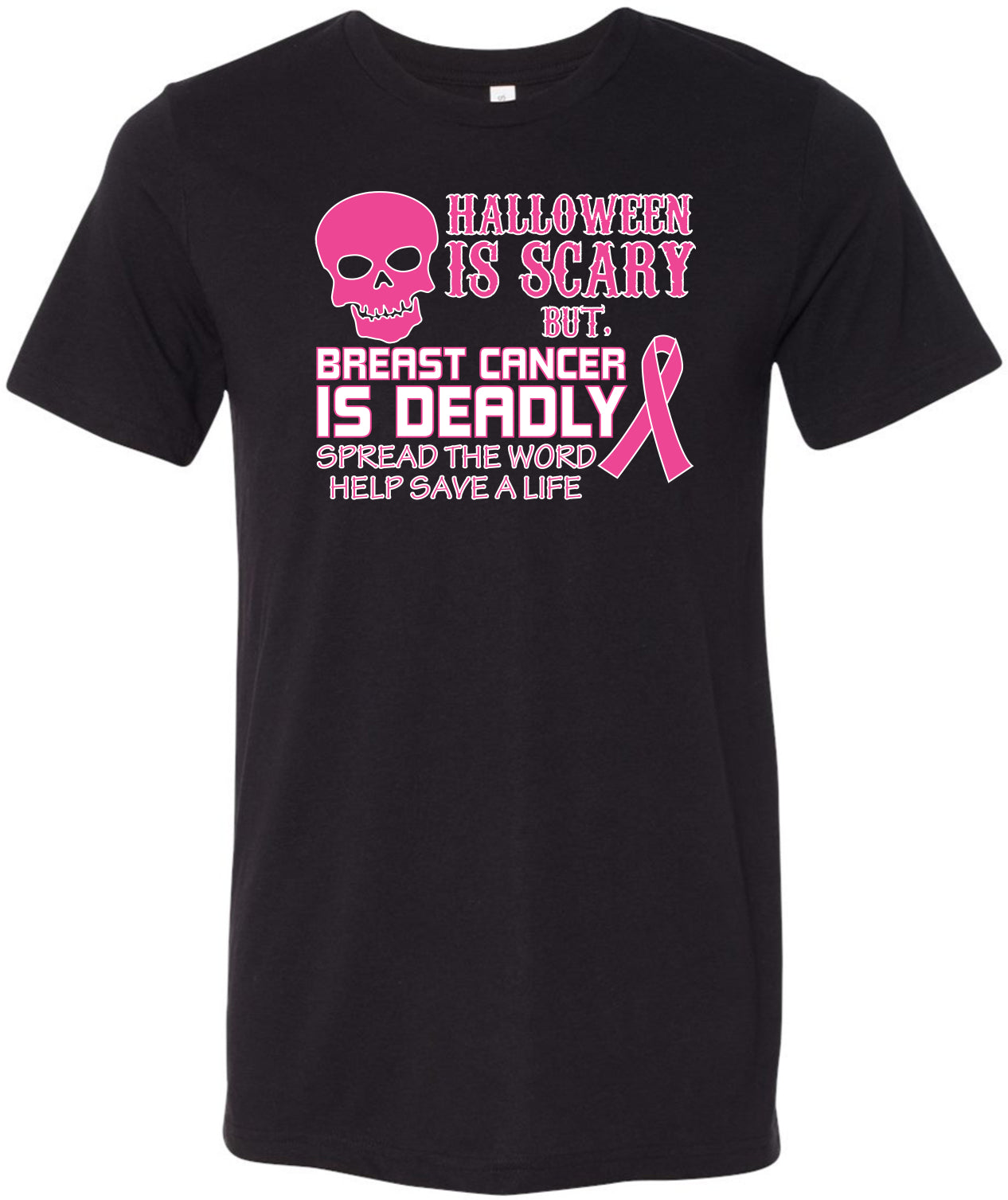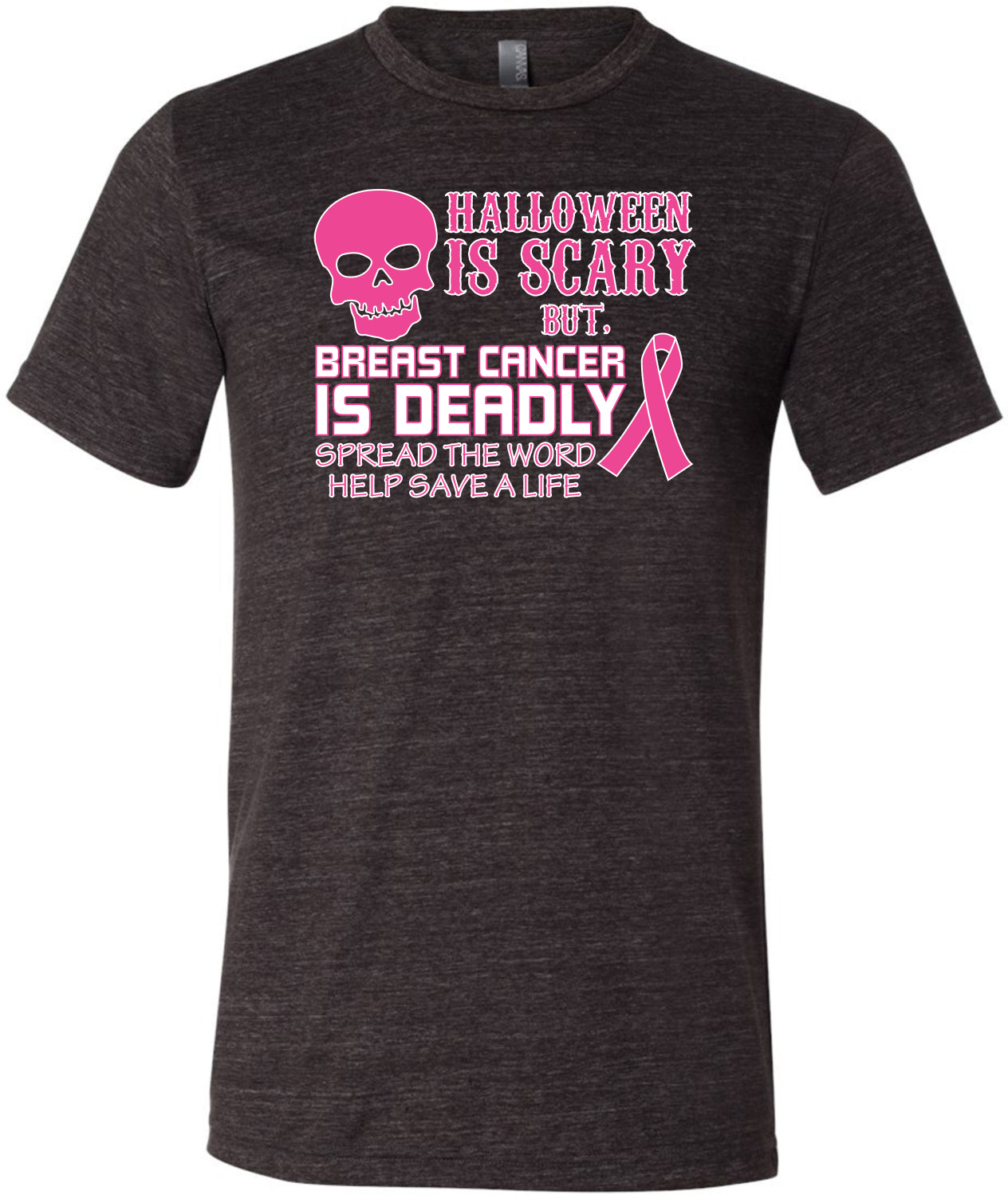 - A breast cancer tri blend t-shirt featuring Halloween is Scary but, Breast Cancer is Deadly Spread The Word Help Save a Life