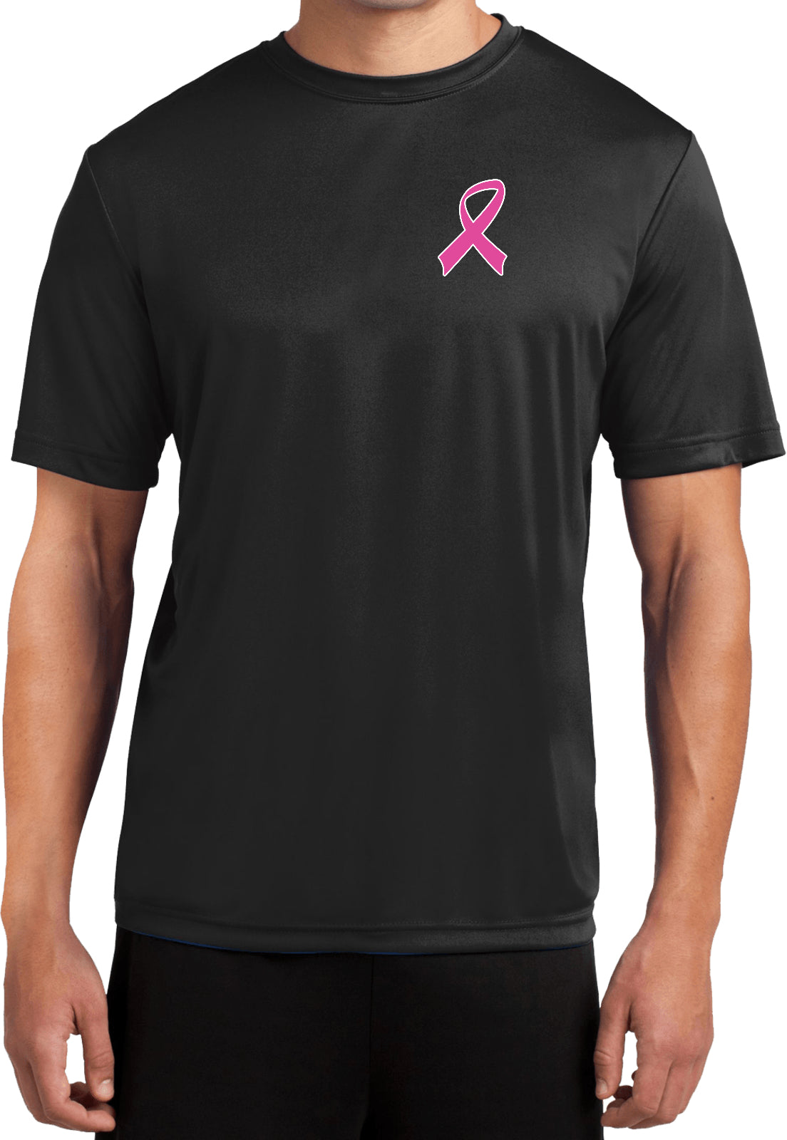 - A mens dry wicking t-shirt featuring a pink breast cancer awareness ribbon as a pocket print