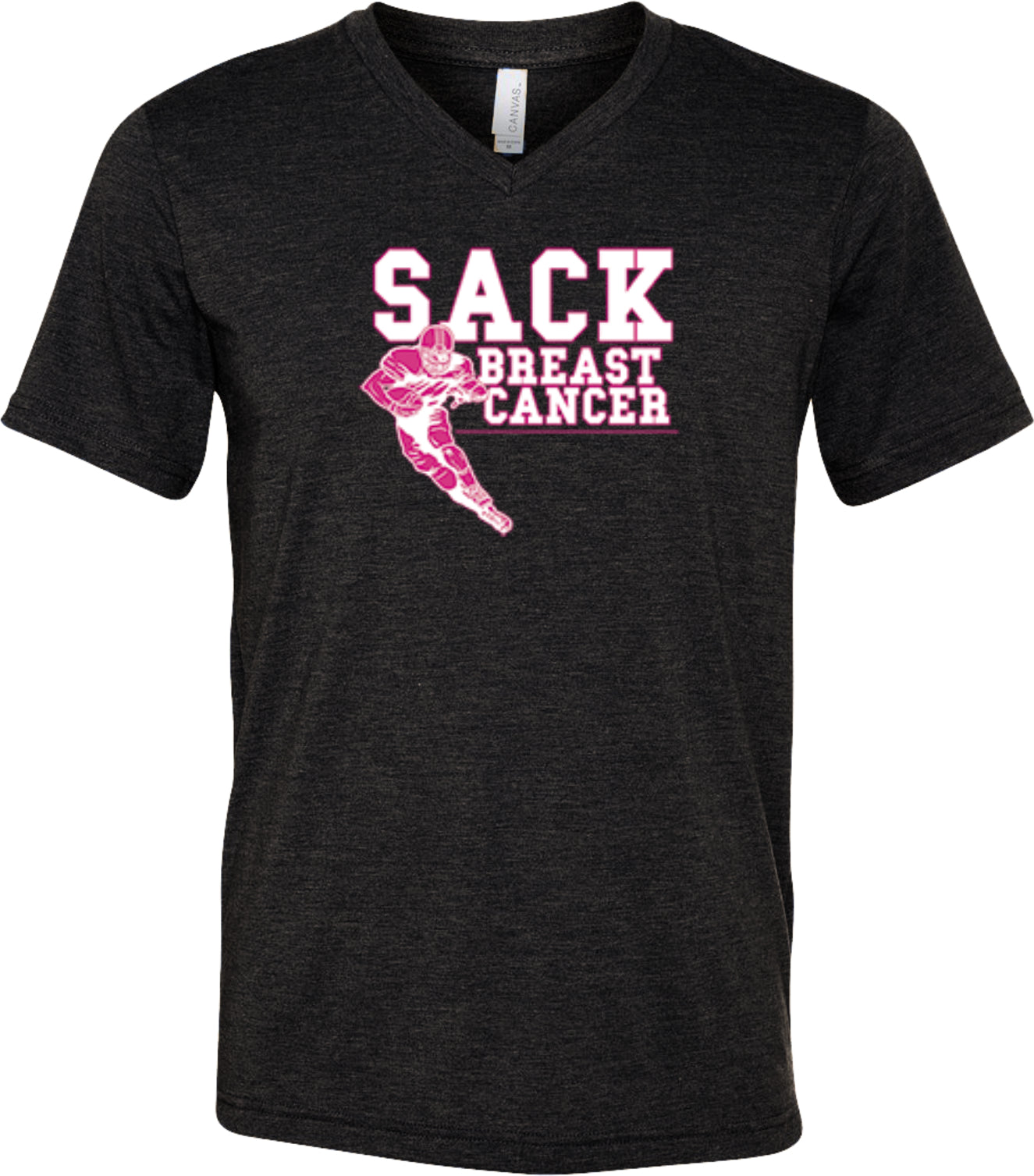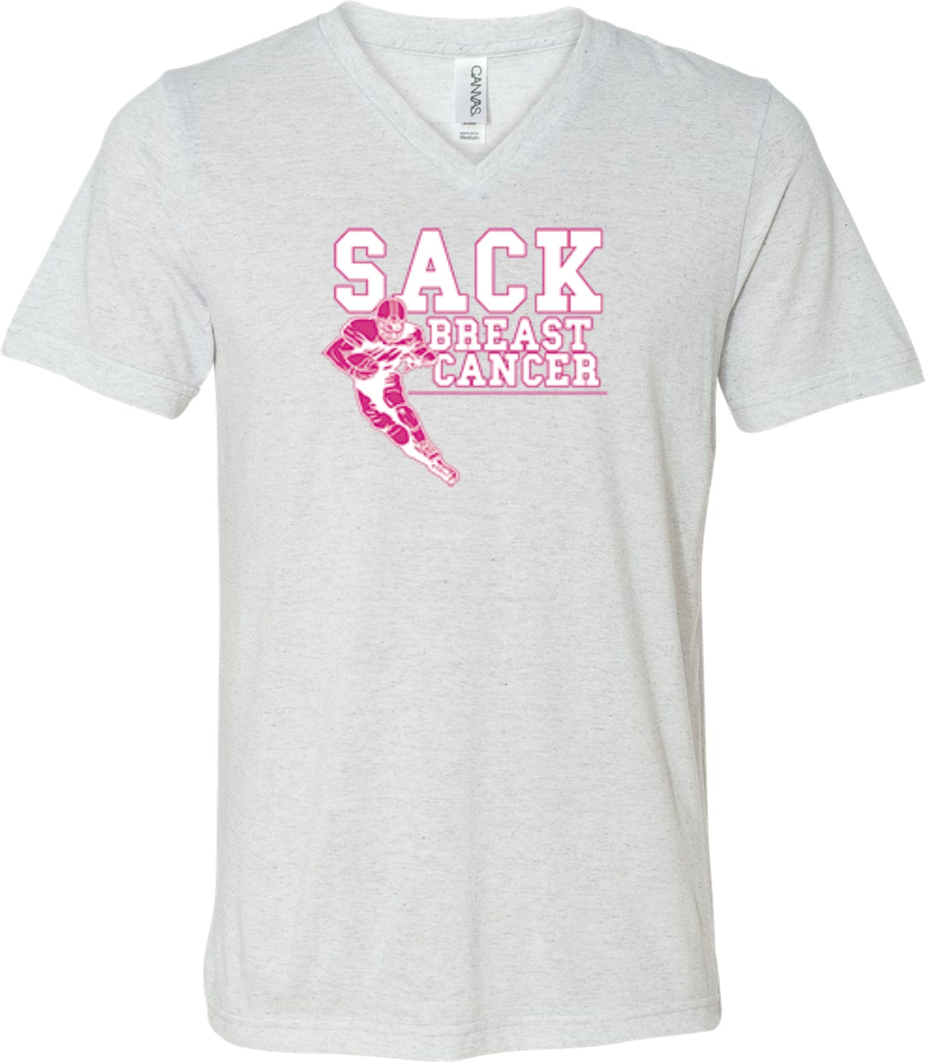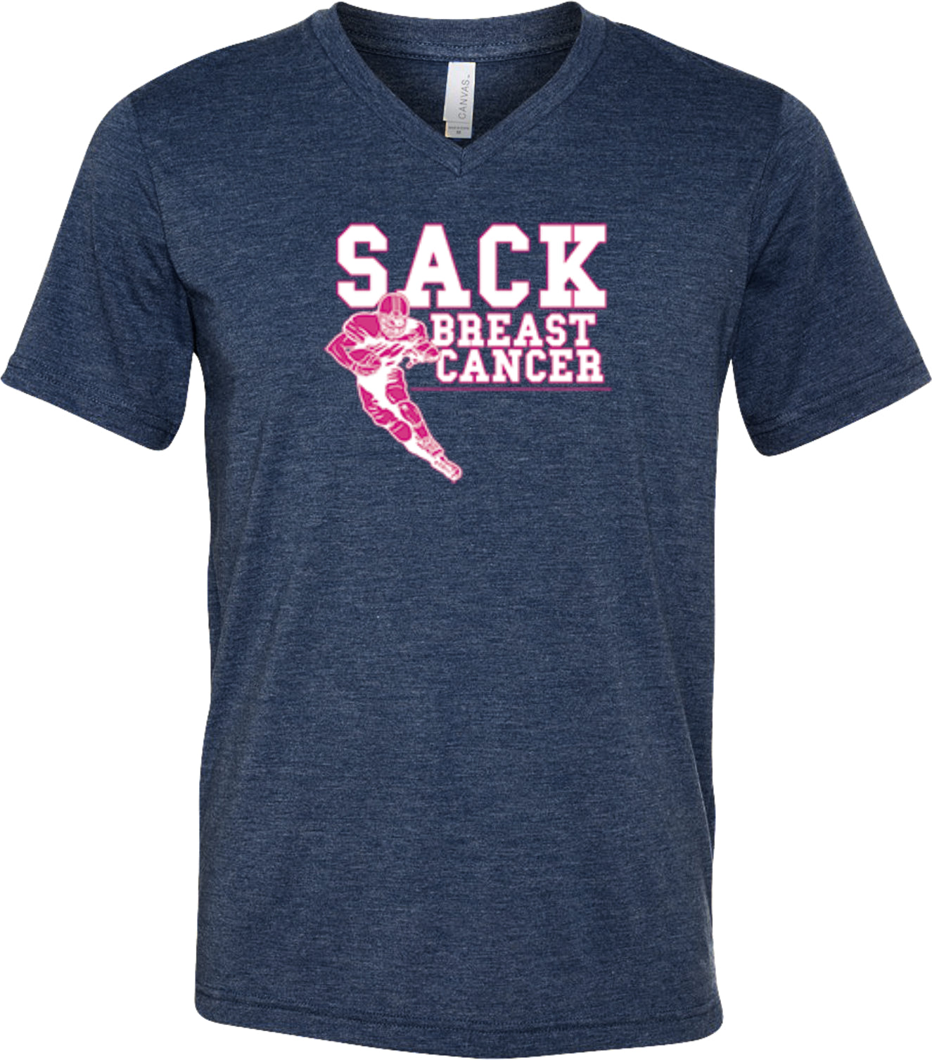 - A tri blend v-neck shirt featuring a football inspired breast cancer awareness design, Sack Breast Cancer