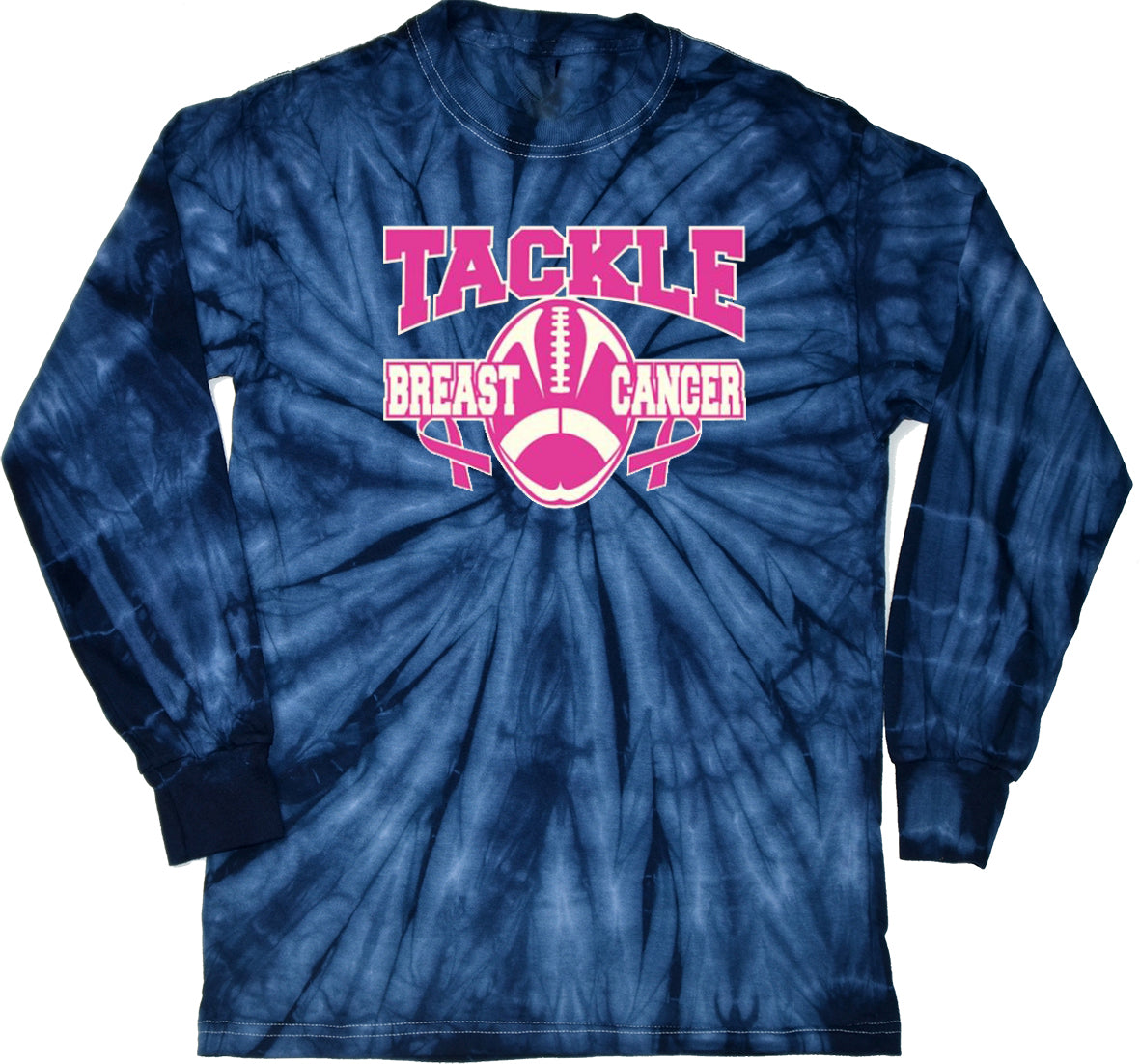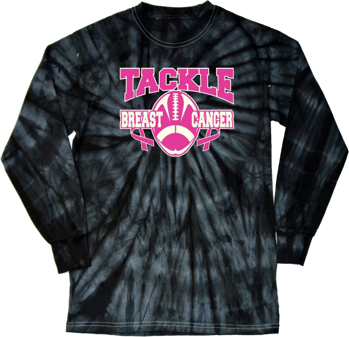 - A long sleeve tie dye shirt featuring a football inspired breast cancer awareness design: Tackle Breast Cancer