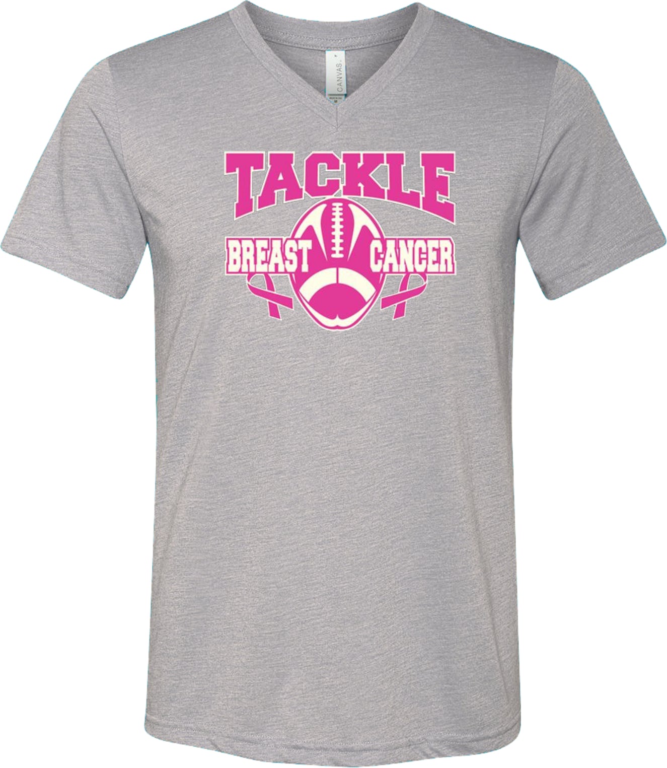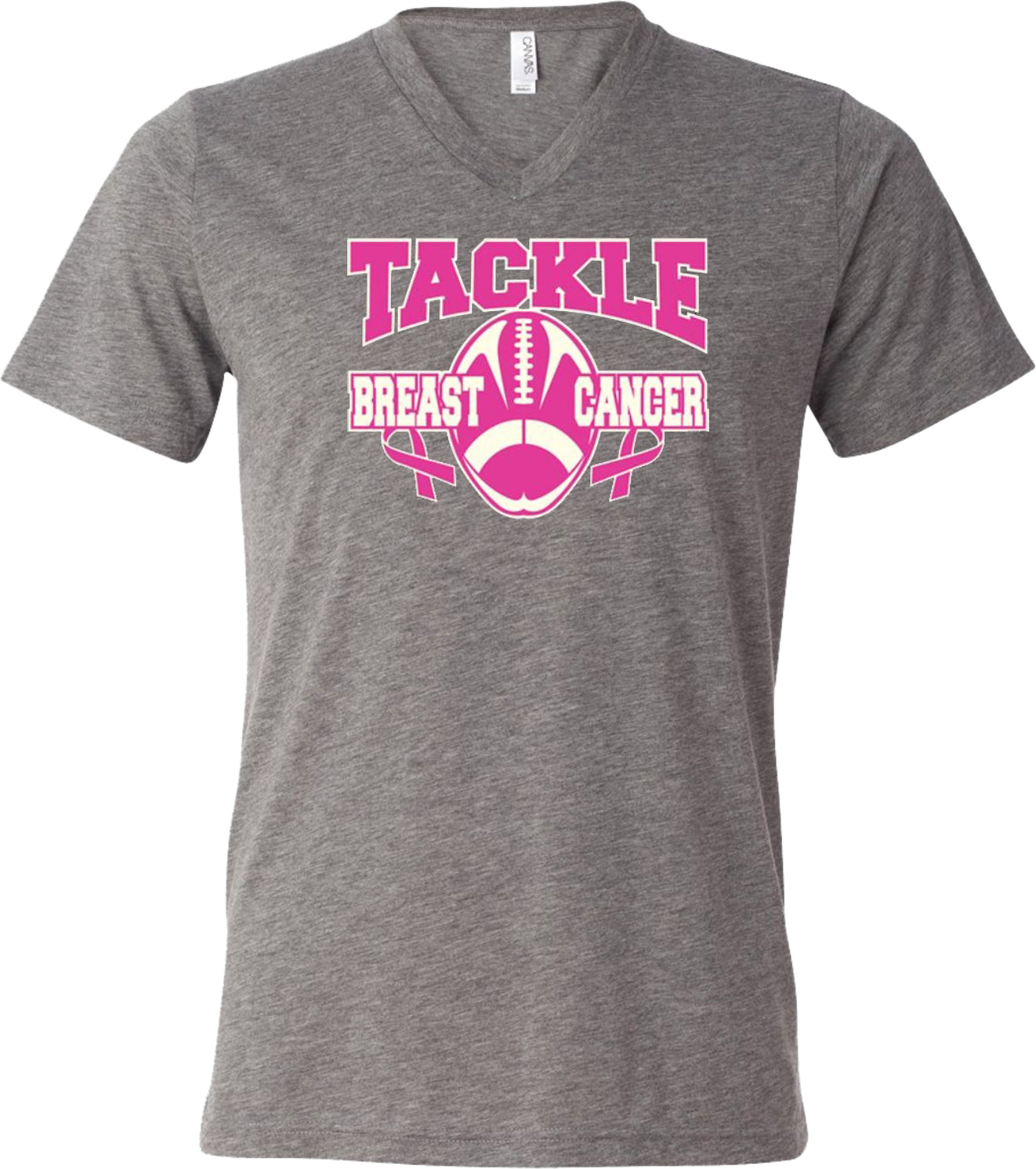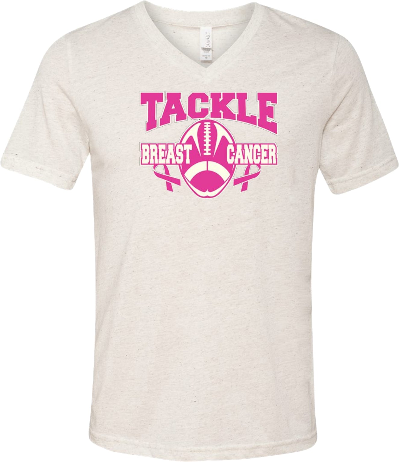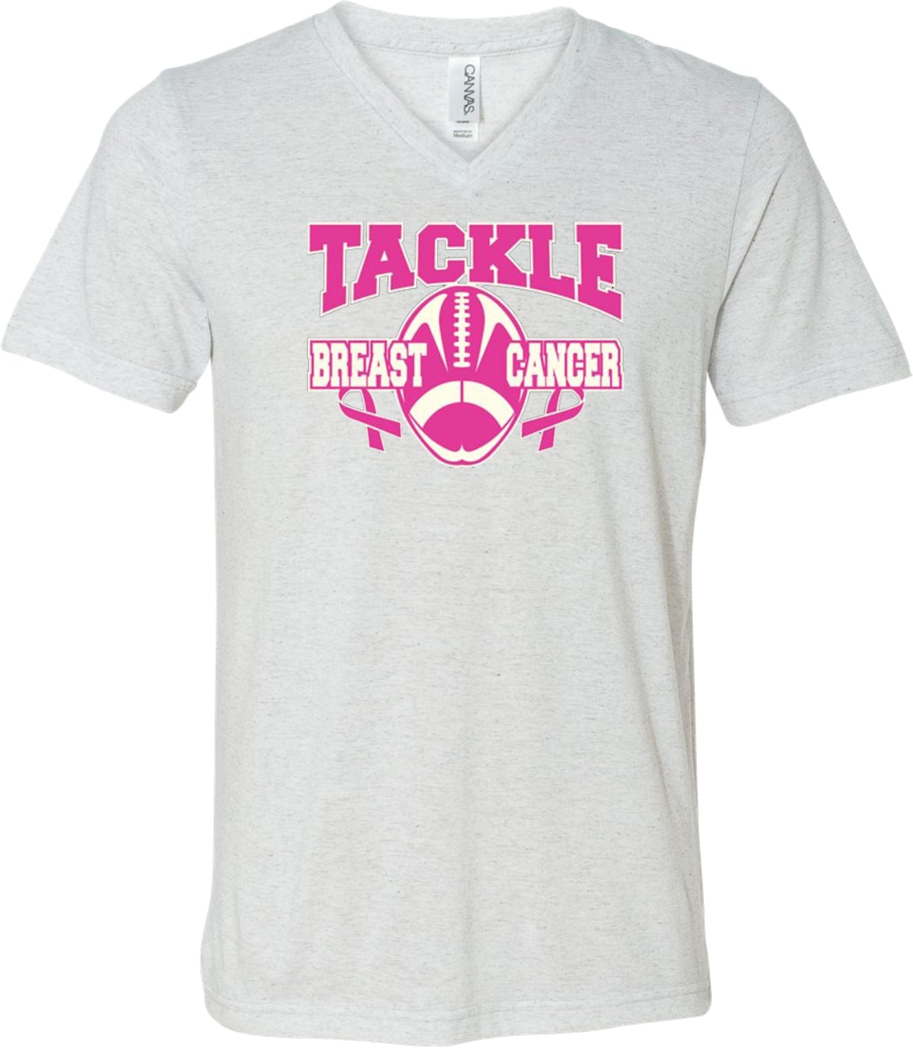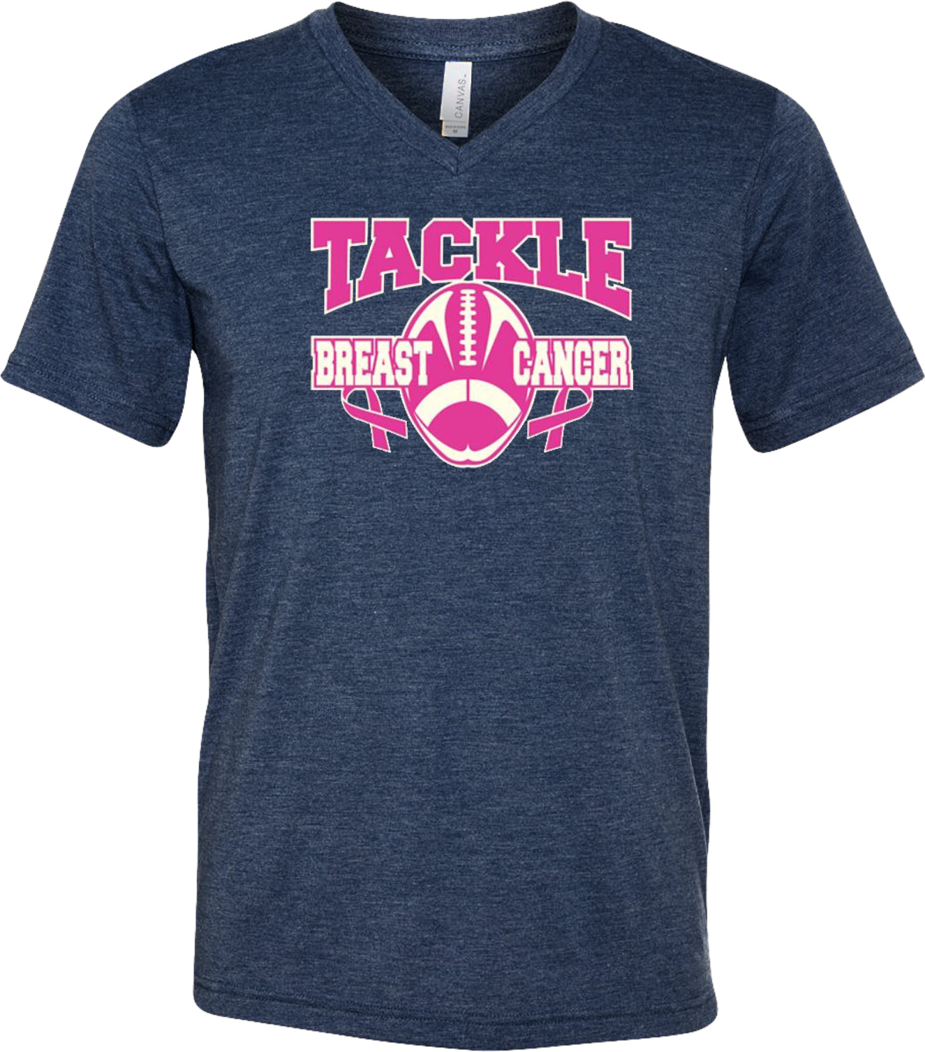 - A mens tri blend v-neck featuring a football inspired breast cancer awareness design: Tackle Breast Cancer