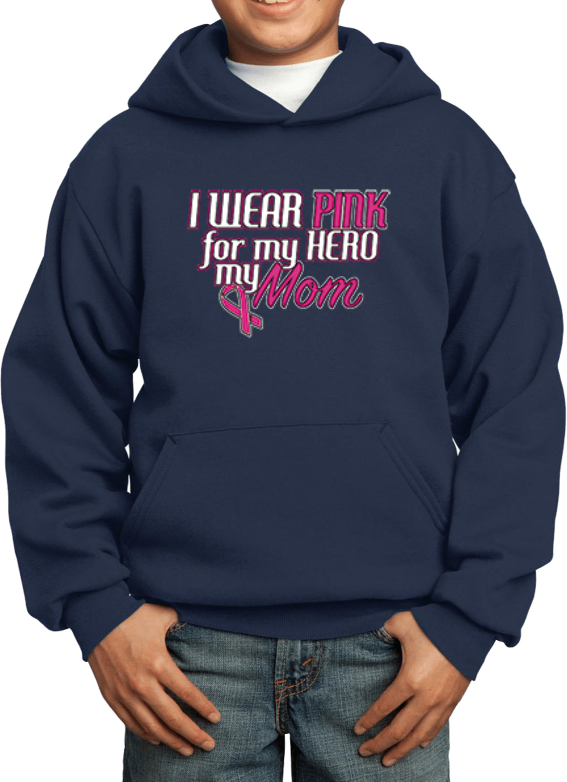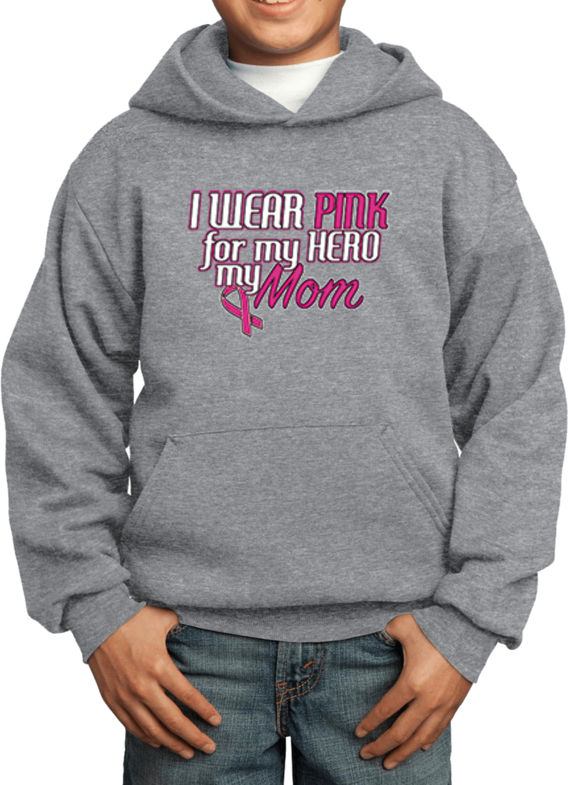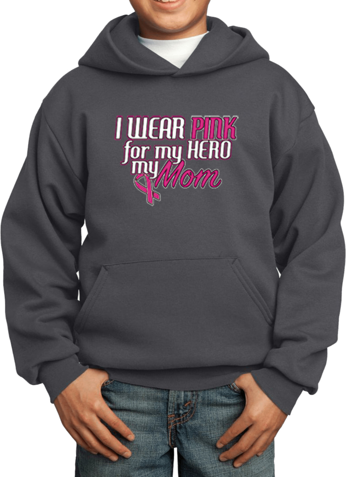 - A breast cancer kids hoodie featuring I Wear Pink For My Hero, My Mom