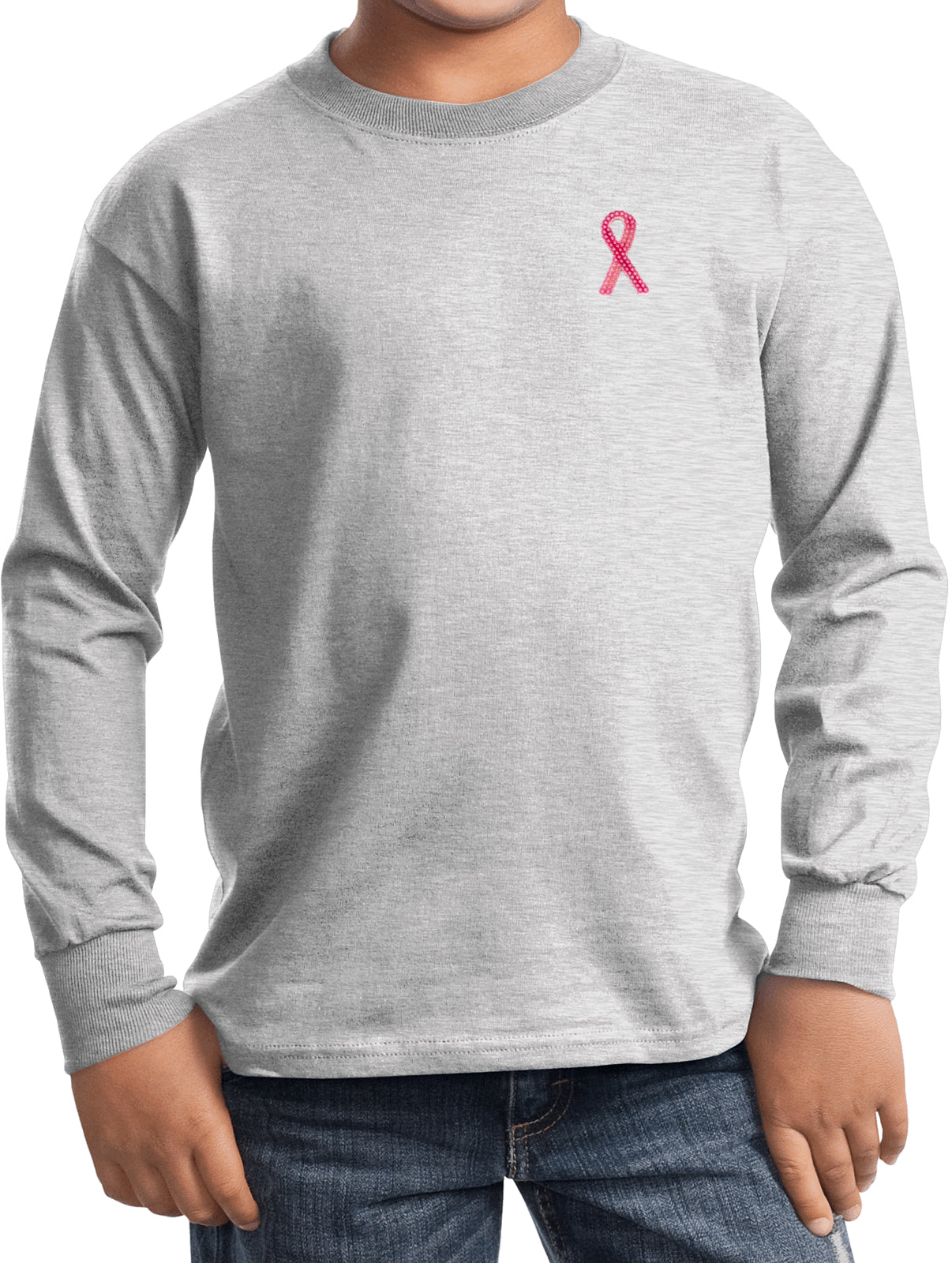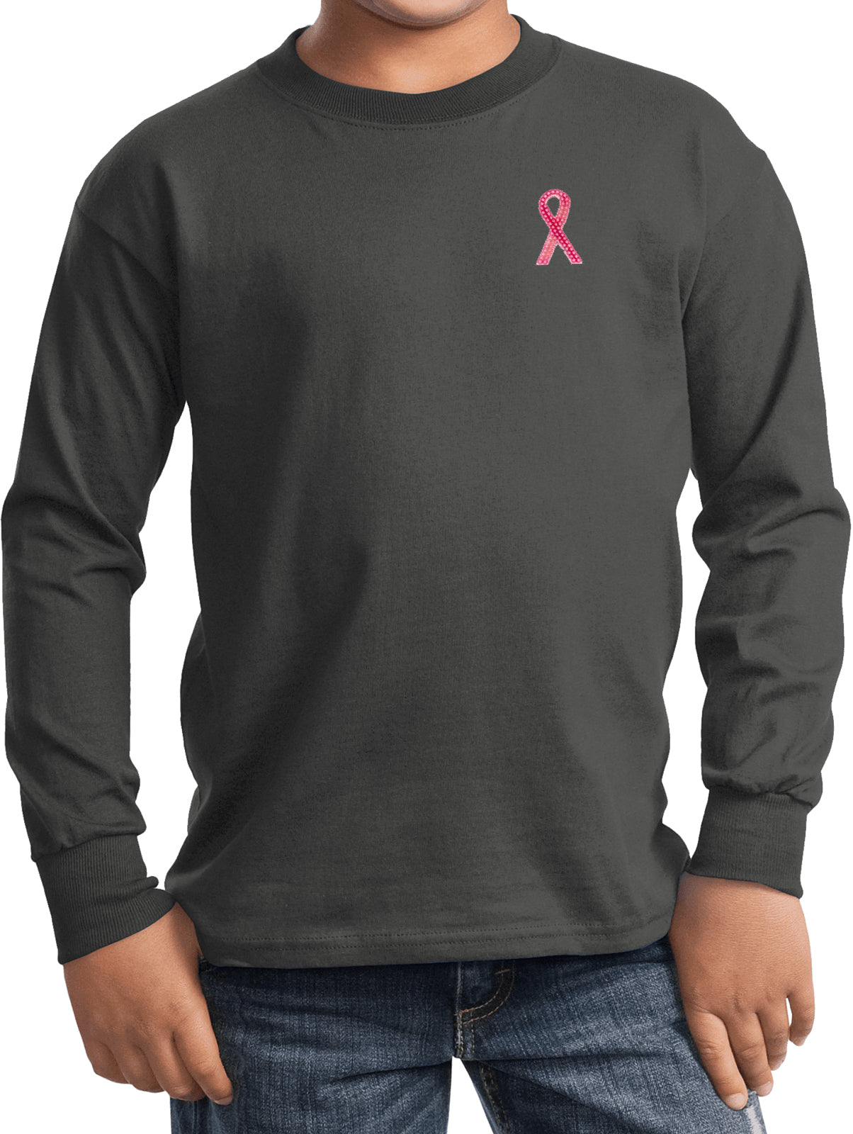 - A youth long sleeve shirt featuring a pink breast cancer awareness ribbon with sequins