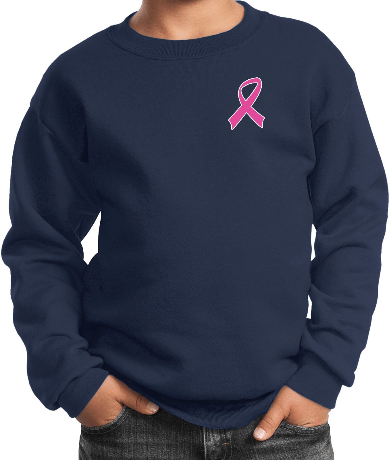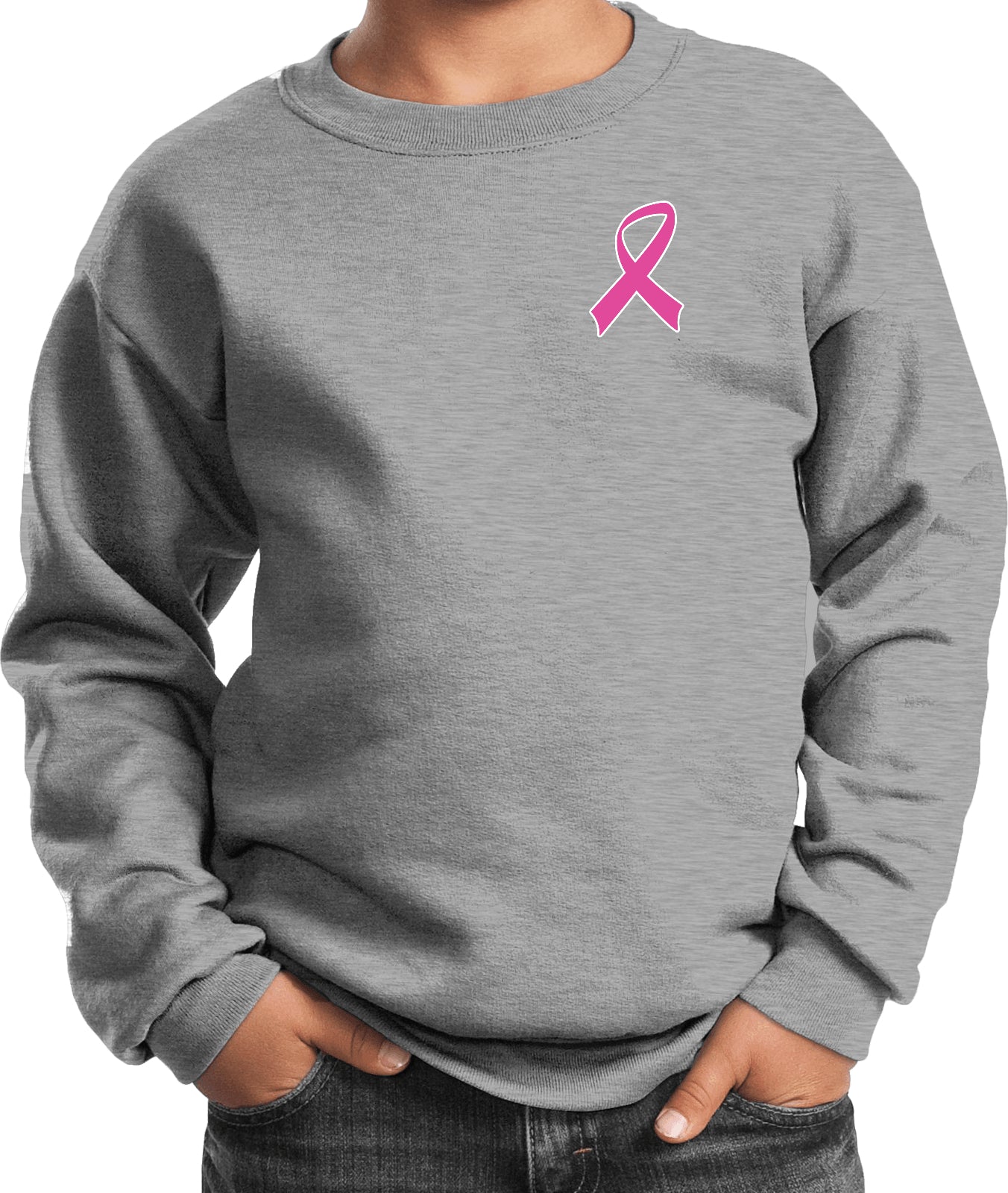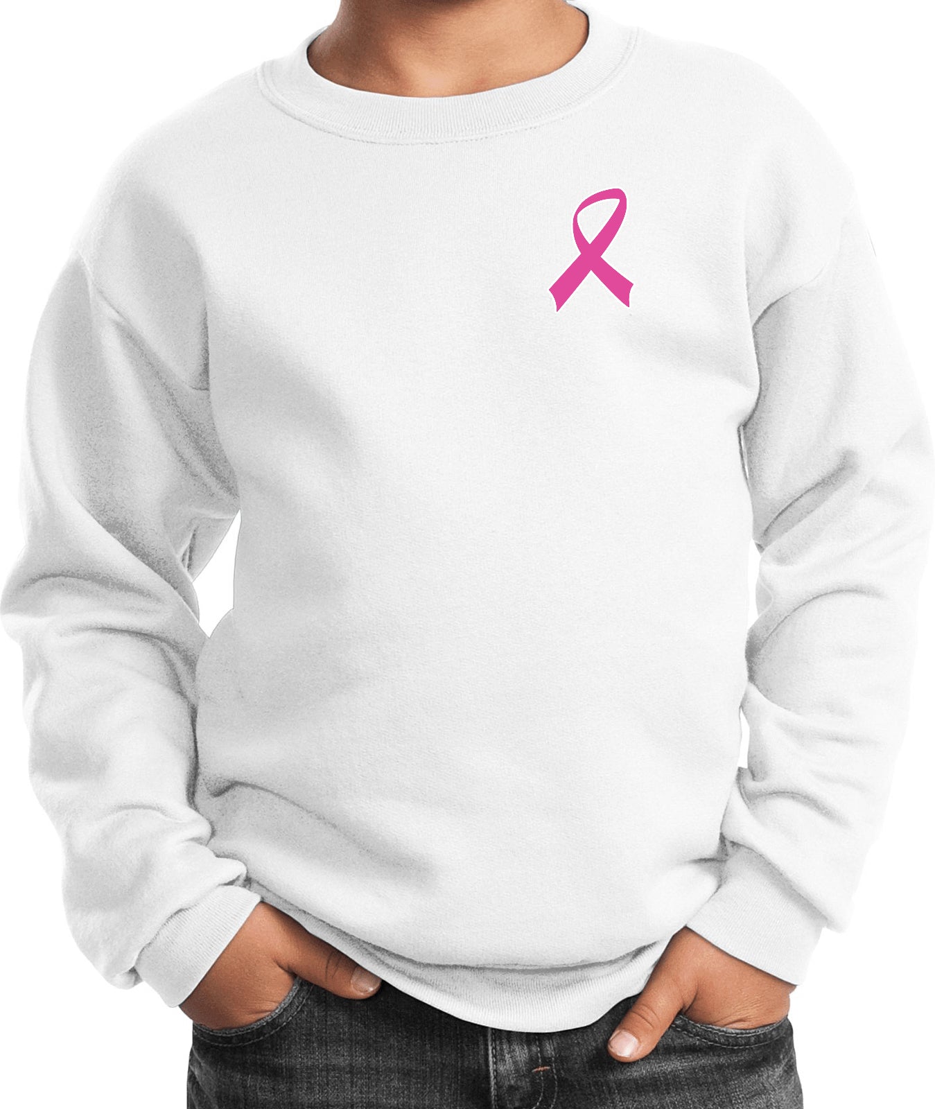 • A youth sweatshirt featuring a pink breast cancer awareness ribbon as a pocket print