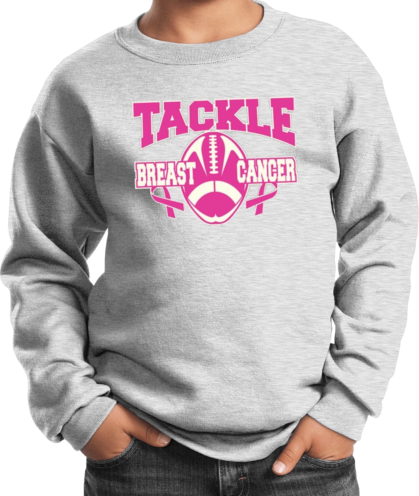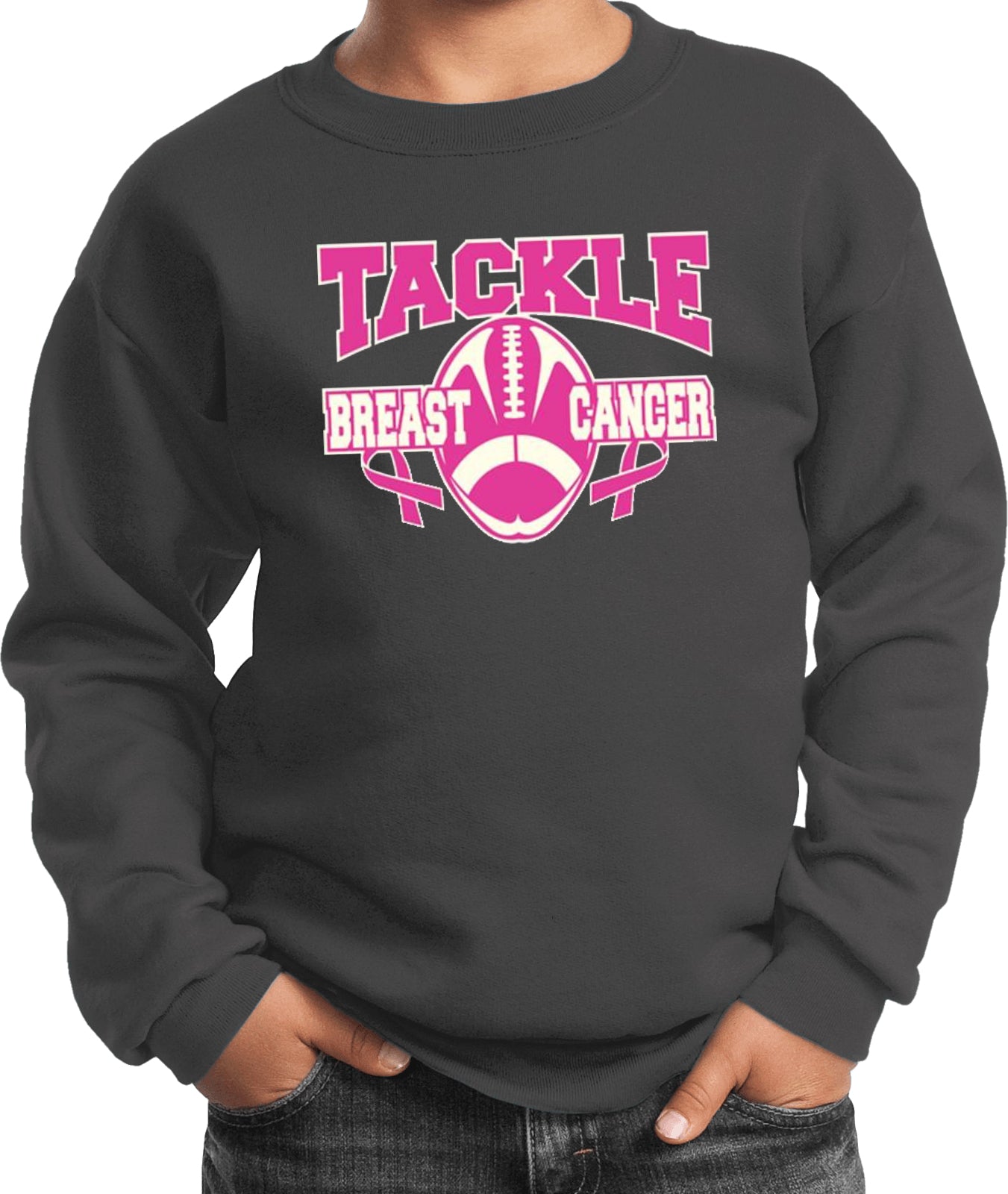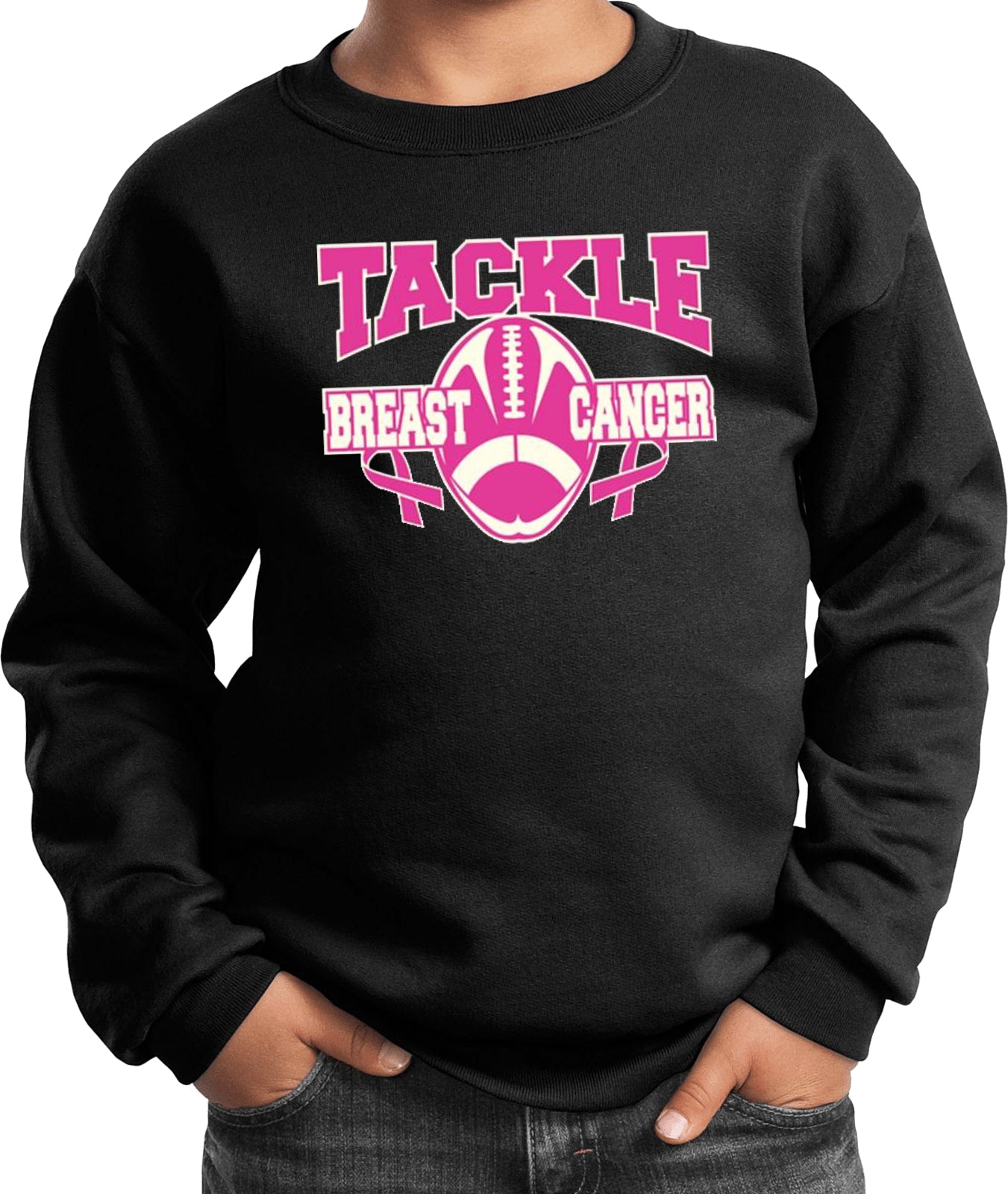 - A kids sweatshirt featuring a football inspired breast cancer awareness design: Tackle Breast Cancer