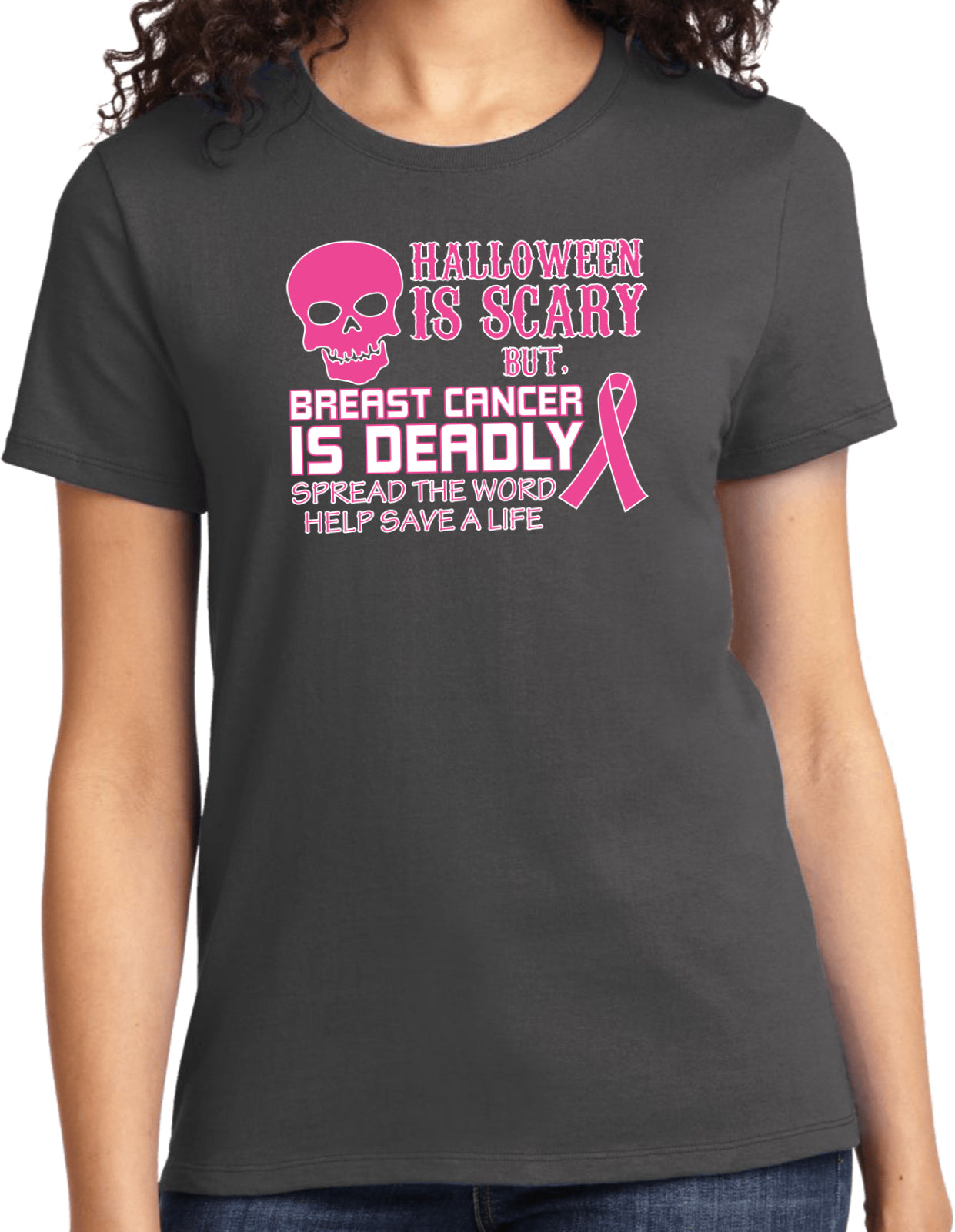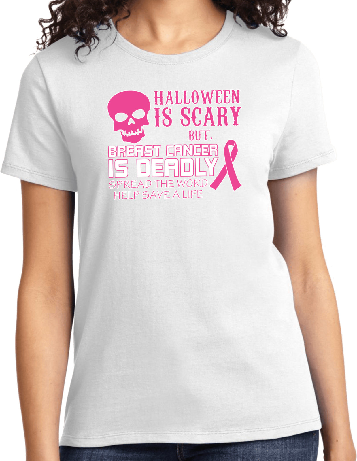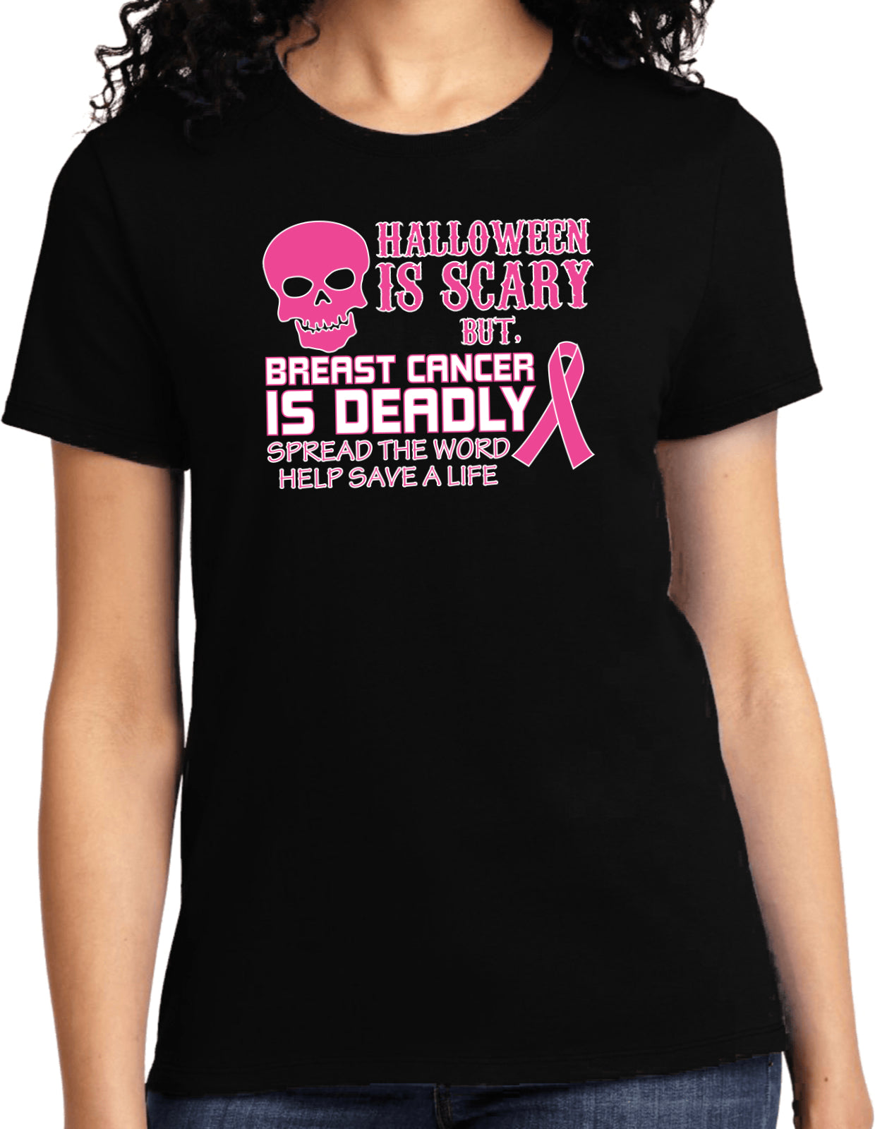 - A ladies t-shirt featuring Halloween is Scary but, Breast Cancer is Deadly Spread The Word Help Save a Life