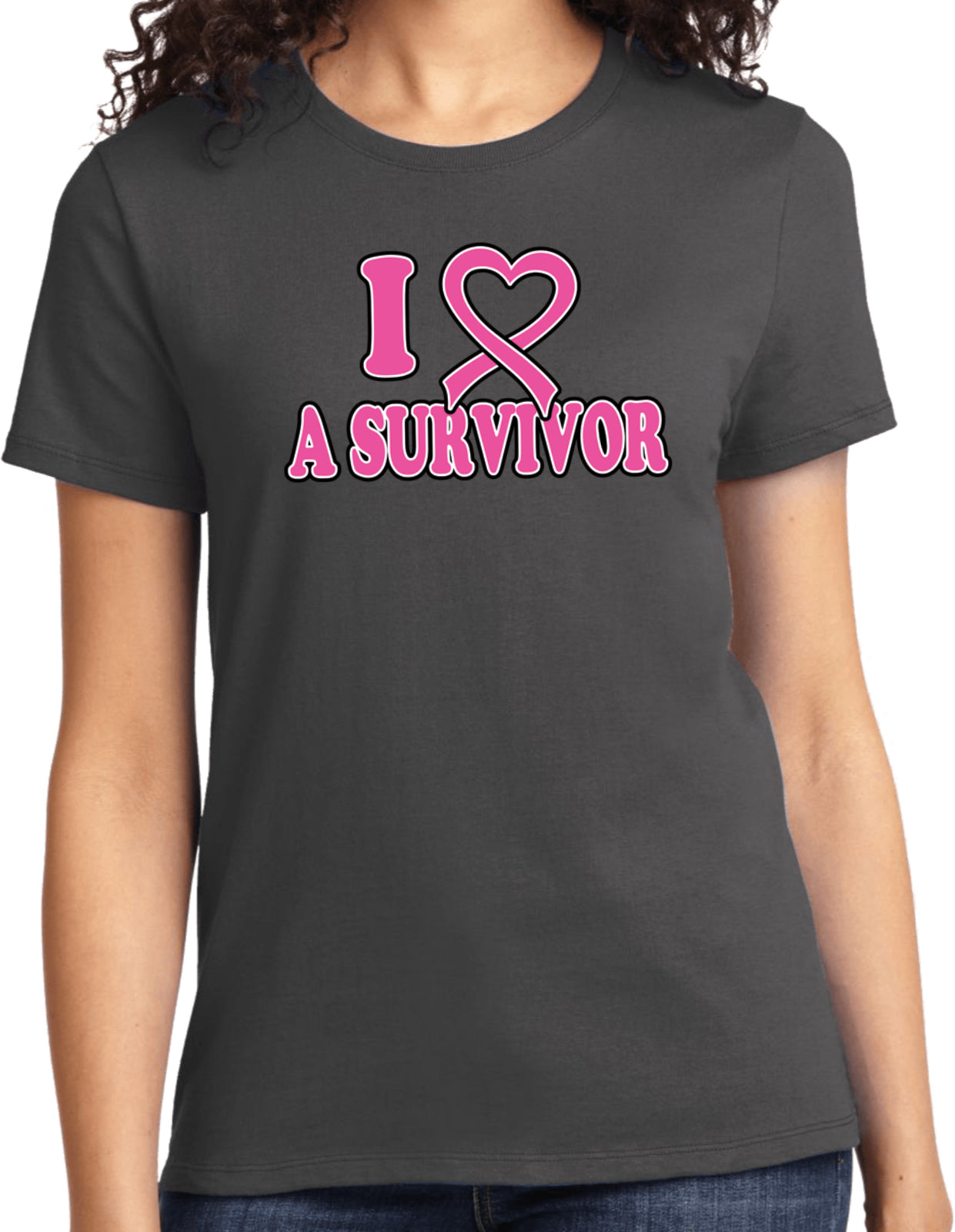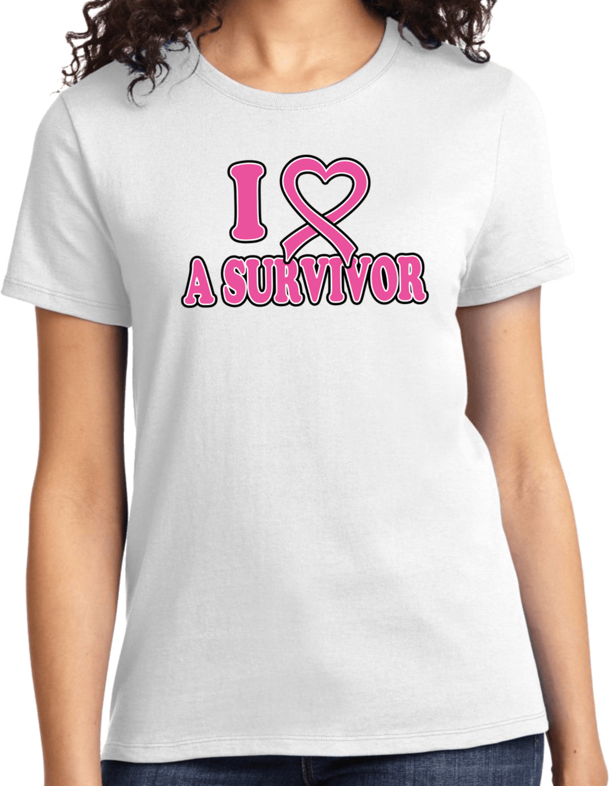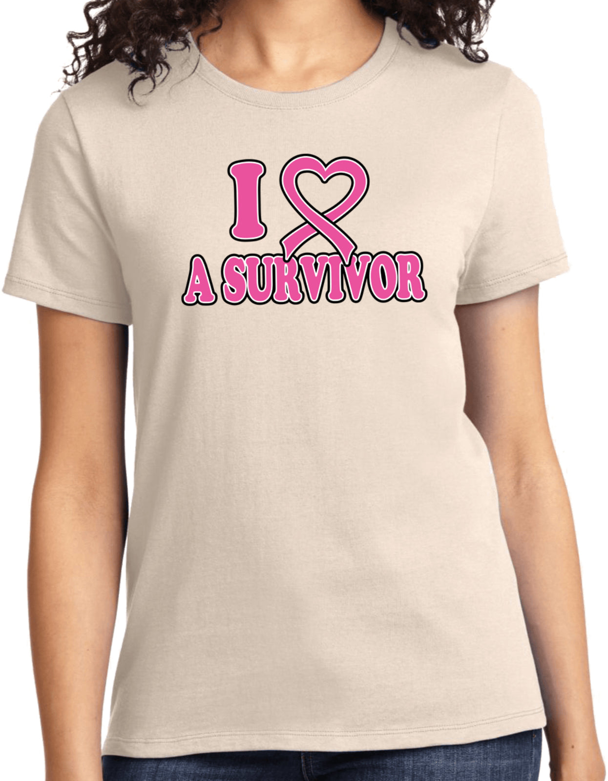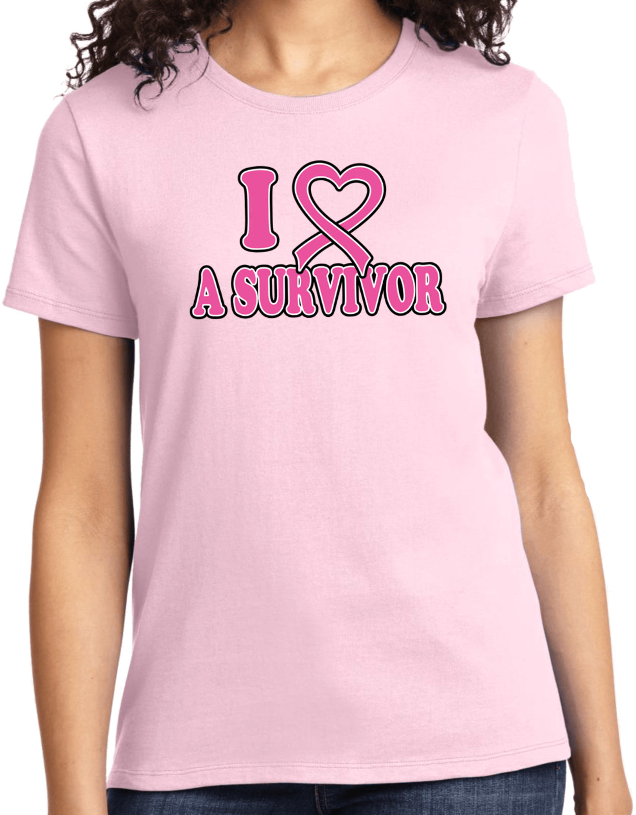 - A breast cancer awareness ladies t-shirt featuring I Love a Survivor