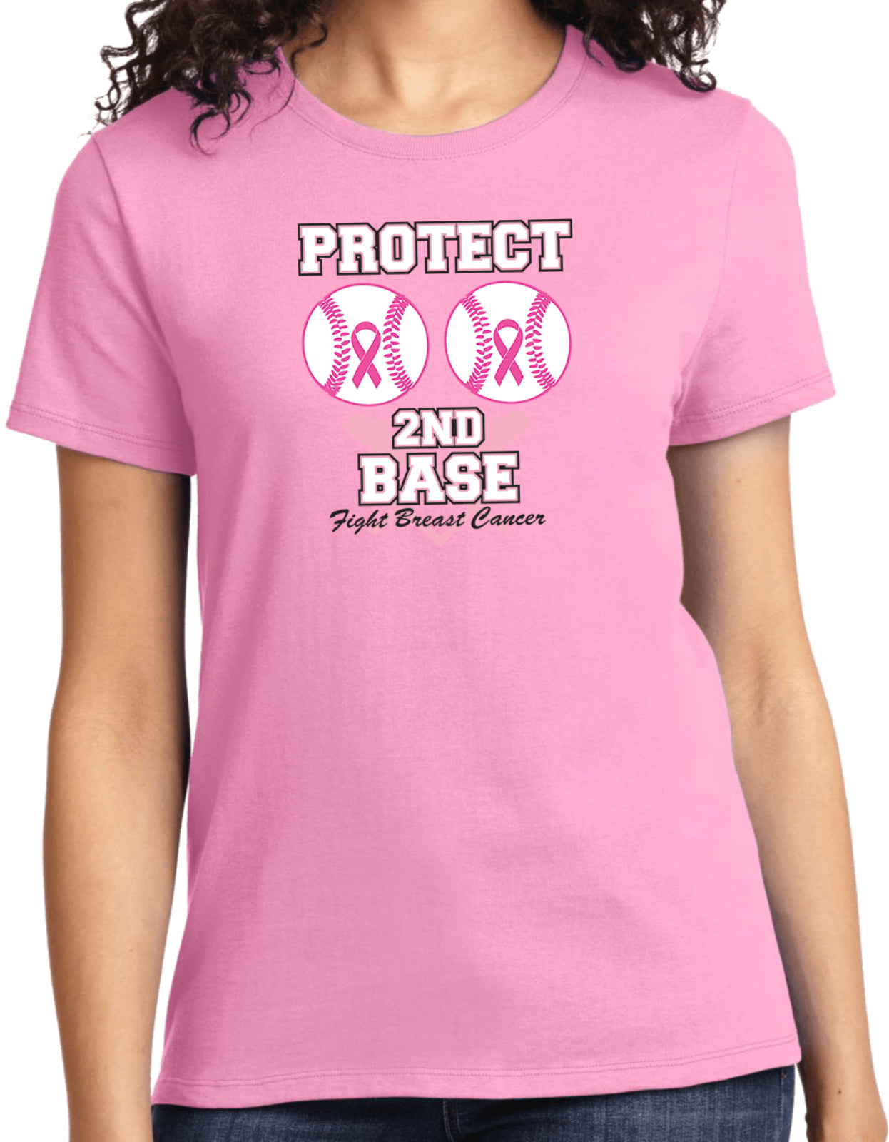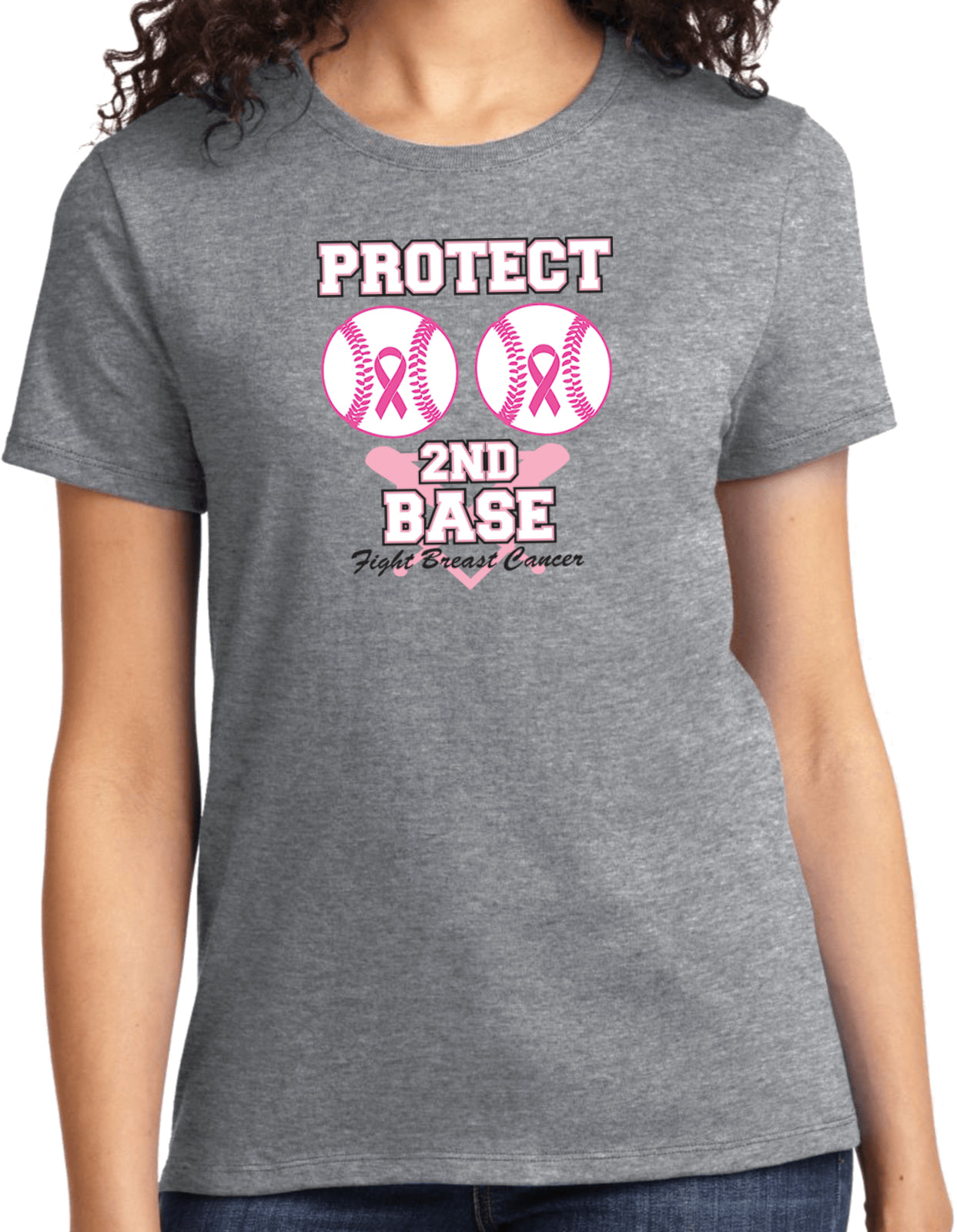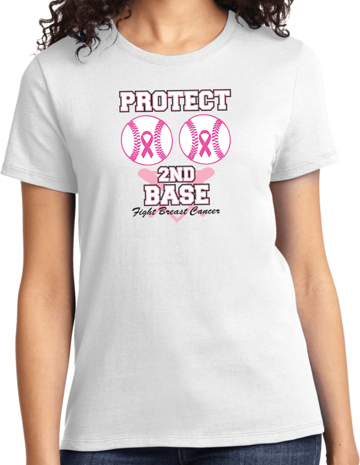 - A breast cancer ladies t-shirt featuring a baseball inspired design: Protect 2nd Base, Fight Breast Cancer