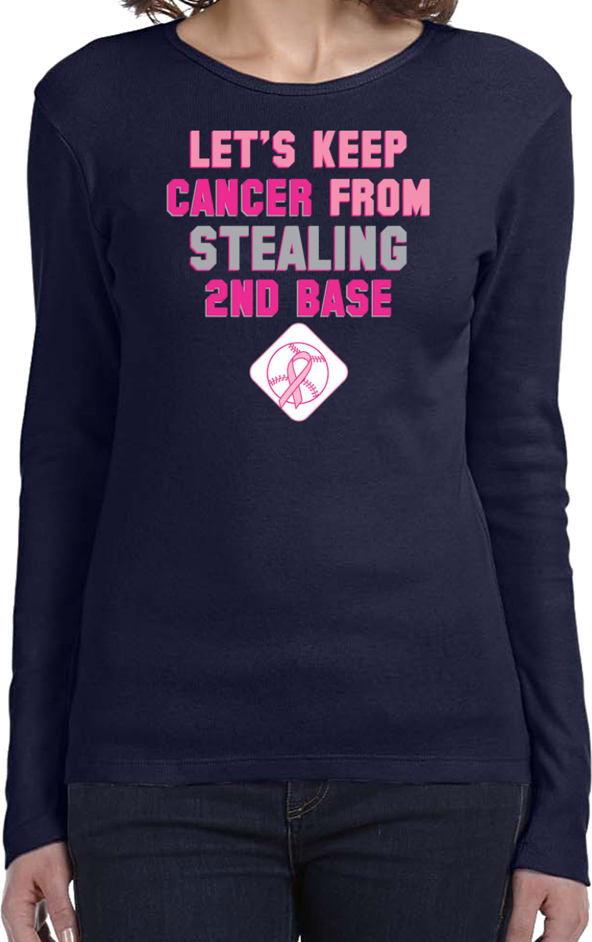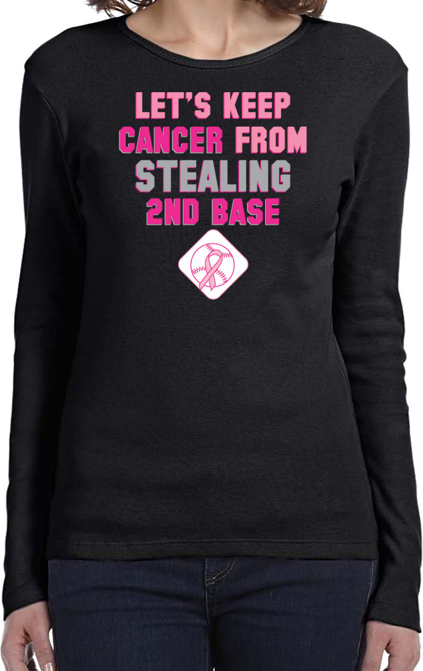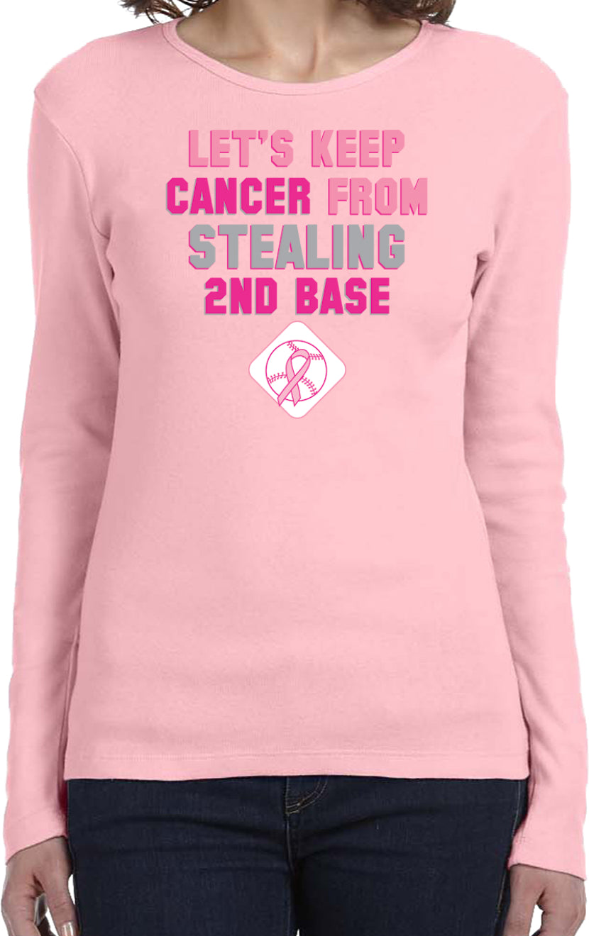 - A ladies long sleeve shirt featuring a baseball inspired breast cancer awareness design: Let's Keep Cancer From Stealing 2nd Base
