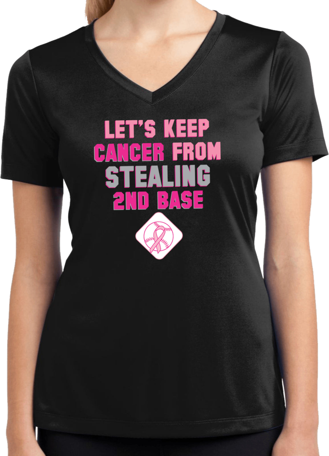 - A ladies dry wicking v-neck featuring a baseball inspired breast cancer awareness design: Let's Keep Cancer From Stealing 2nd Base
