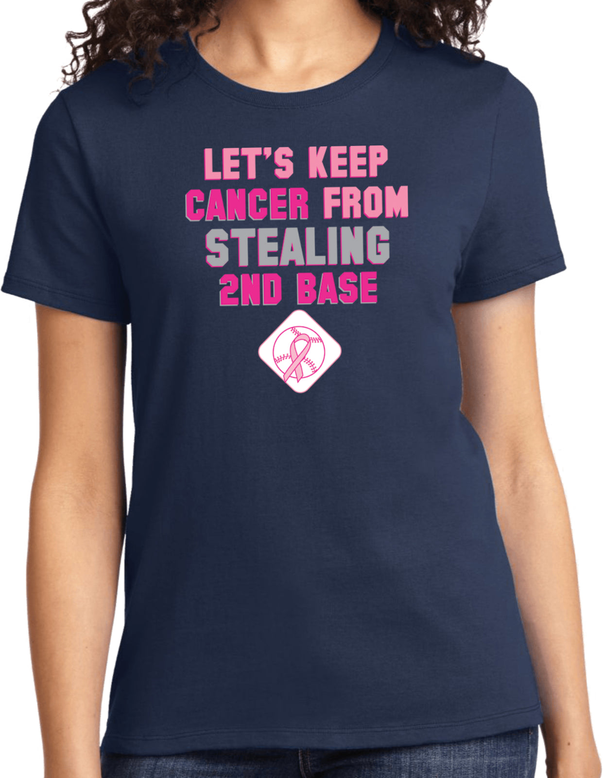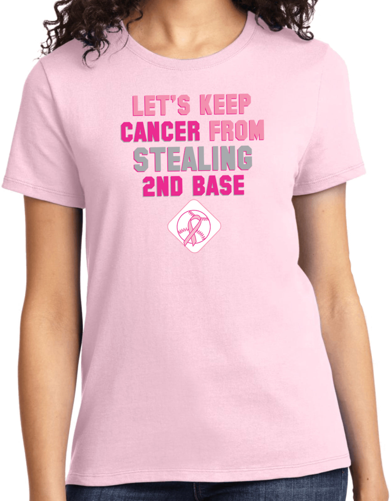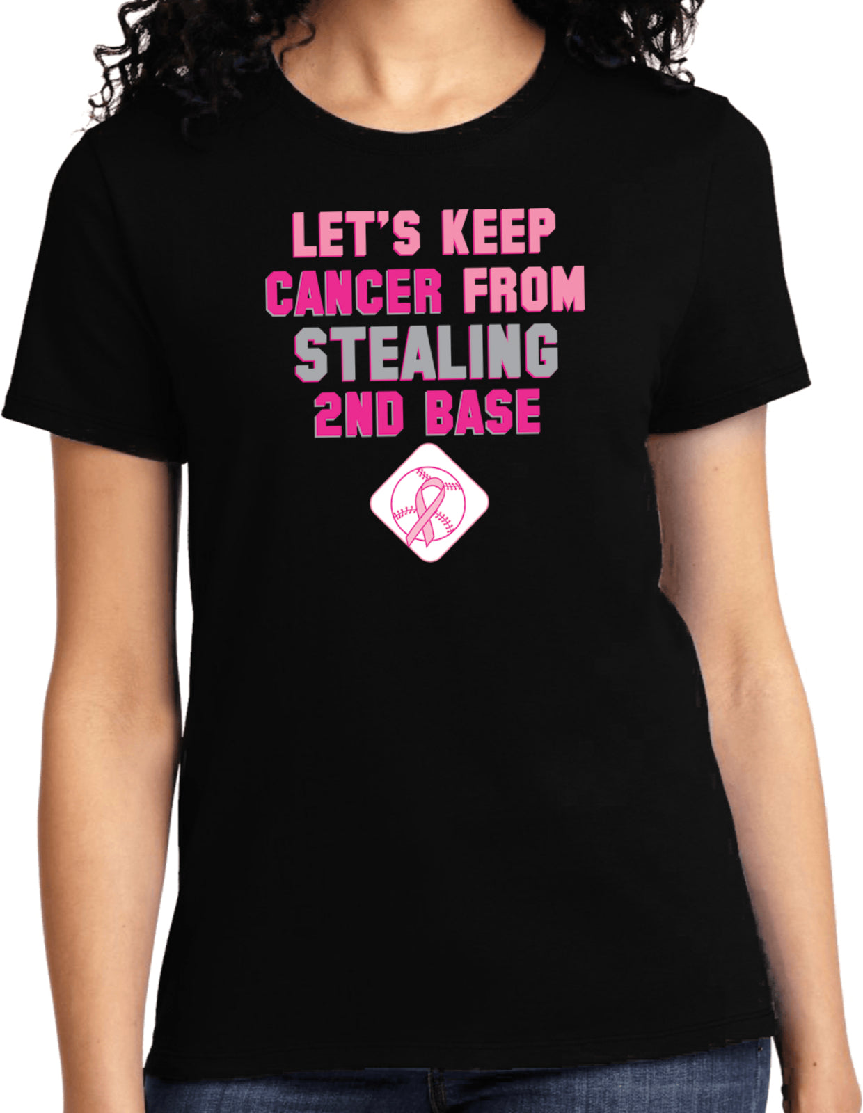 - A breast cancer ladies t-shirt featuring a baseball inspired design: Let's Keep Cancer From Stealing 2nd Base