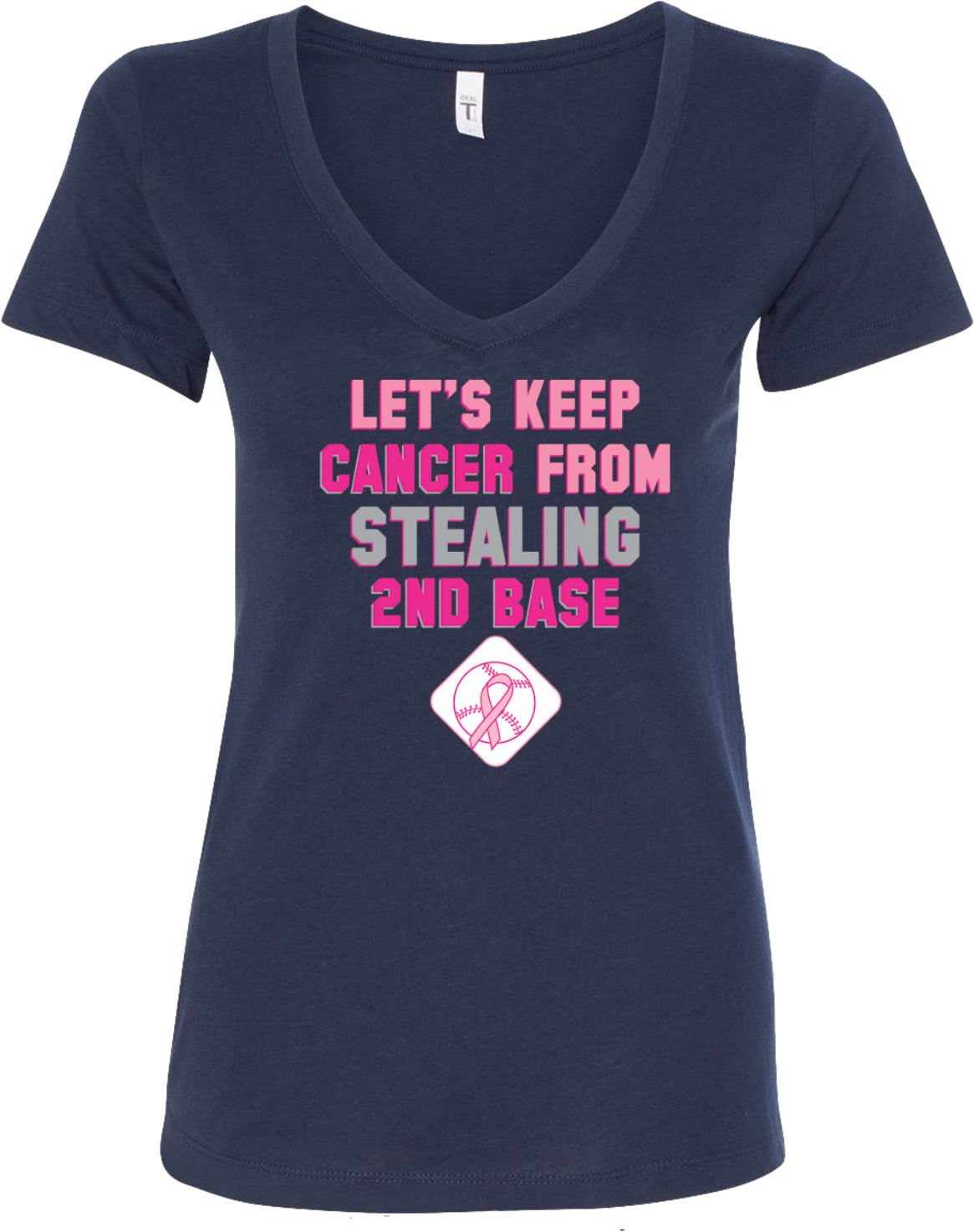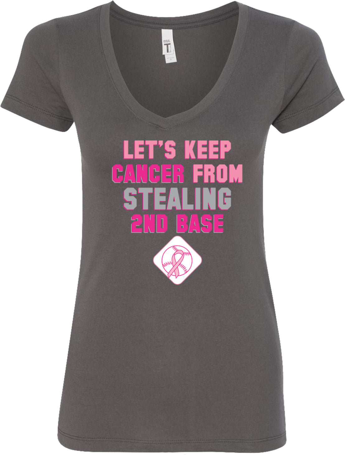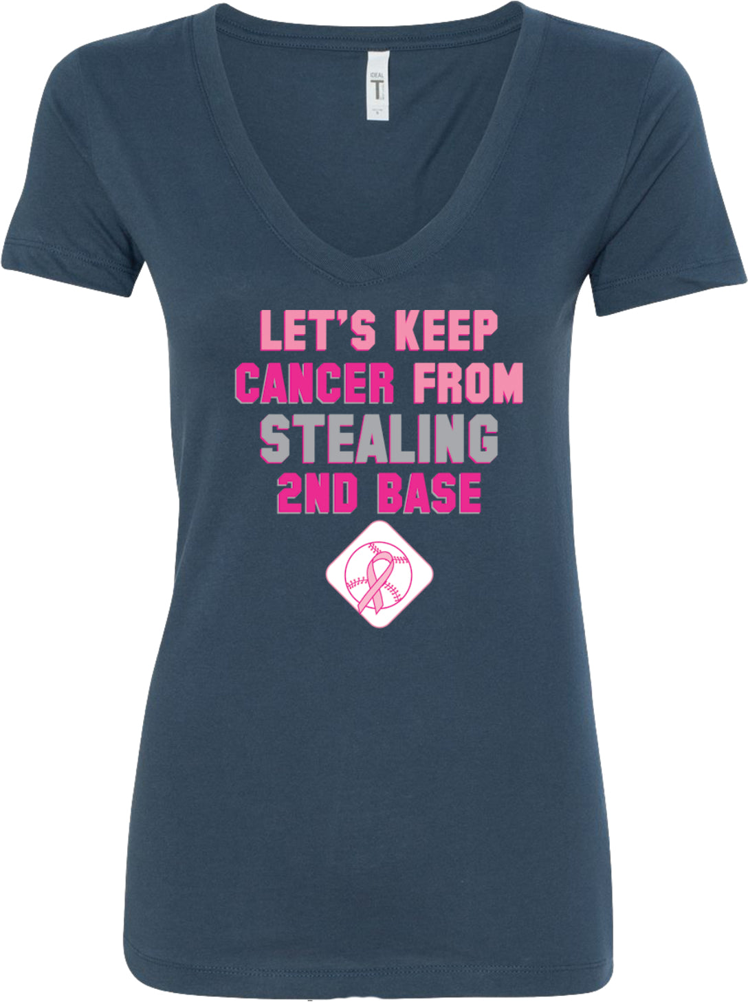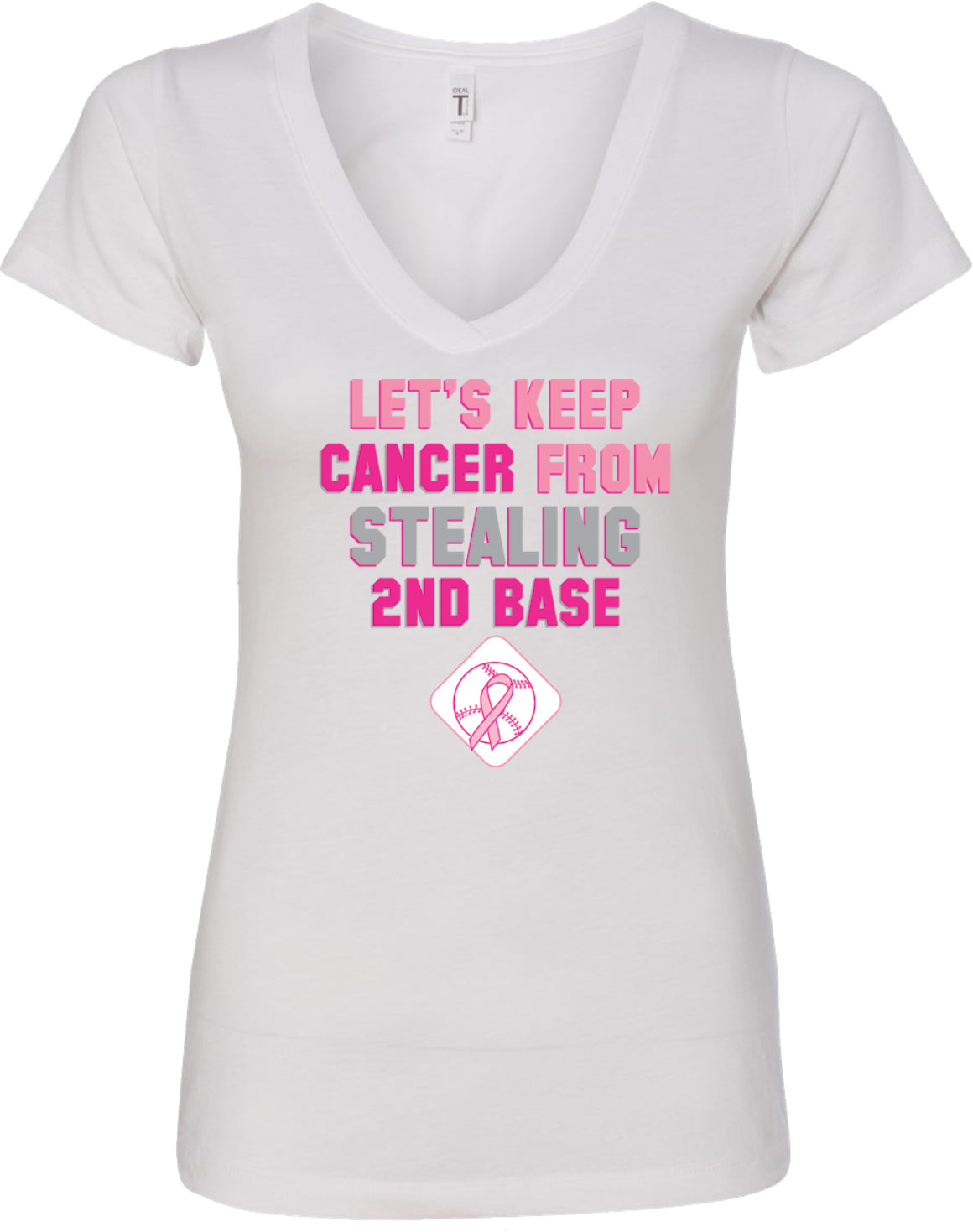 - A ladies v-neck featuring a baseball inspired breast cancer awareness design: Let's Keep Cancer From Stealing 2nd Base