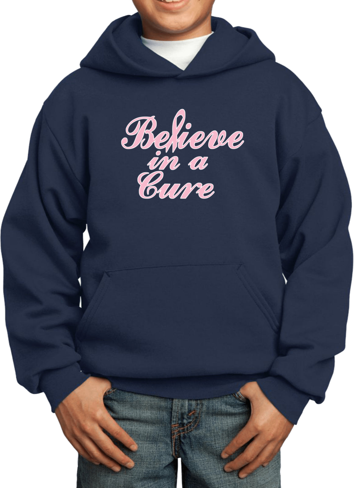 - A youth hoodie featuring a breast cancer awareness design: Believe in a Cure