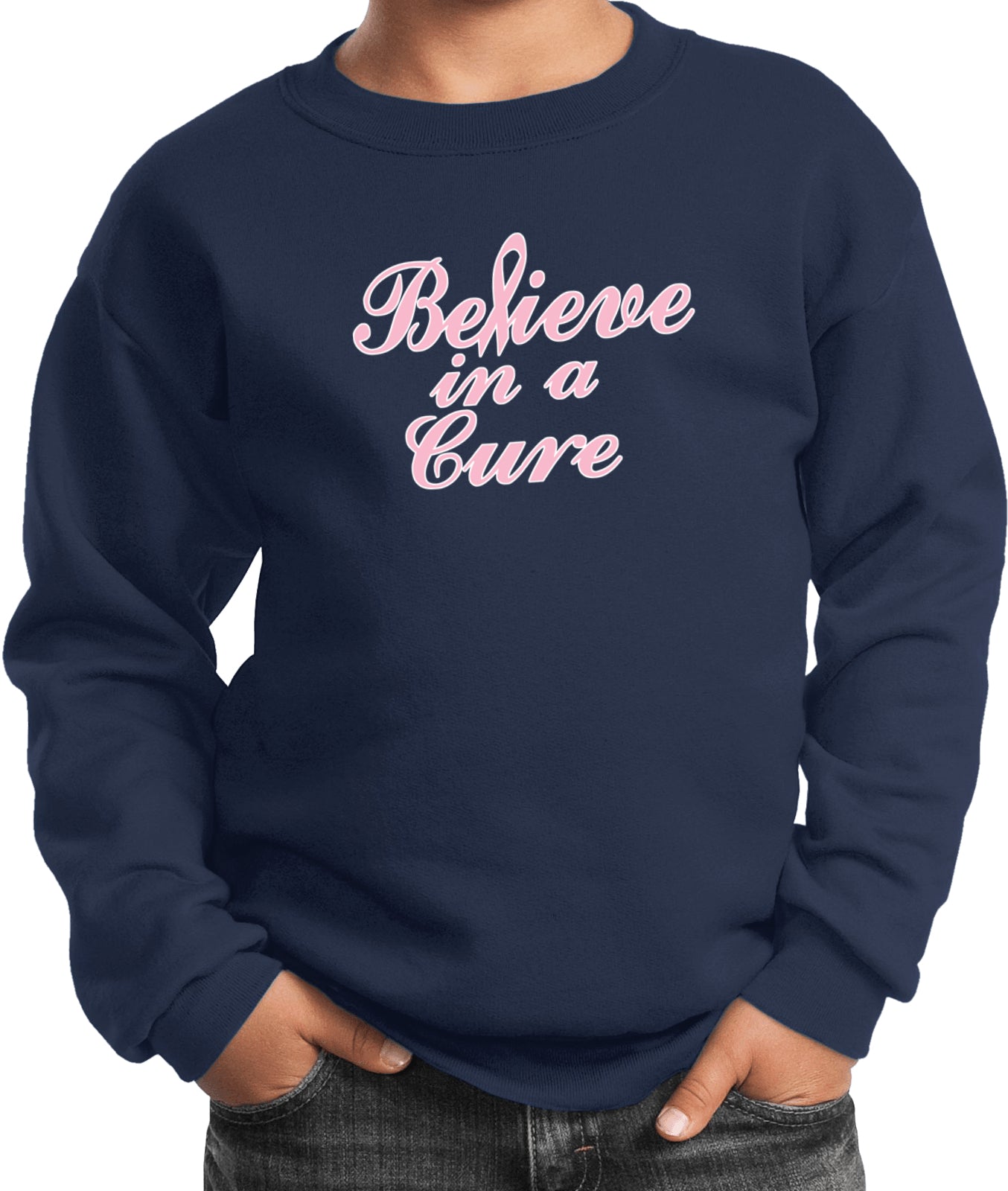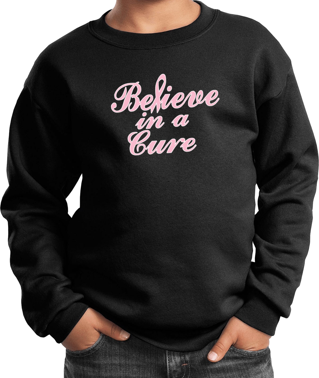 - A youth sweatshirt featuring a breast cancer awareness design: Believe in a Cure