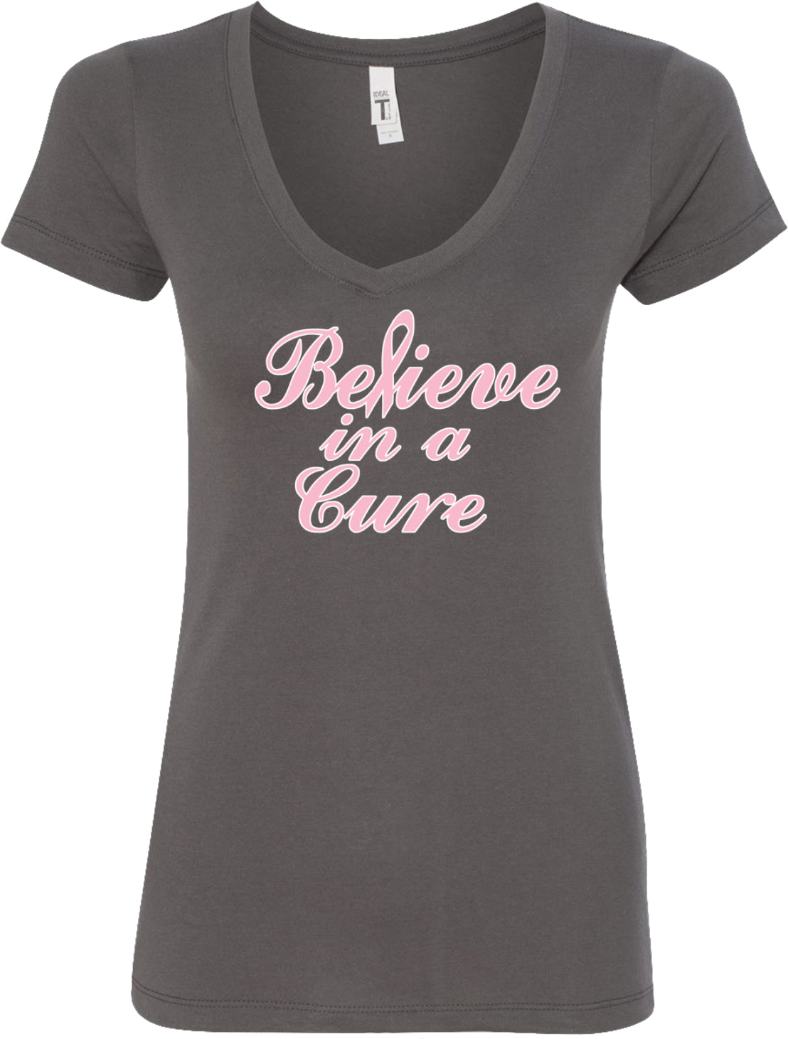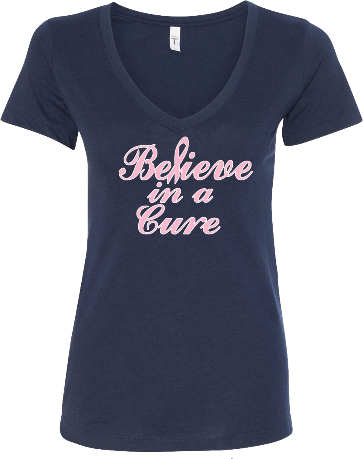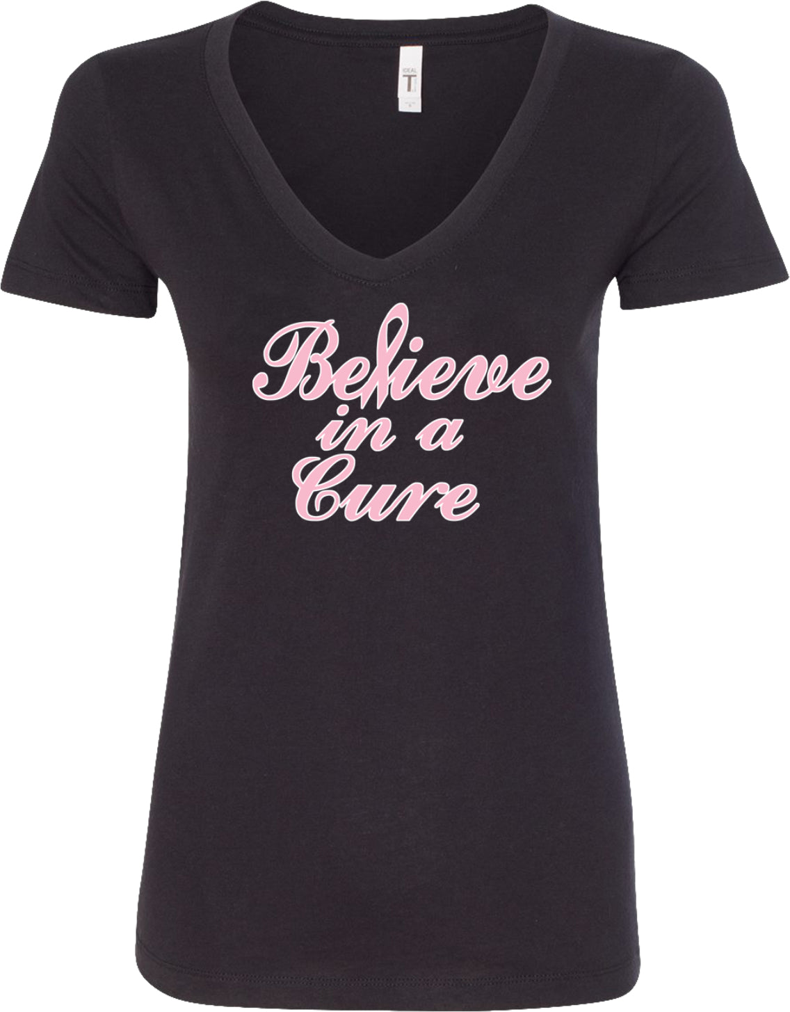 - A ladies v-neck featuring a breast cancer awareness design: Believe in a Cure