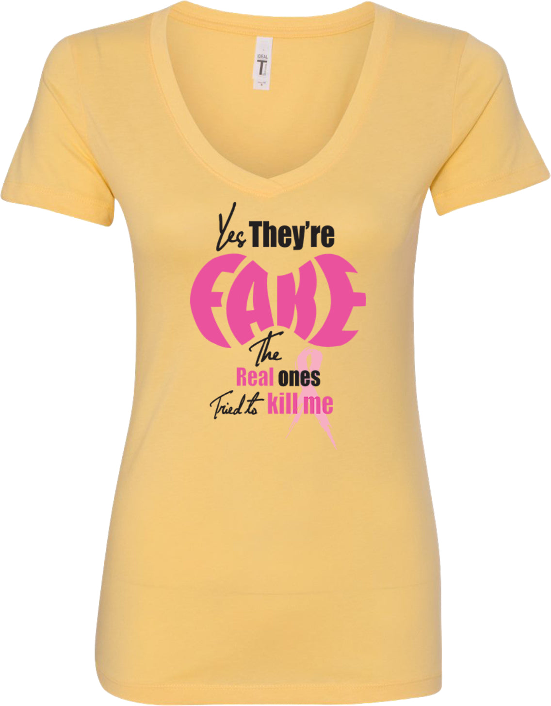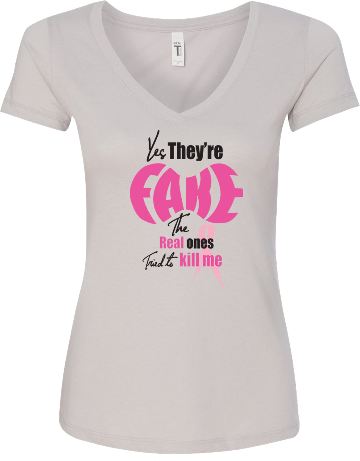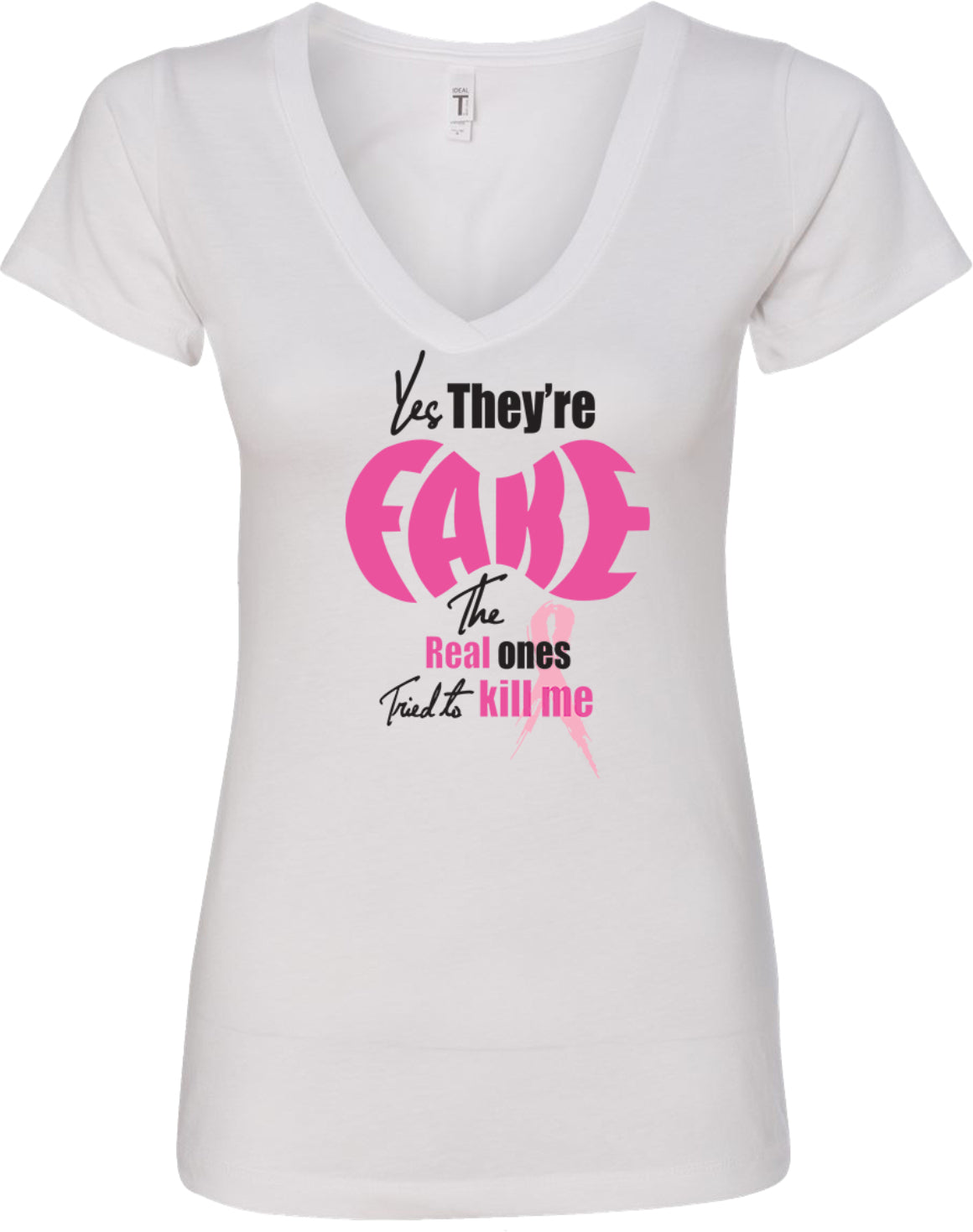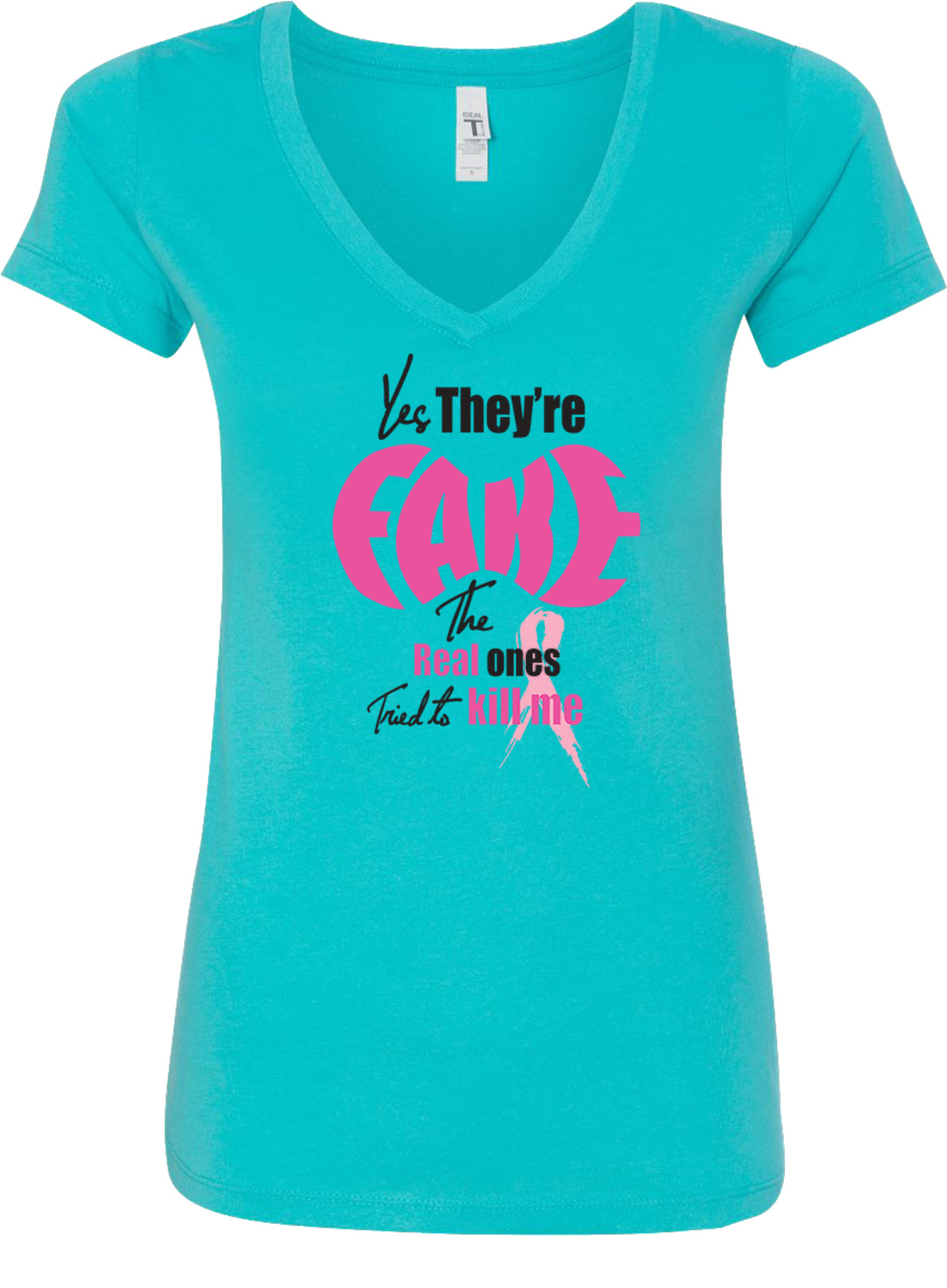 - A ladies breast cancer v-neck shirt that reads Yes They're Fake The Real Ones Tried To Kill Me