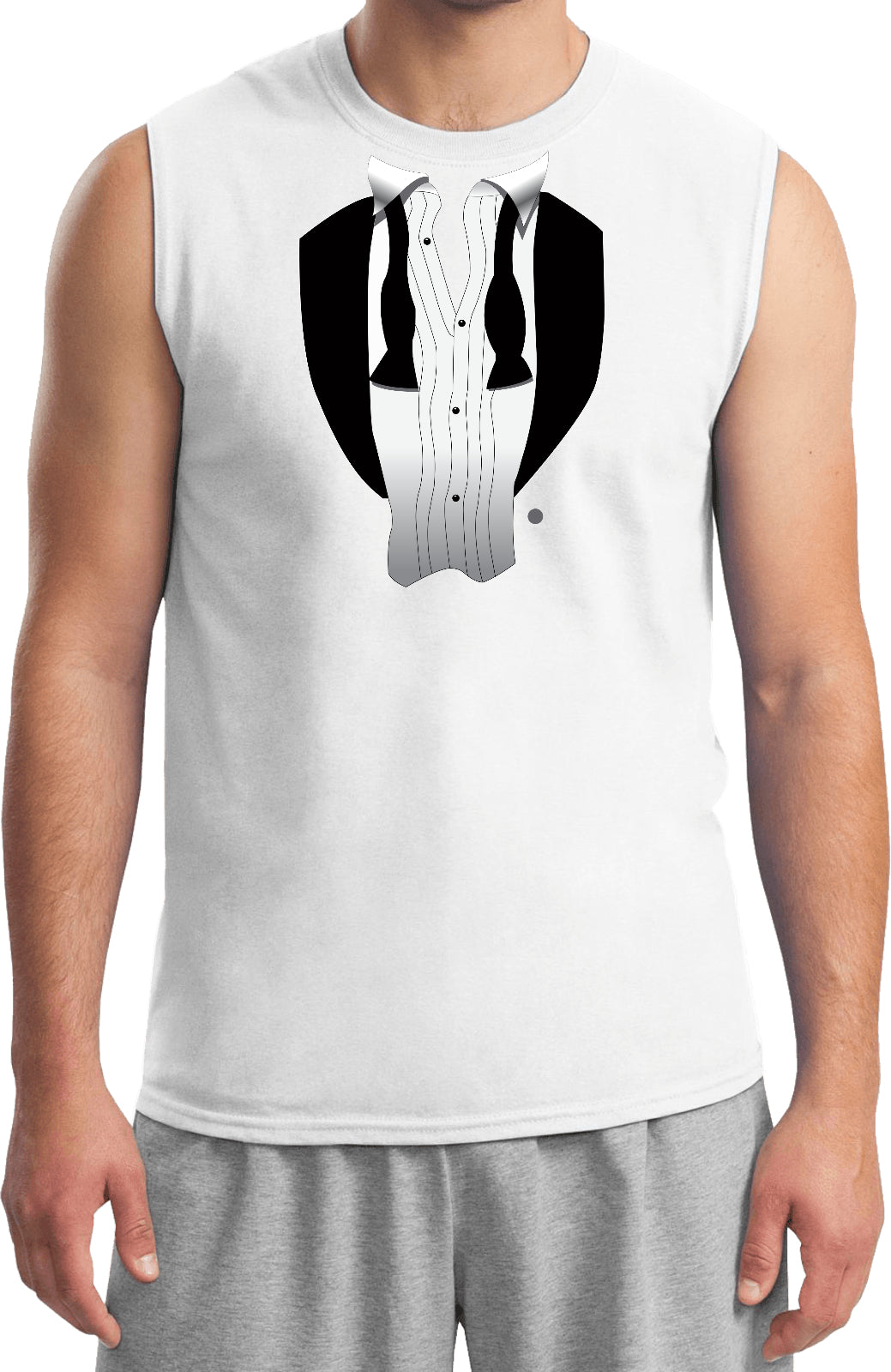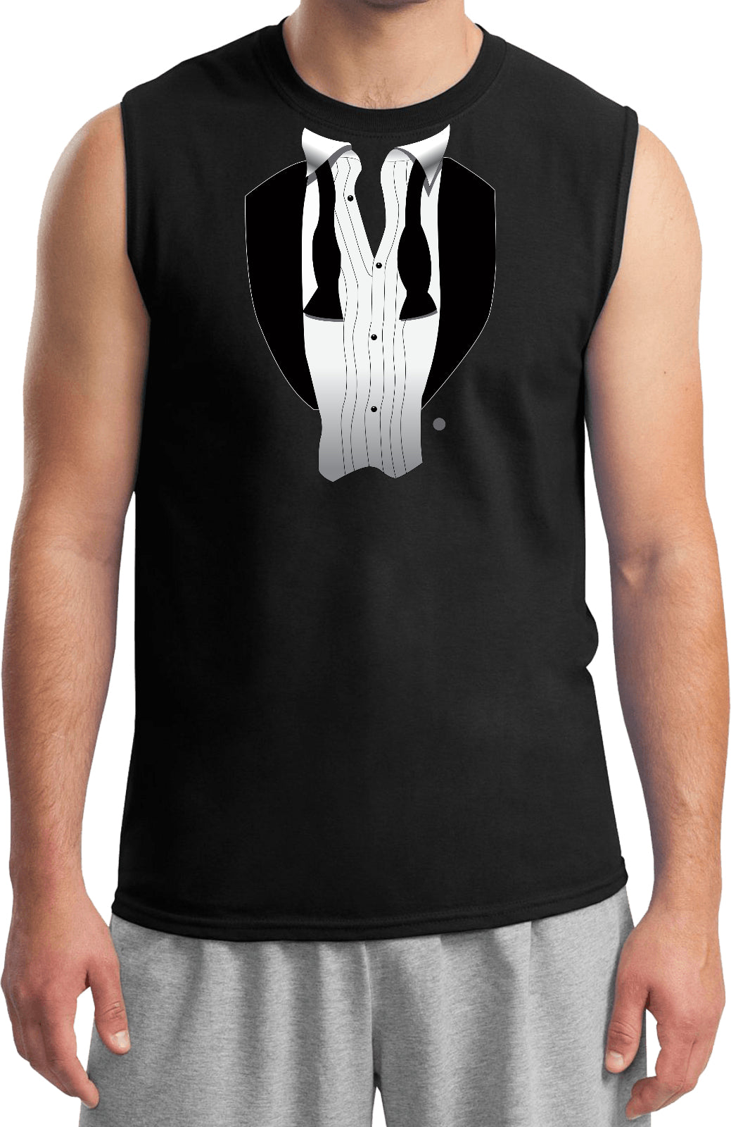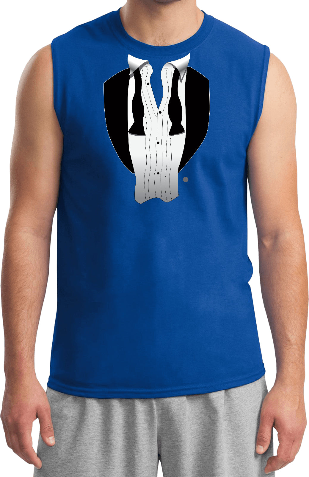• A mens sleeveless shirt featuring a funny tuxedo design