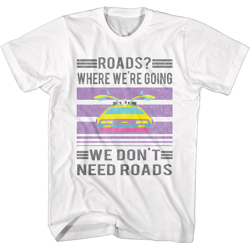 An officially licensed Back to the Future shirt that fits both men and women with its traditional silhouette. Made from comfortable 100% ringspun cotton. The t-shirt features a retro design with Doc Brown's famous quote: Roads? Where We're Going, We Don't Need Roads. Back to the Future is a classic 1985 American science fiction film. This shirt makes the perfect gift for fans of the movie.