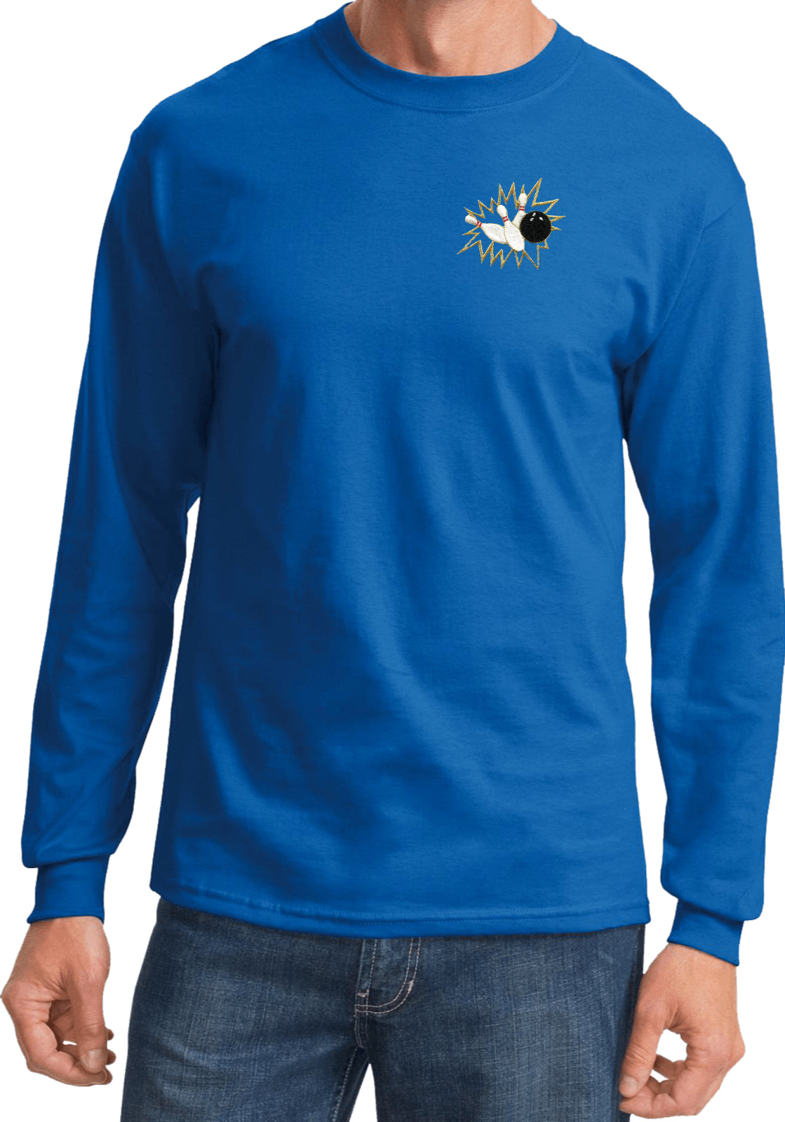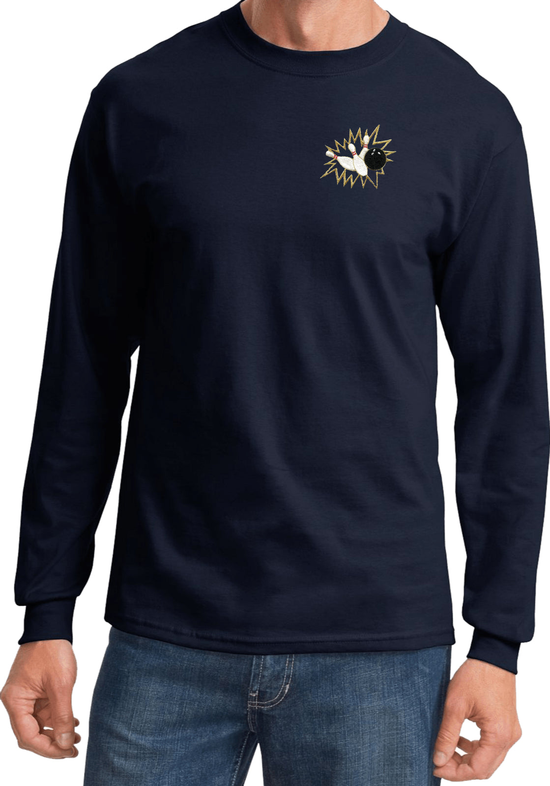 - A long sleeve shirt featuring a cool bowling pins patch as a pocket print