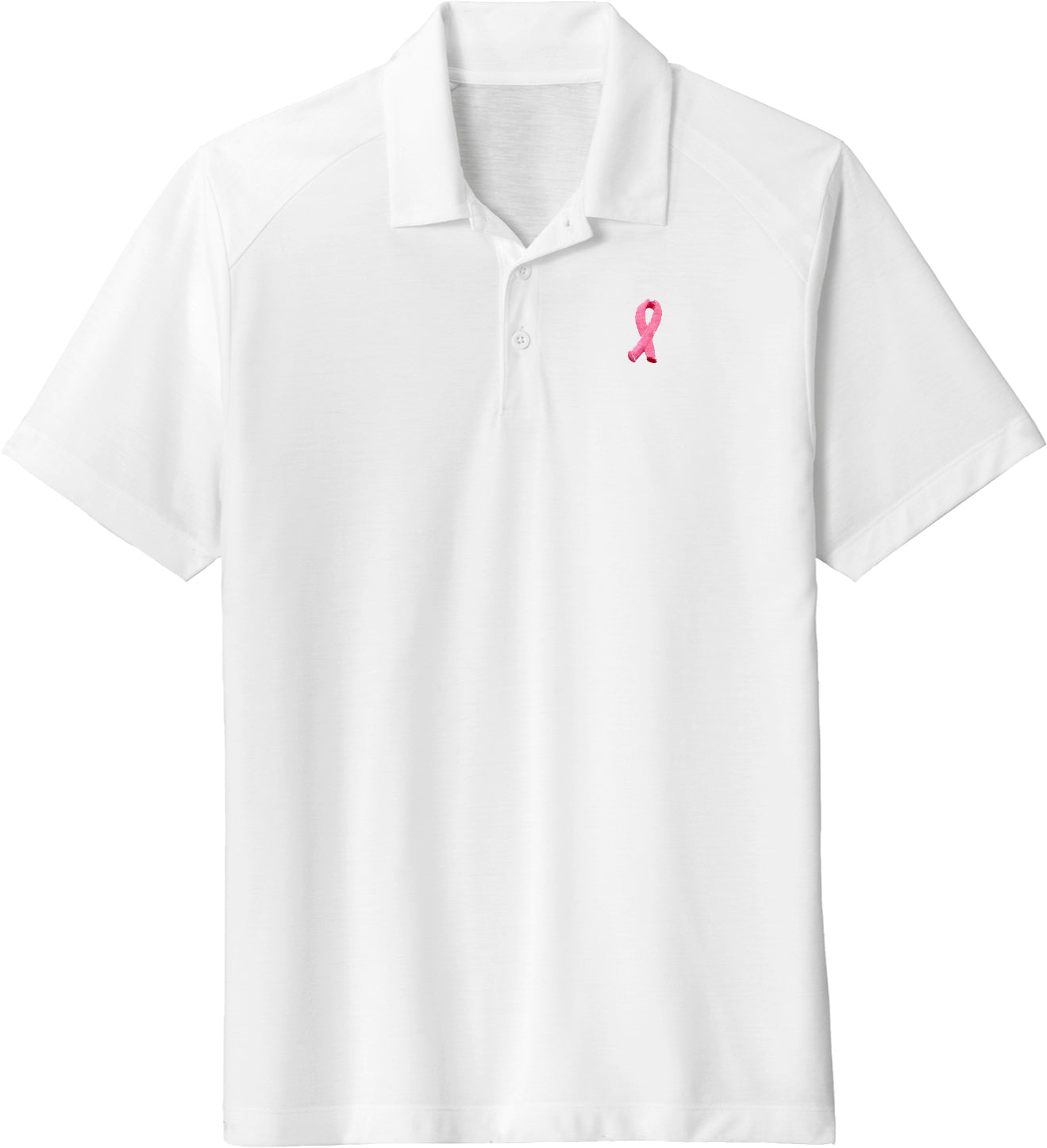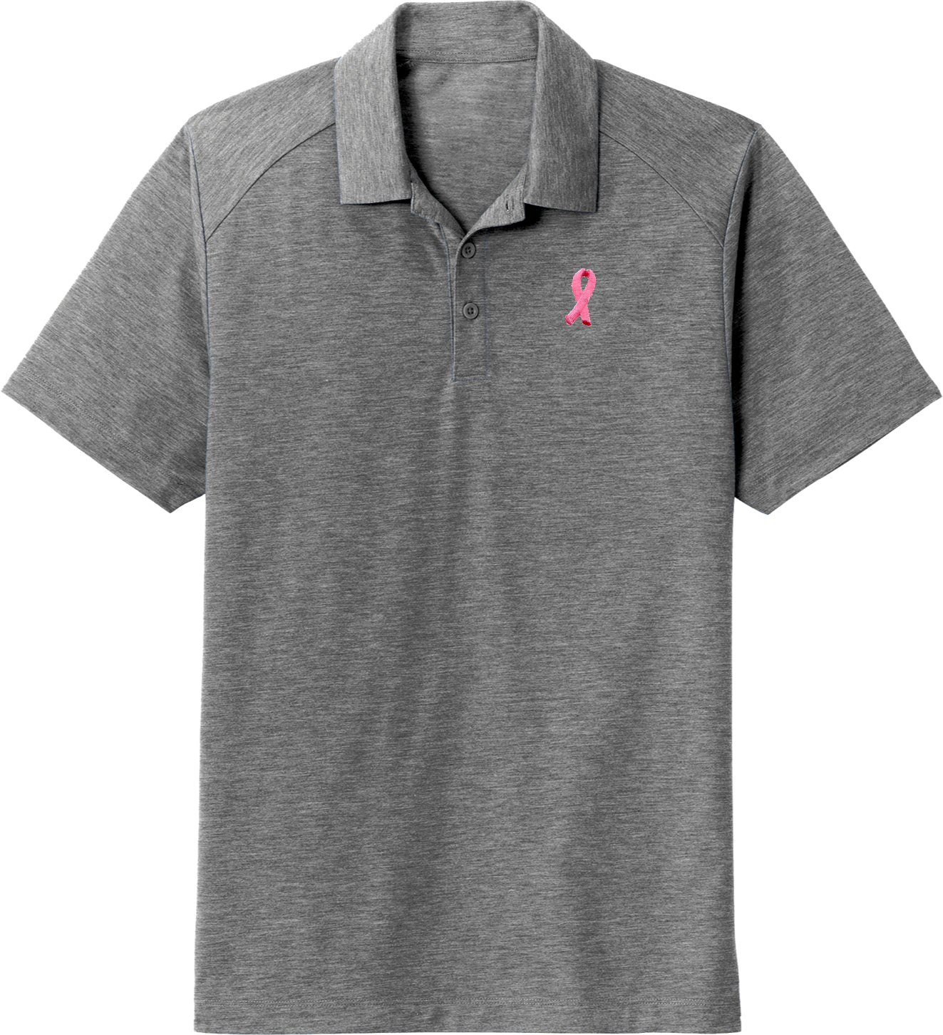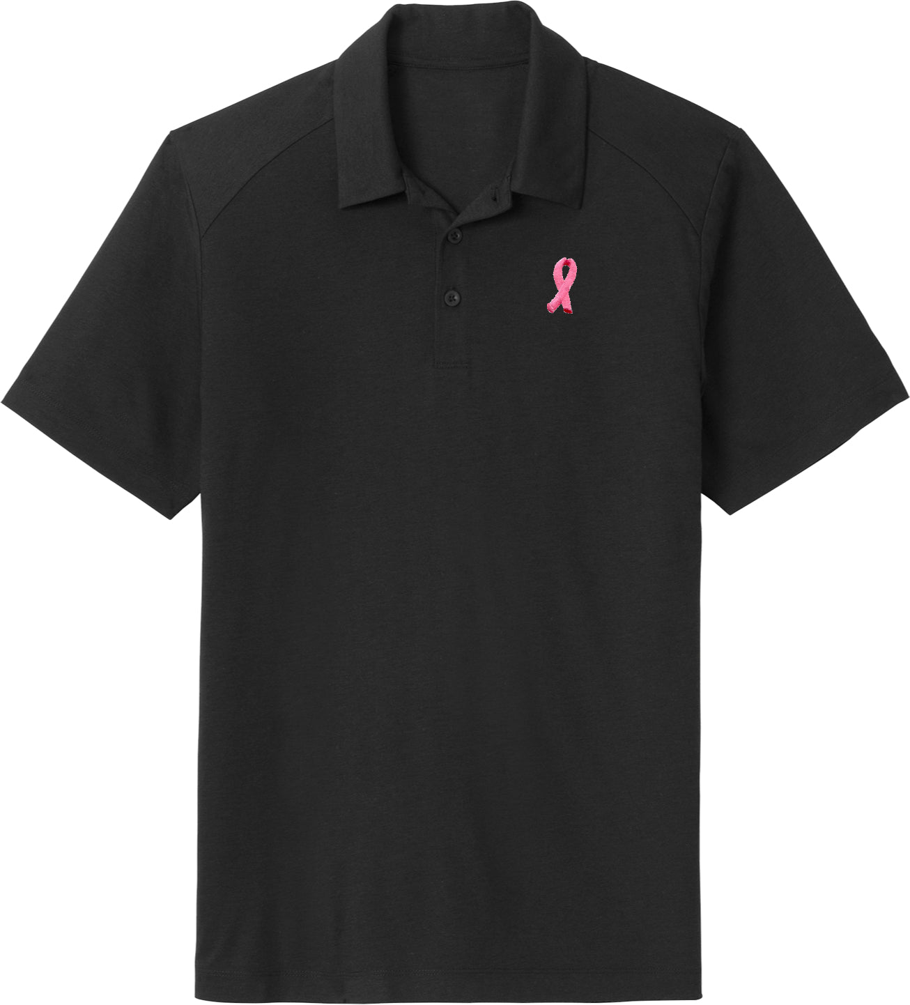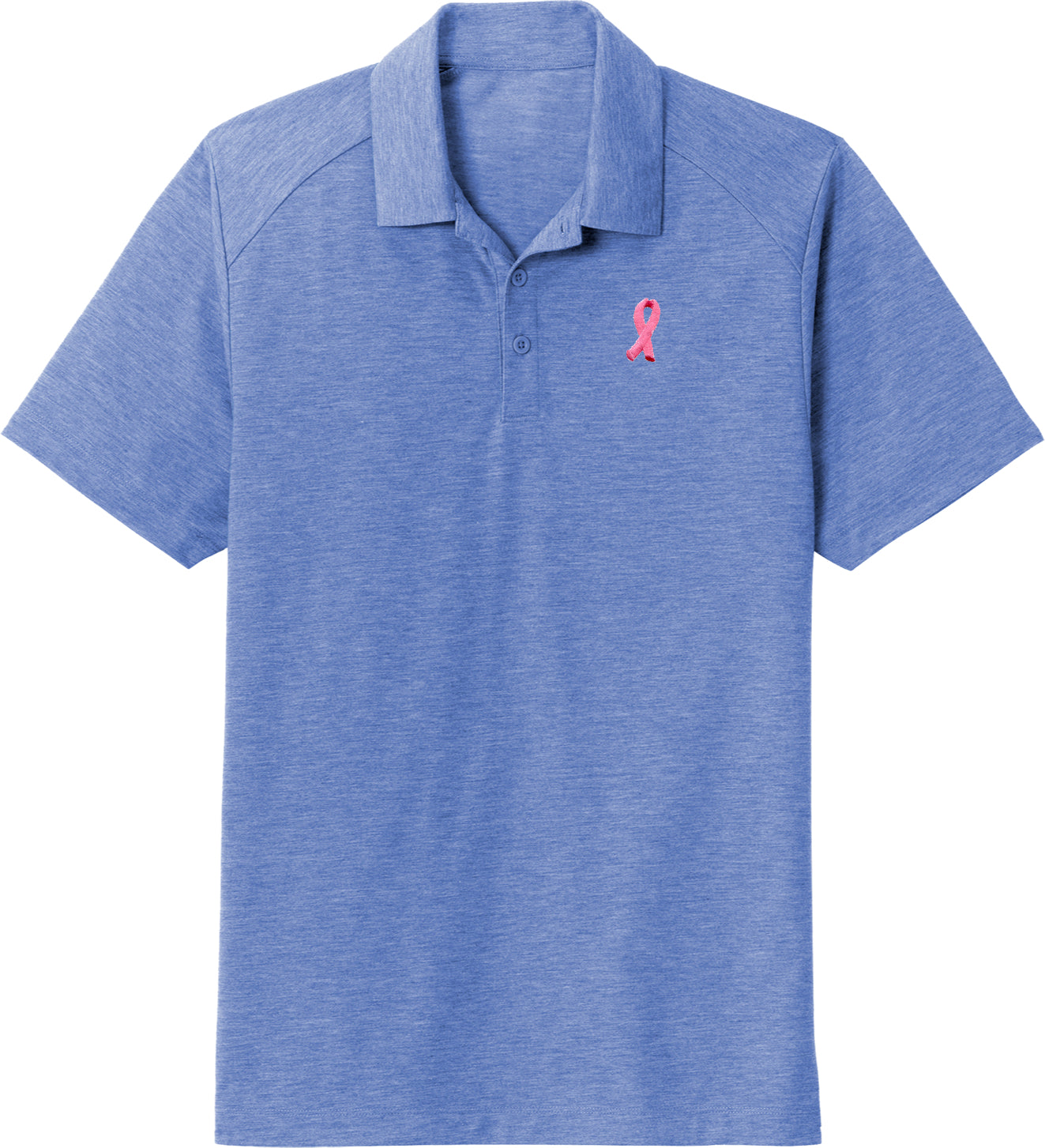 - A mens tri blend polo shirt featuring an embroidered pink ribbon