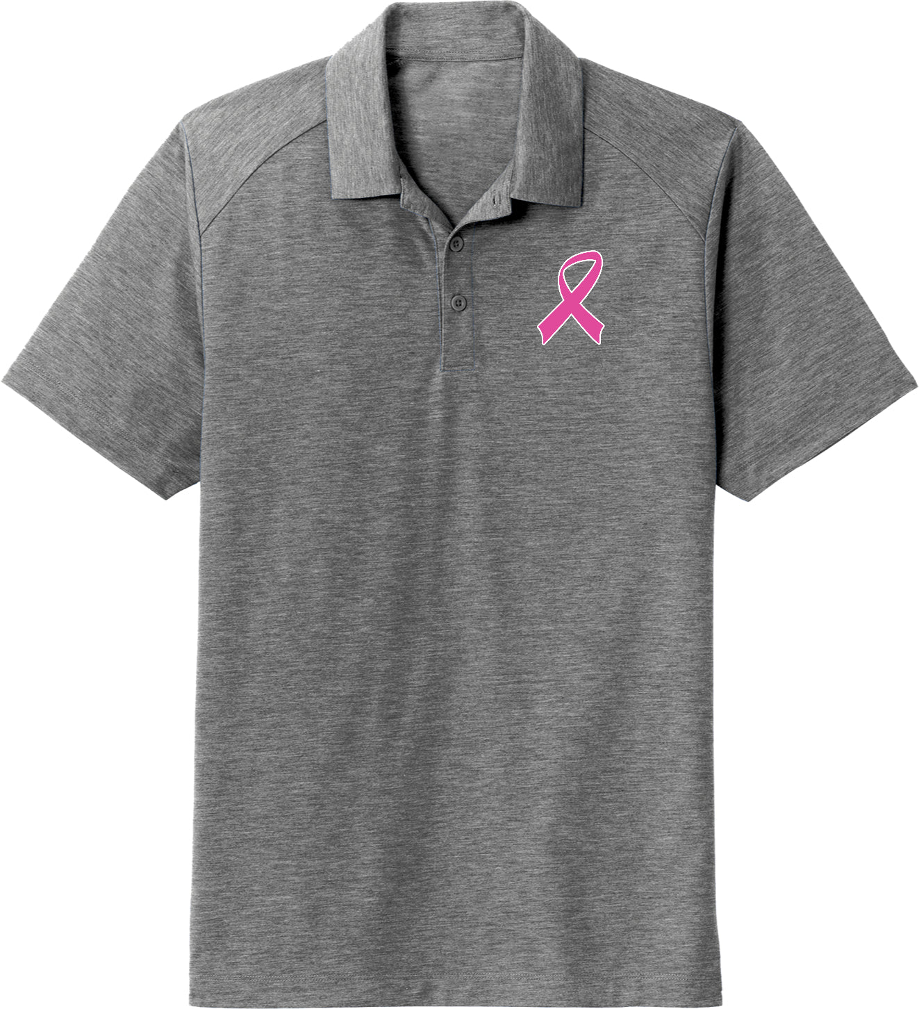 - A mens breast cancer awareness tri blend polo shirt featuring a pink ribbon