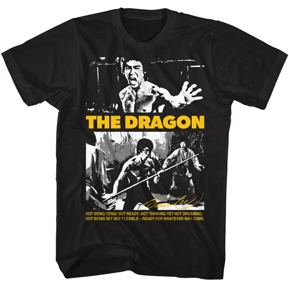 An officially licensed Bruce Lee shirt that fits both men and women with its traditional silhouette. Made from comfortable 100% ring spun cotton. The t-shirt features The Dragon with the quote: Not Being Tense but Ready; Not Thinking Yet Not Dreaming; Not Being Set But Flexible - Ready for Whatever May Come. This t-shirt makes the perfect gift for fans of the great martial artist and actor.