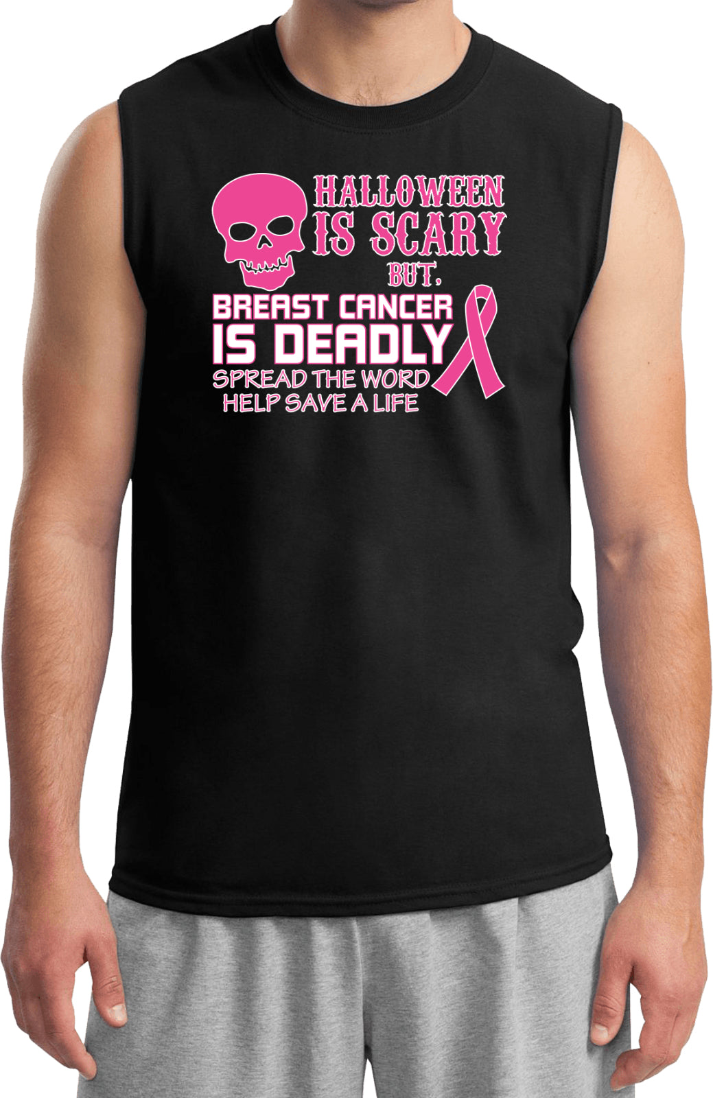 - A breast cancer sleeveless shirt featuring Halloween is Scary but, Breast Cancer is Deadly Spread The Word Help Save a Life