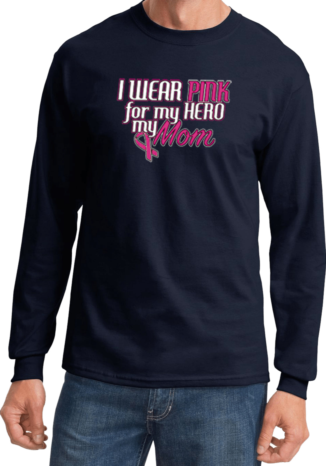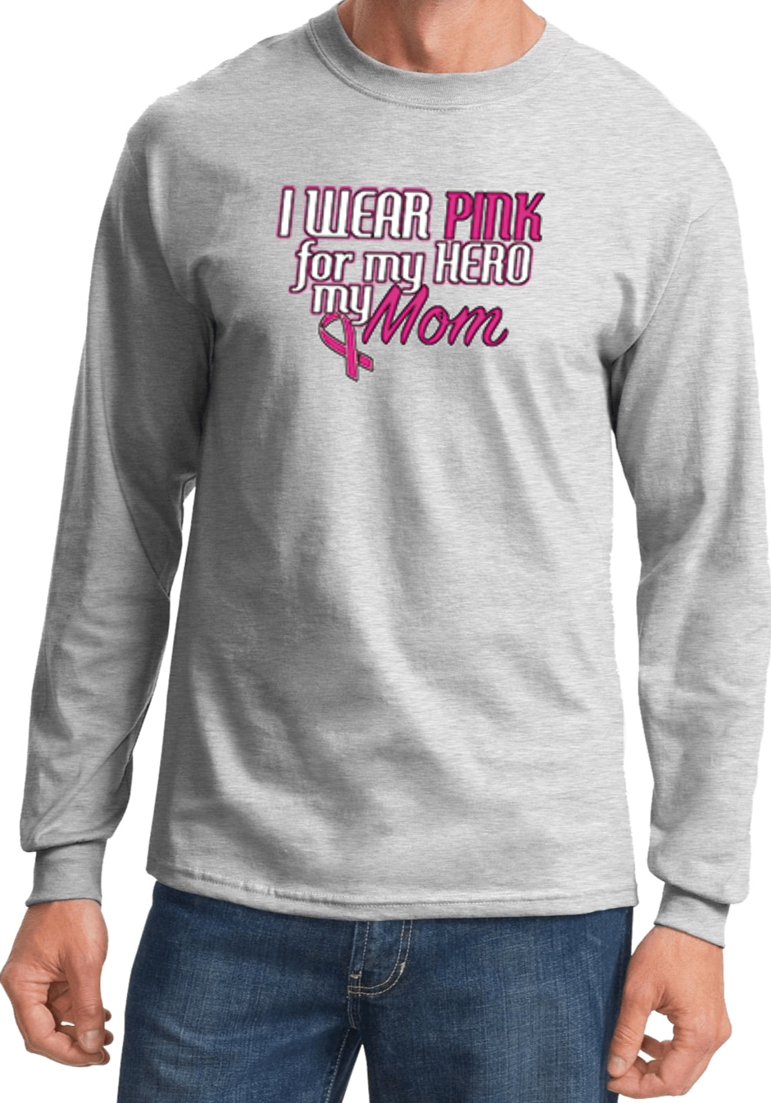 - A breast cancer long sleeve shirt featuring I Wear Pink For My Hero, My Mom