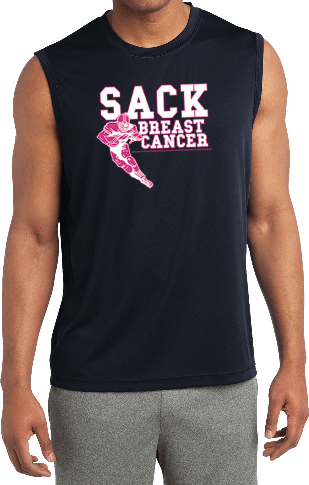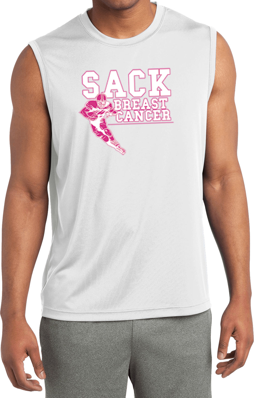 - A mens dry wicking muscle shirt featuring a football inspired breast cancer awareness design, Sack Breast Cancer