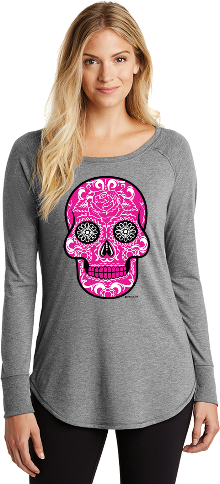 - A ladies tri blend long sleeve featuring a pink sugar skull
