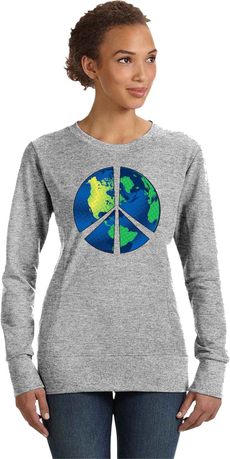 - A ladies lightweight sweatshirt featuring a blue peace earth symbol