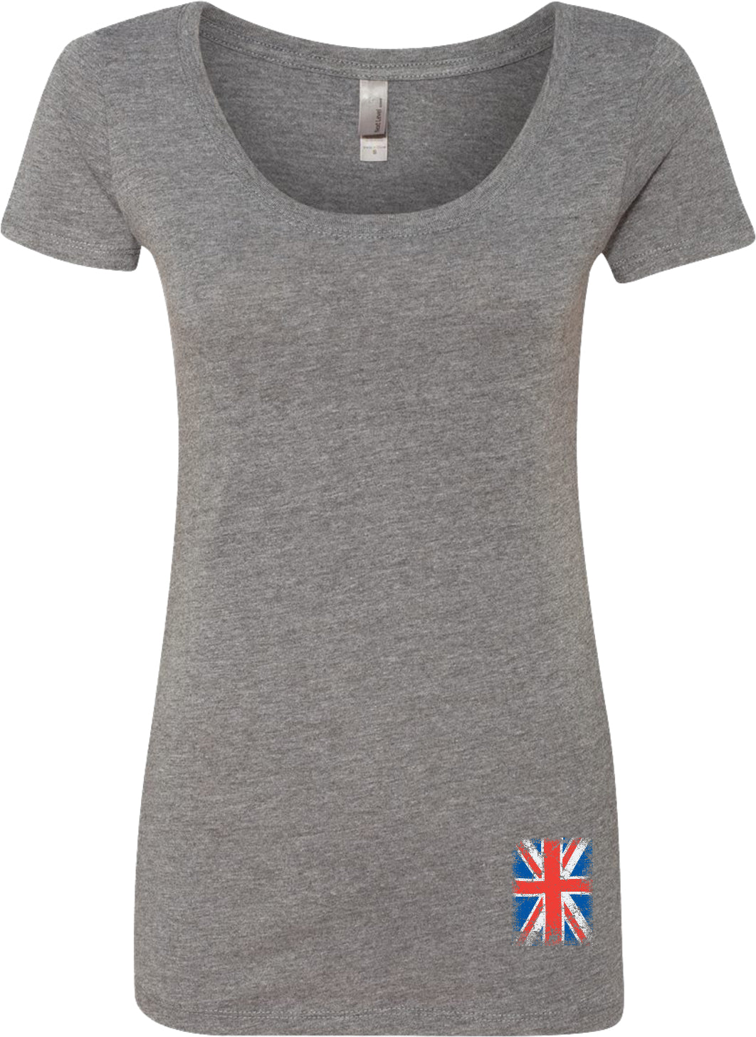 - A ladies scoop neck shirt featuring a Union Jack Flag at the bottom
