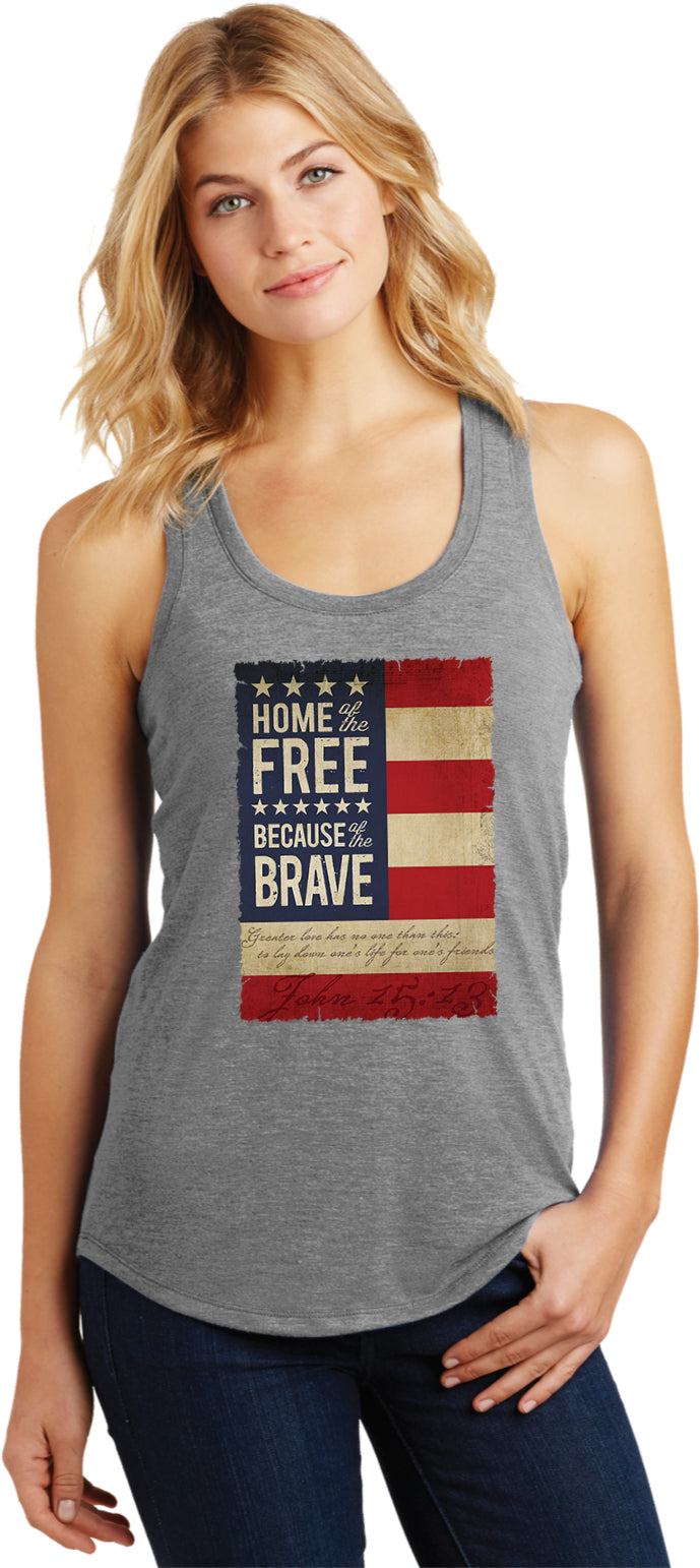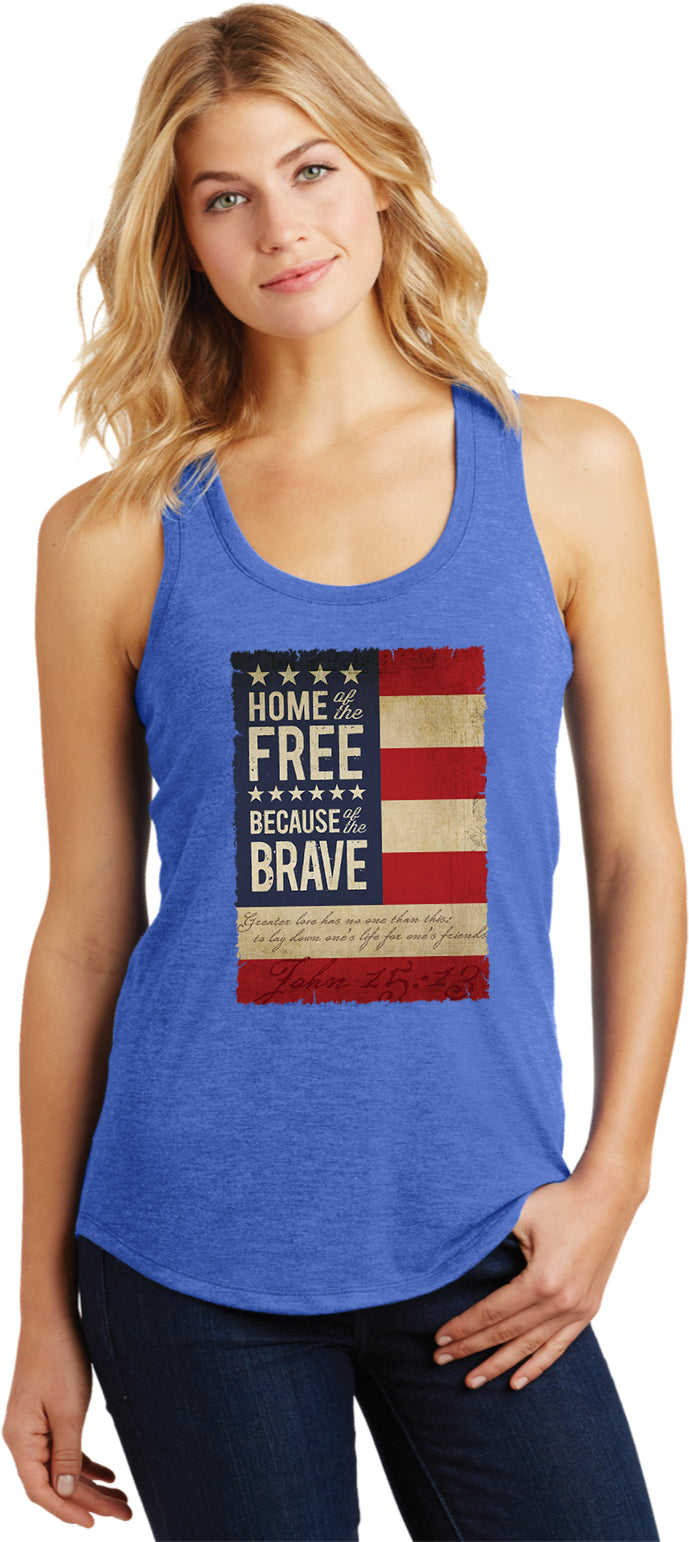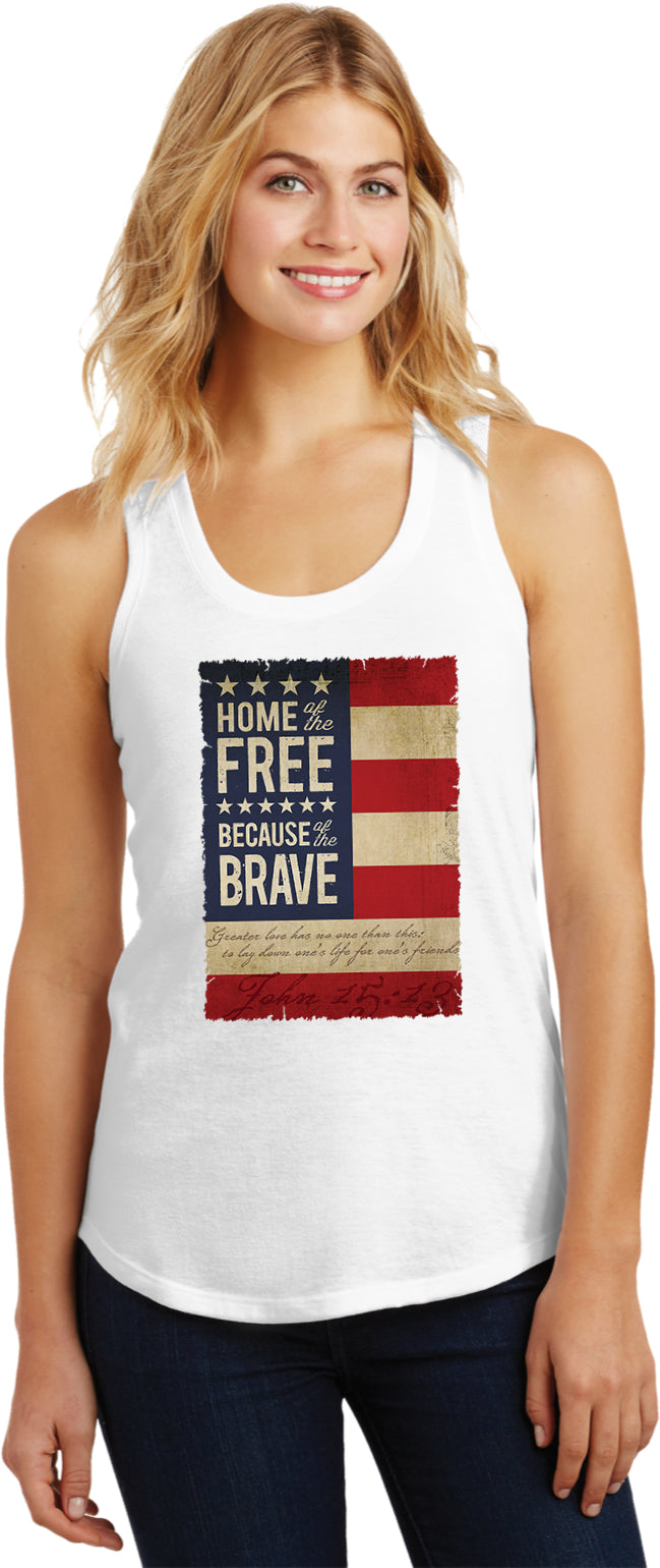 - A ladies racerback featuring Home of the Free Because of the Brave