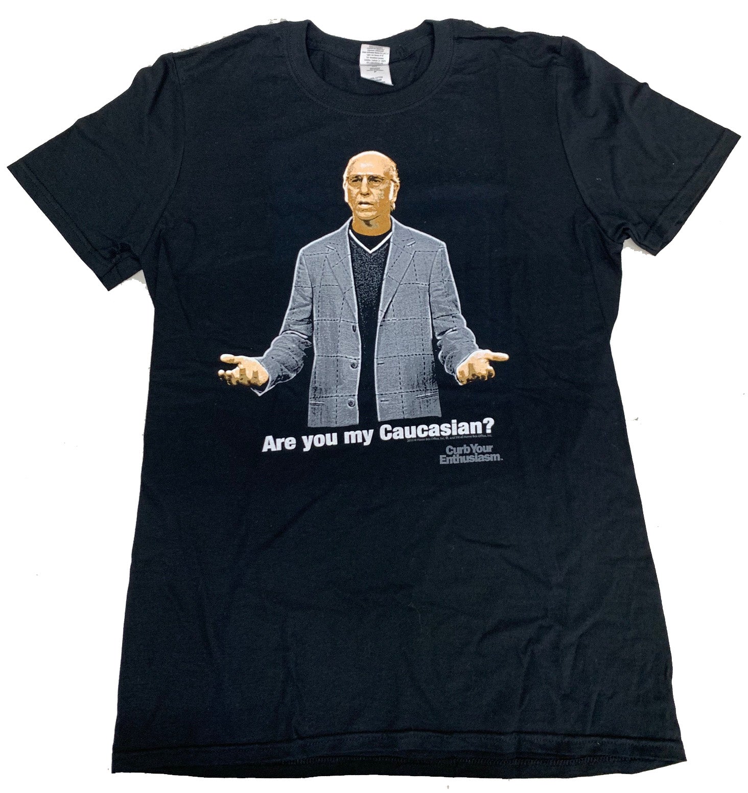 - A Curb Your Enthusiasm T-shirt featuring Larry David with his popular quote: Are you my Caucasian?