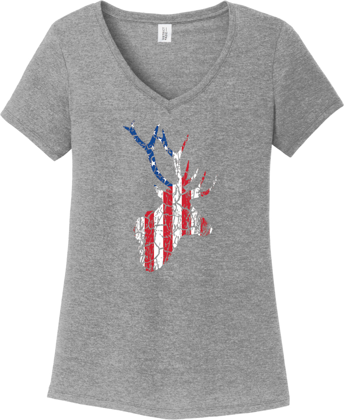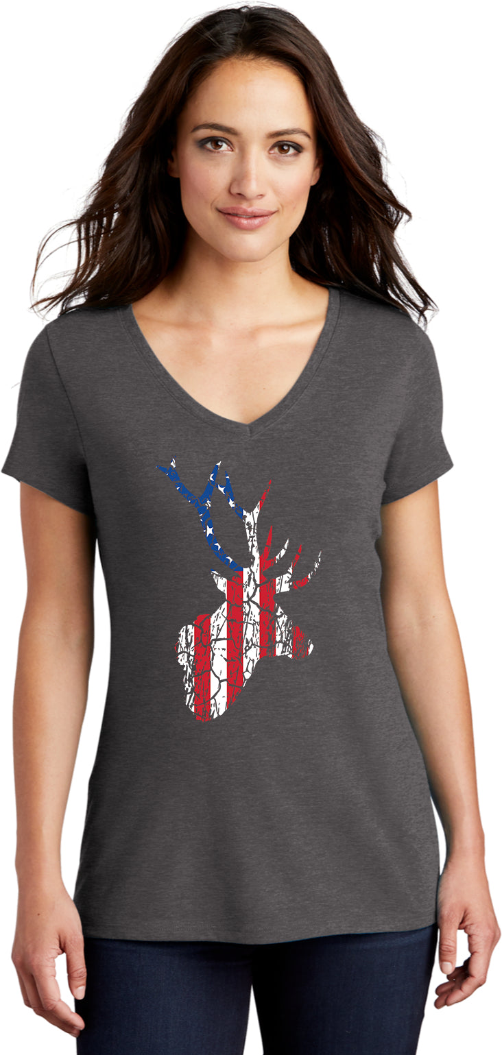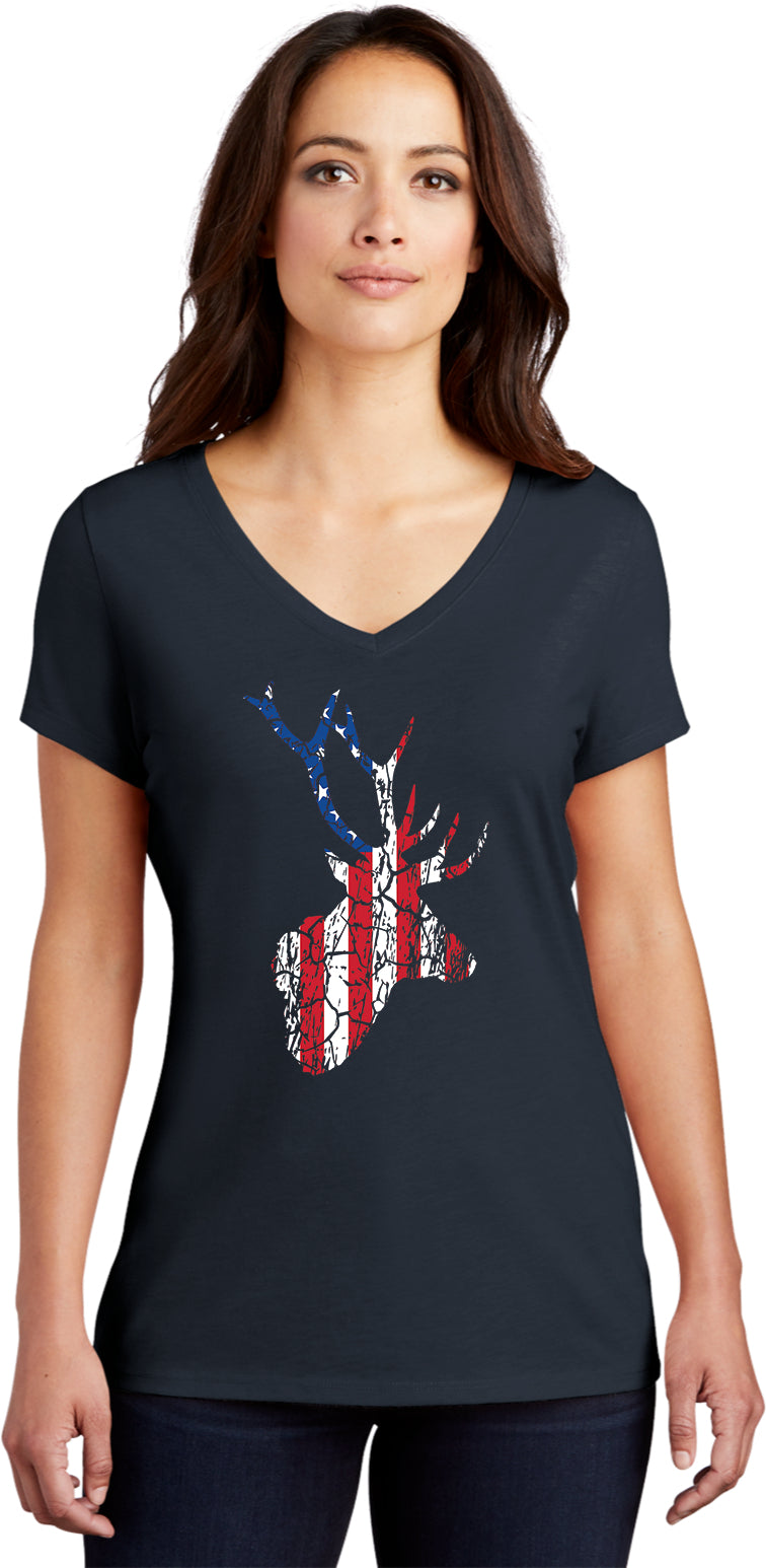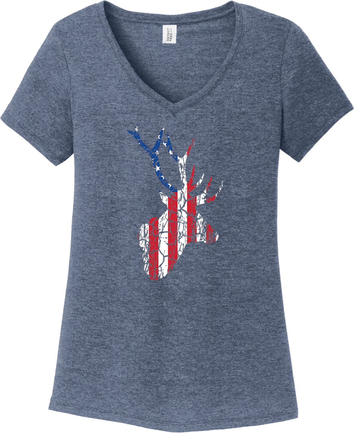 A patriotic deer relaxed fit ladies tri blend v-neck shirt. Made from a soft and comfortable blend of cotton/polyester/rayon. The t-shirt features the American Flag in a deer silhouette. This shirt makes the perfect gift for all who are proud to be an American.