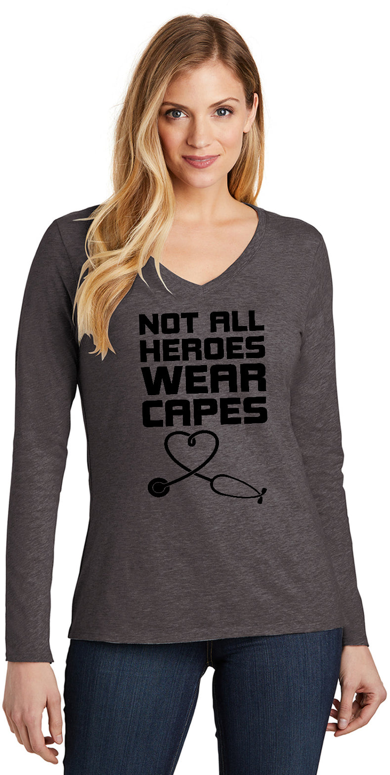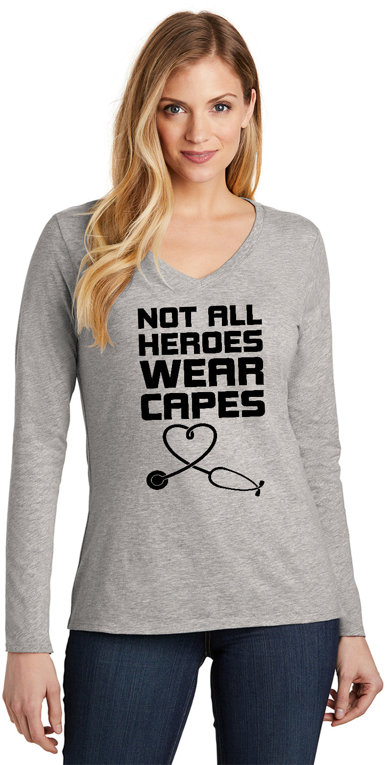 A ladies long sleeve v-neck t-shirt that is made of 100% cotton with the exception of Dark Grey and Grey which are made with a blend of cotton/polyester. The tshirt reads Not All Heroes Wear Capes with a picture of a stethoscope shaped in a heart. This tee makes a great gift for Doctors and Nurses. It is also great to wear to support a loved one who is in the medical field.