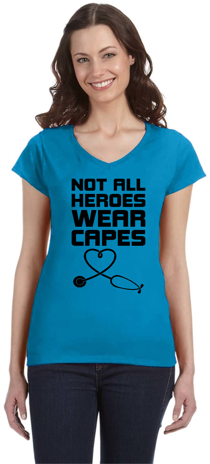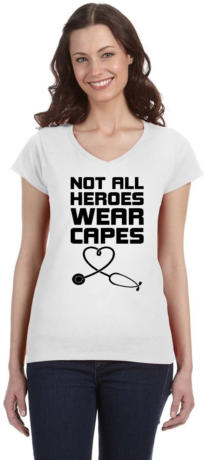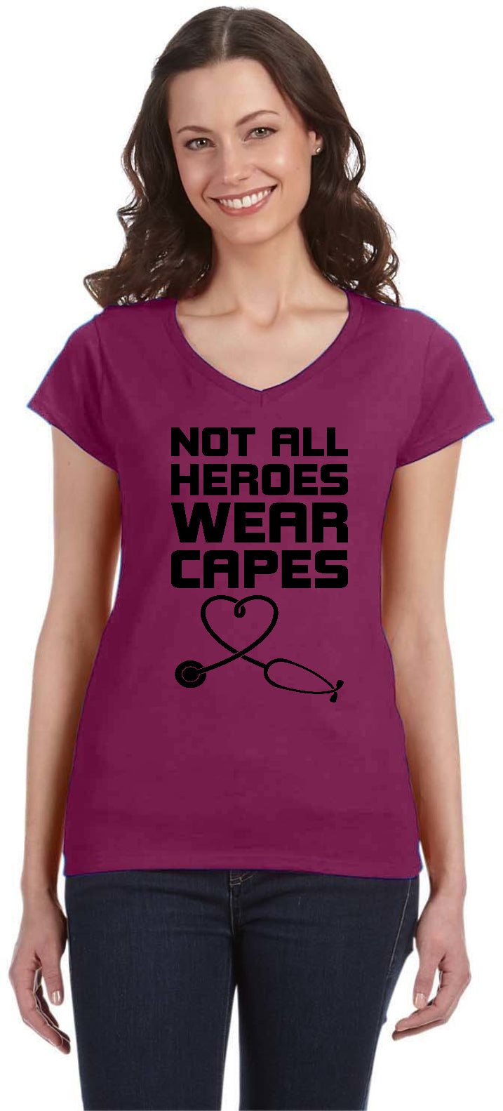 A ladies v-neck t-shirt with a fitted silhouette. It is made of 100% cotton with the exception of heathered colors which are made with a blend of cotton/polyester. The tshirt reads Not All Heroes Wear Capes with a picture of a stethoscope shaped in a heart. This tee makes a great gift for Doctors and Nurses. It is also great to wear to support a loved one who is in the medical field.