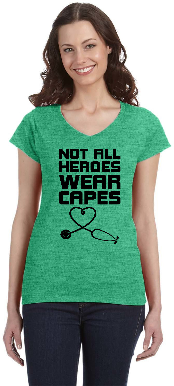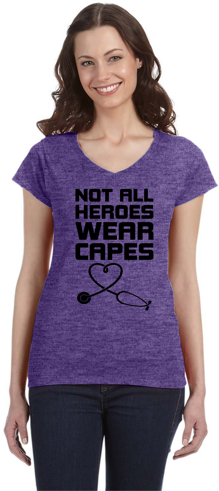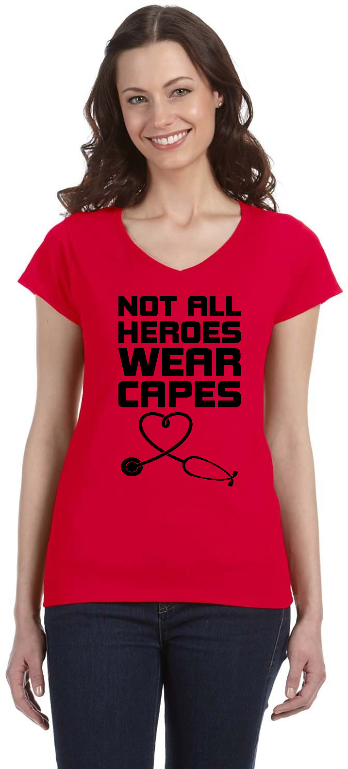 A ladies v-neck t-shirt with a fitted silhouette. It is made of 100% cotton with the exception of heathered colors which are made with a blend of cotton/polyester. The tshirt reads Not All Heroes Wear Capes with a picture of a stethoscope shaped in a heart. This tee makes a great gift for Doctors and Nurses. It is also great to wear to support a loved one who is in the medical field.
