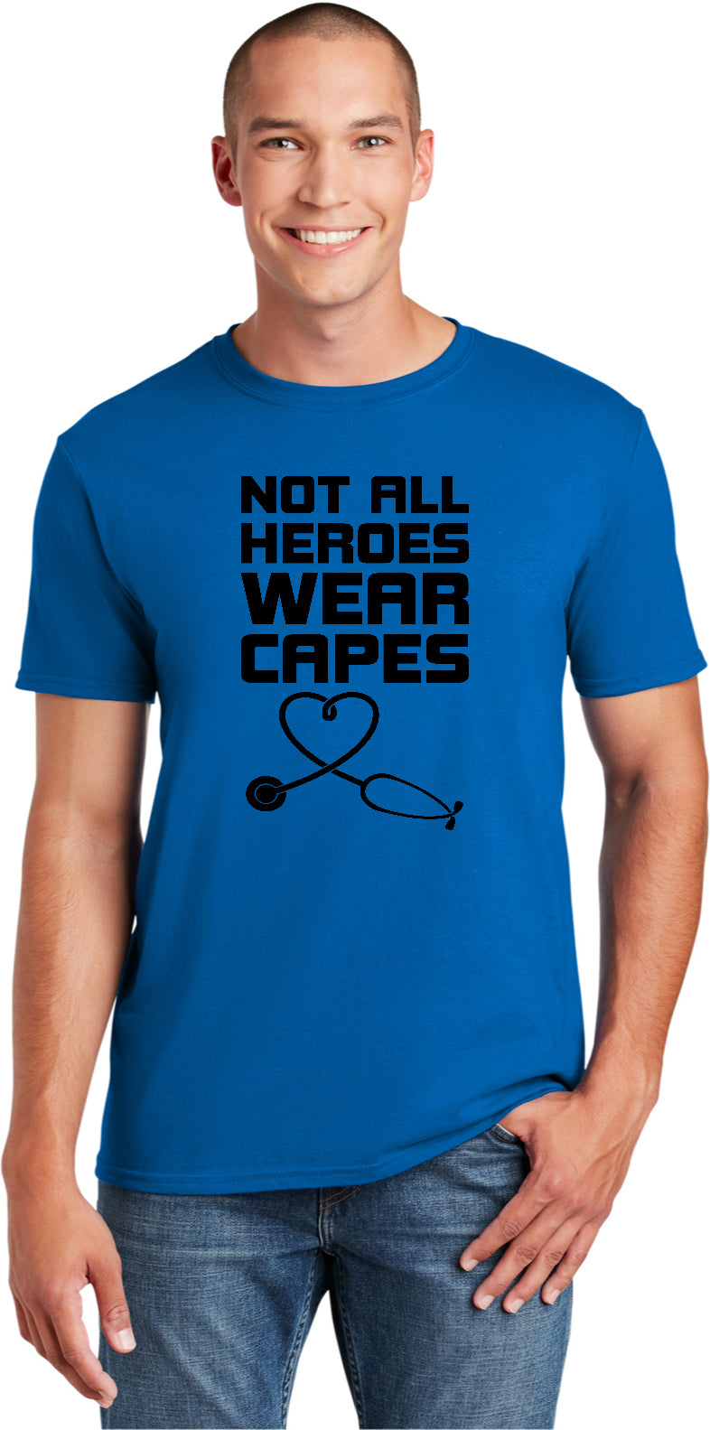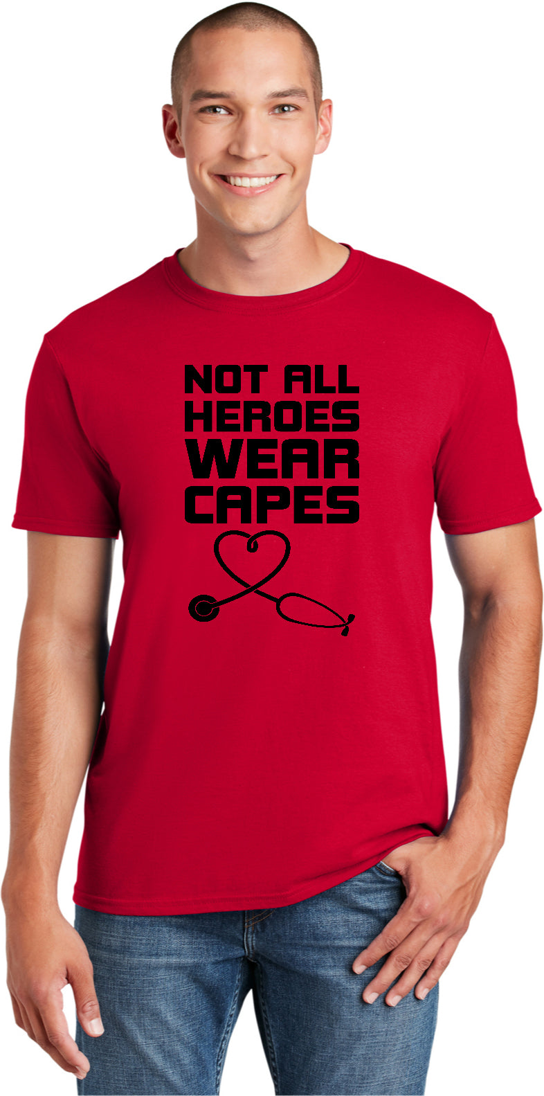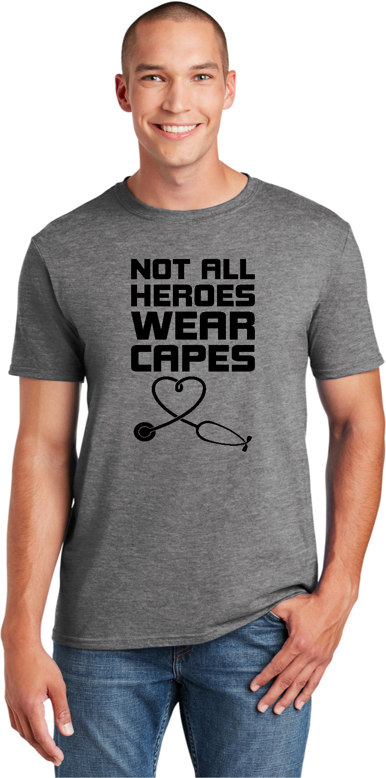 A unisex adult t-shirt with a tradtional silhouette to comfortably fit both men and women. It is made of 100% ring spun cotton for a super soft touch. Heathered colors are made with a blend of cotton/polyester. The tshirt reads Not All Heroes Wear Capes with a picture of a stethoscope shaped in a heart. This tee makes a great gift for Doctors and Nurses. It is also great to wear to support a loved one who is in the medical field.