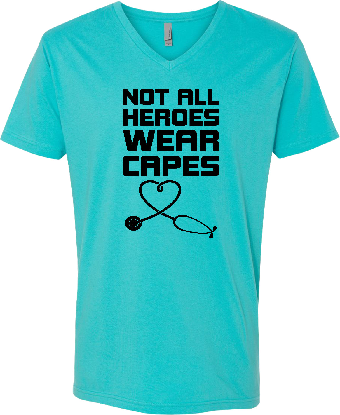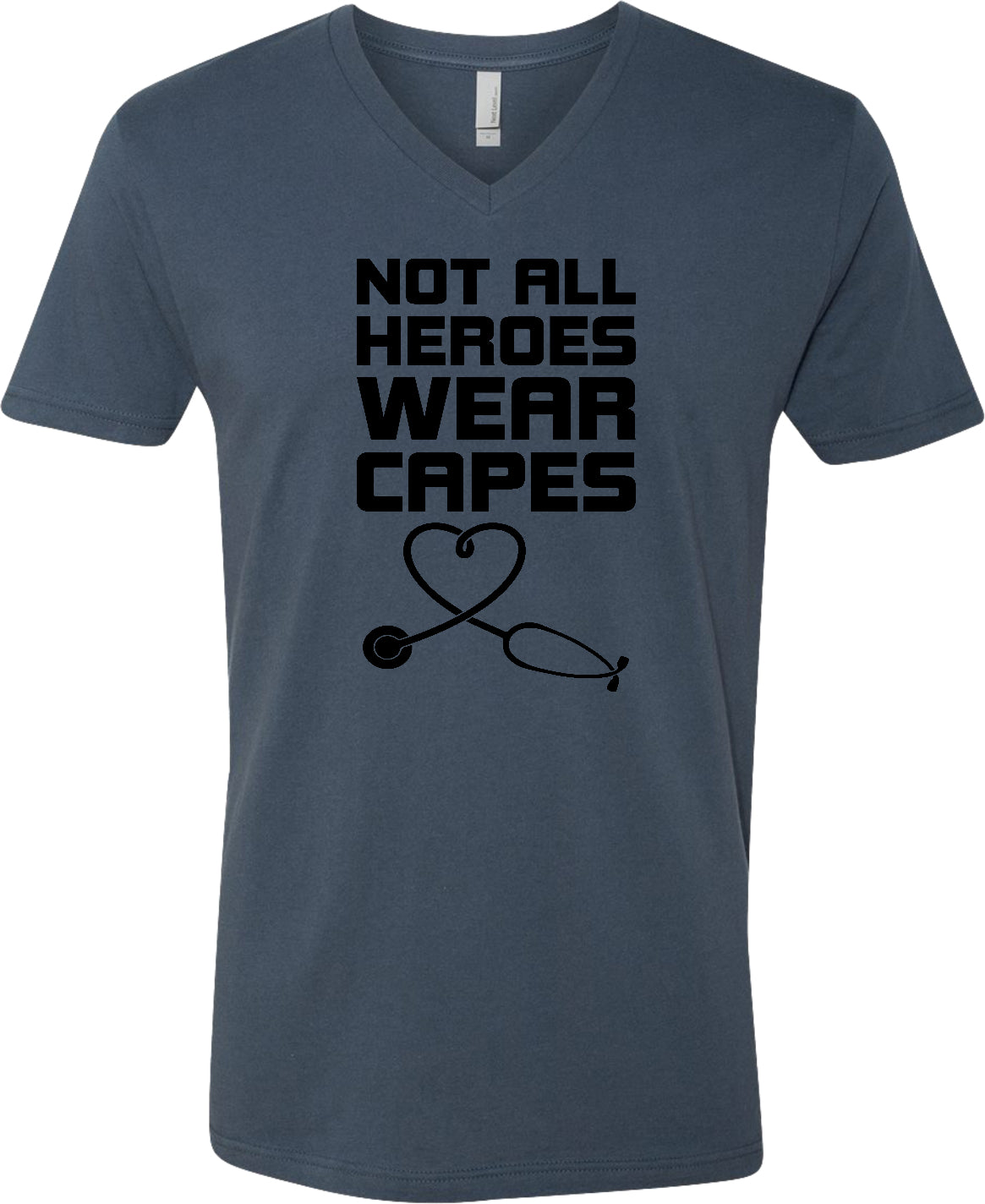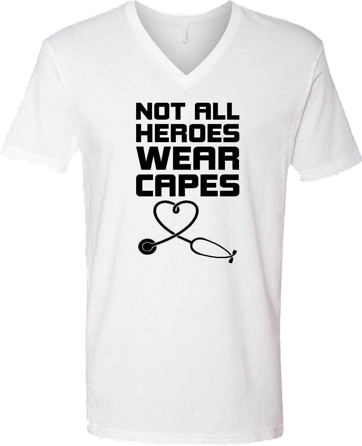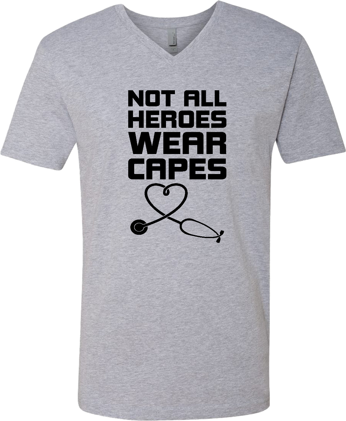 A unisex adult v-neck t-shirt with a tradtional silhouette to comfortably fit both men and women. It is made of 100% cotton with the exception of Grey which is made with a blend of cotton/polyester. The tshirt reads Not All Heroes Wear Capes with a picture of a stethoscope shaped in a heart. This tee makes a great gift for Doctors and Nurses. It is also great to wear to support a loved one who is in the medical field.