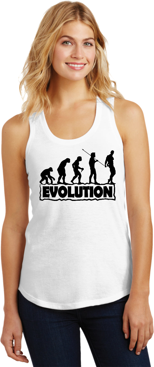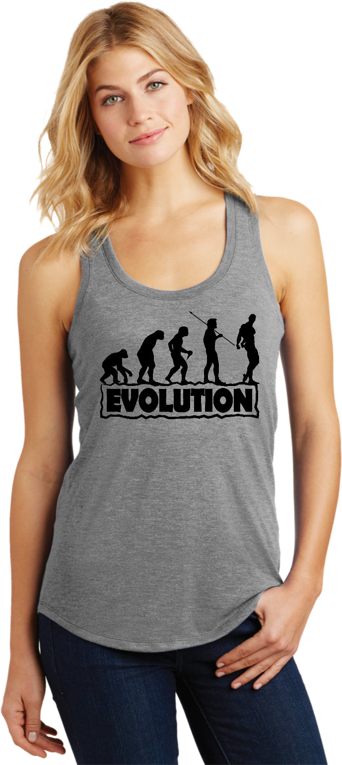 • A ladies racerback tank top featuring the stages of human evolution