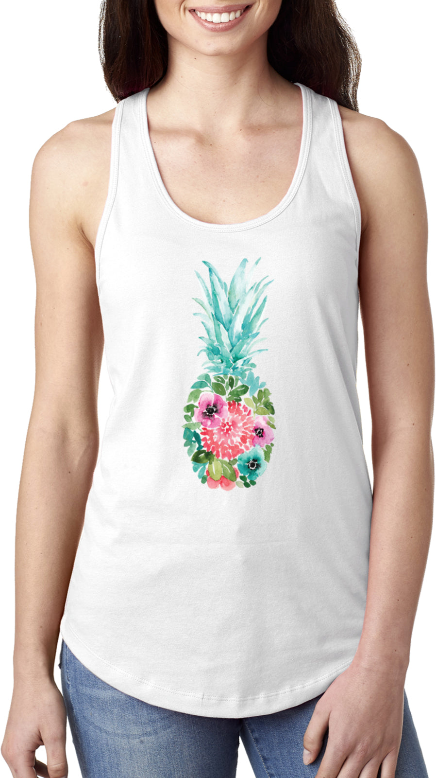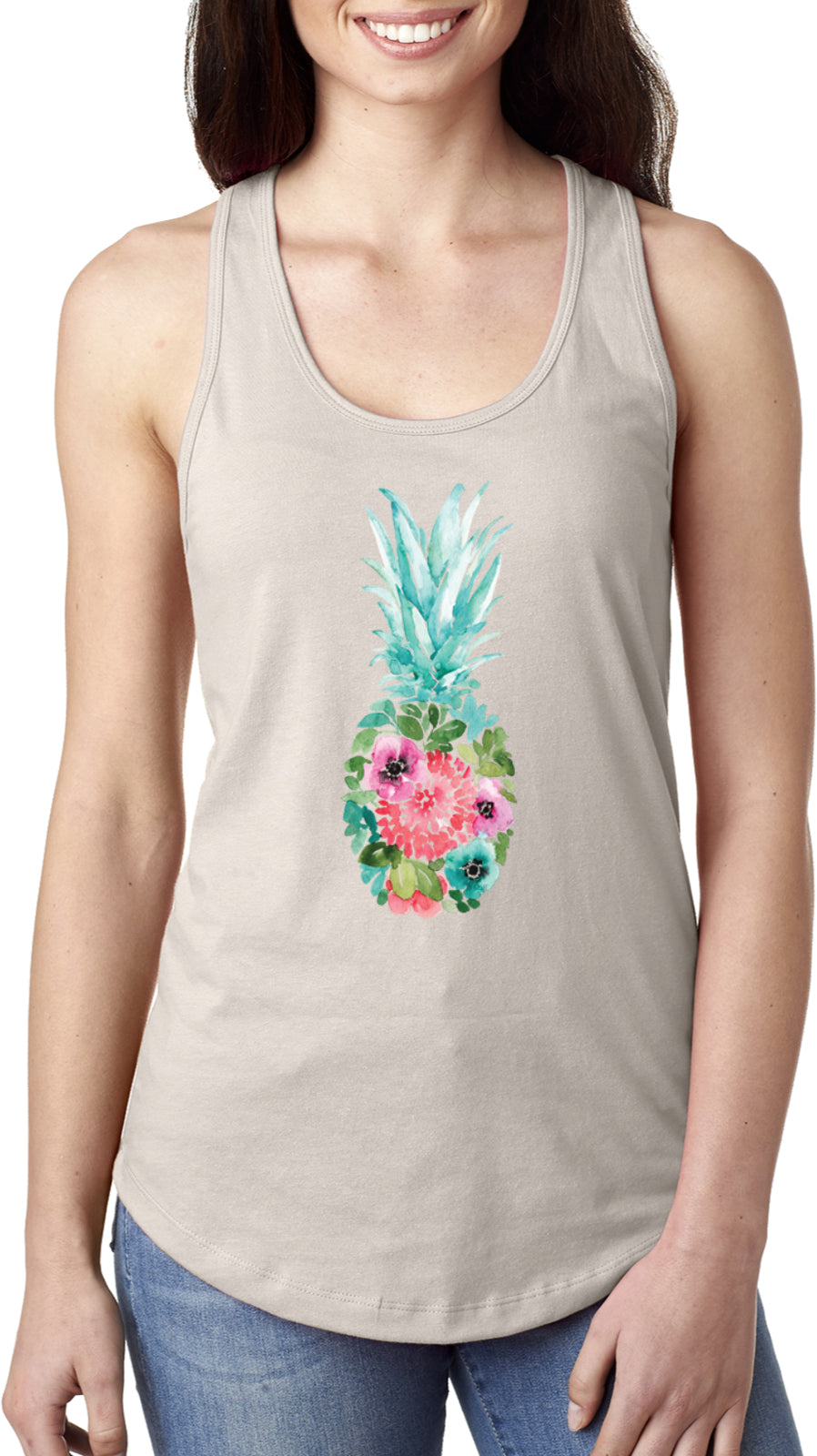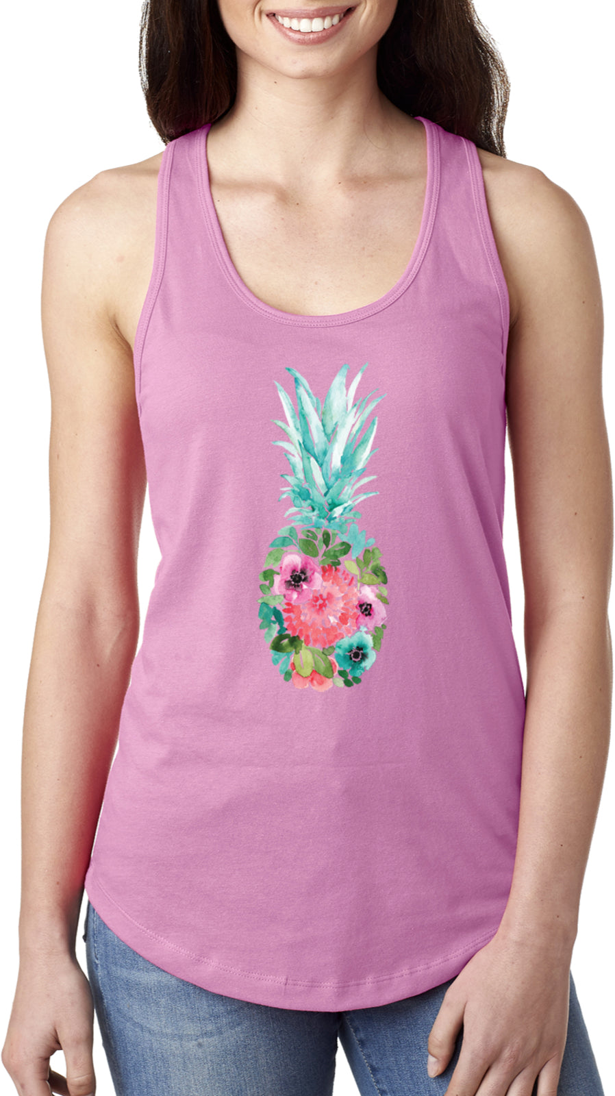 A womens racerback tank top with a slim fit silhouette. (For a relaxed fit order one to two sizes up) It is made with a comfortable blend of cotton/polyester. The design features a colorful pineapple made of flowers. This sleeveless shirt is perfect to wear throughout spring and summer.