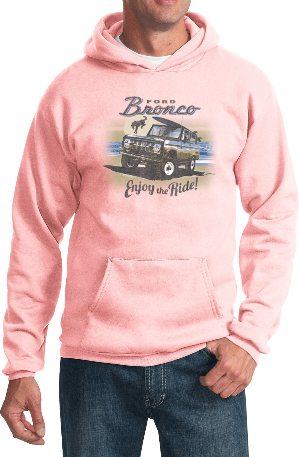 A unisex adult pullover hoodie that fits both men and women with its traditional silhouette. It is made with a comfortable blend of cotton/polyester. The design features a picture of a classic Ford Bronco and reads Enjoy the Ride. This hooded sweatshirt makes a perfect gift for birthdays, holidays or even just to treat yourself.