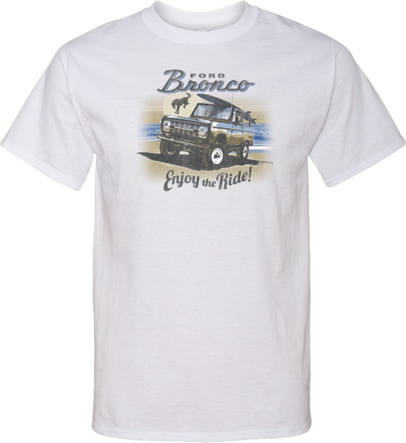 An adult tall t-shirt that is made of 100% cotton with the exception of Ash which is made with a blend of cotton/polyester. The design features a picture of a classic Ford Bronco and reads Enjoy the Ride. This shirt makes a perfect gift for birthdays, holidays or even just to treat yourself.
