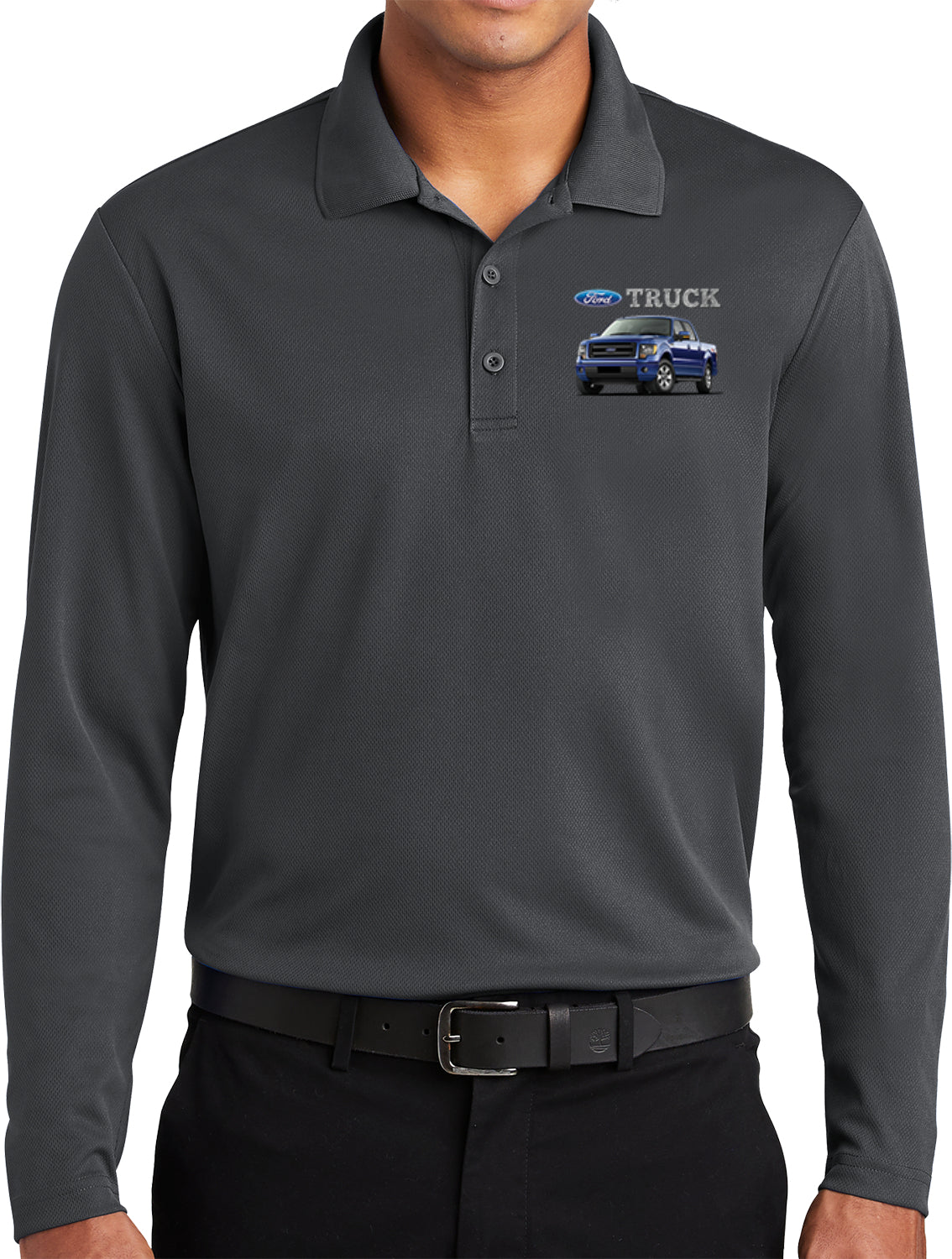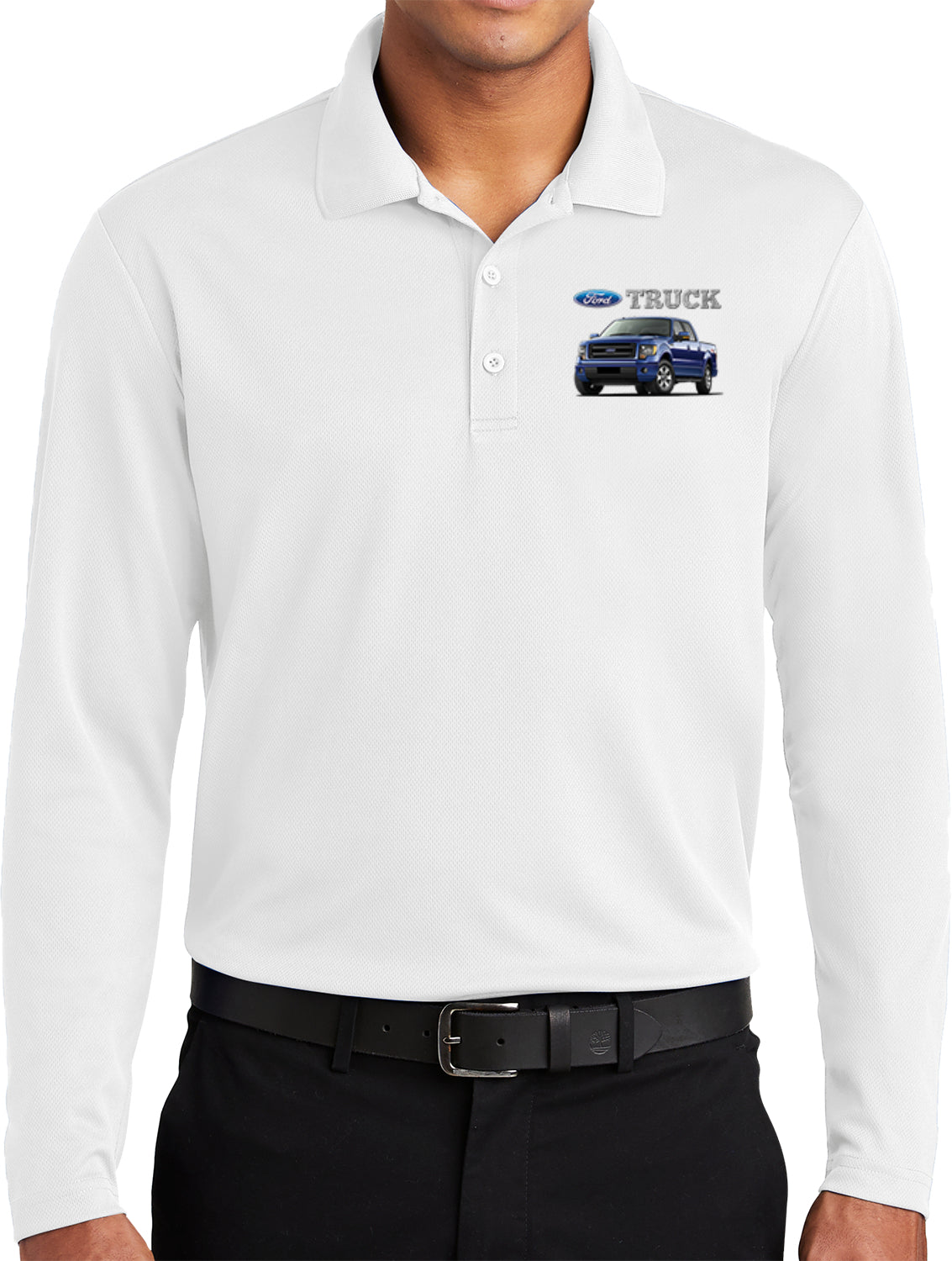 • A mens long sleeve polo shirt featuring a blue Ford F-150 Truck