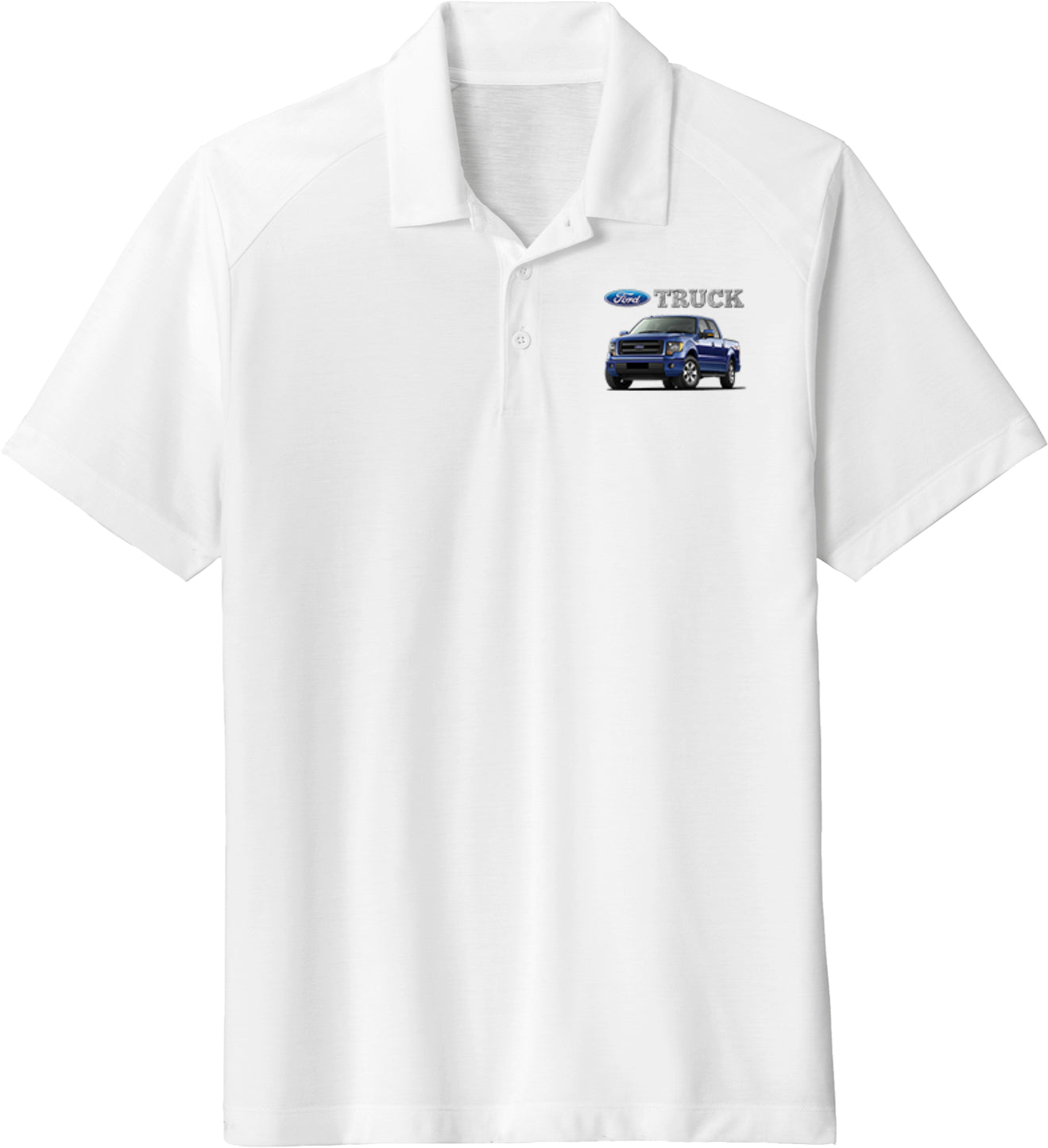 - A mens tri blend polo shirt featuring a blue Ford F-150 Truck