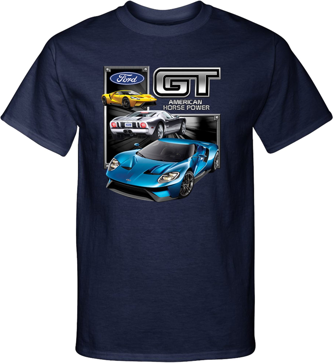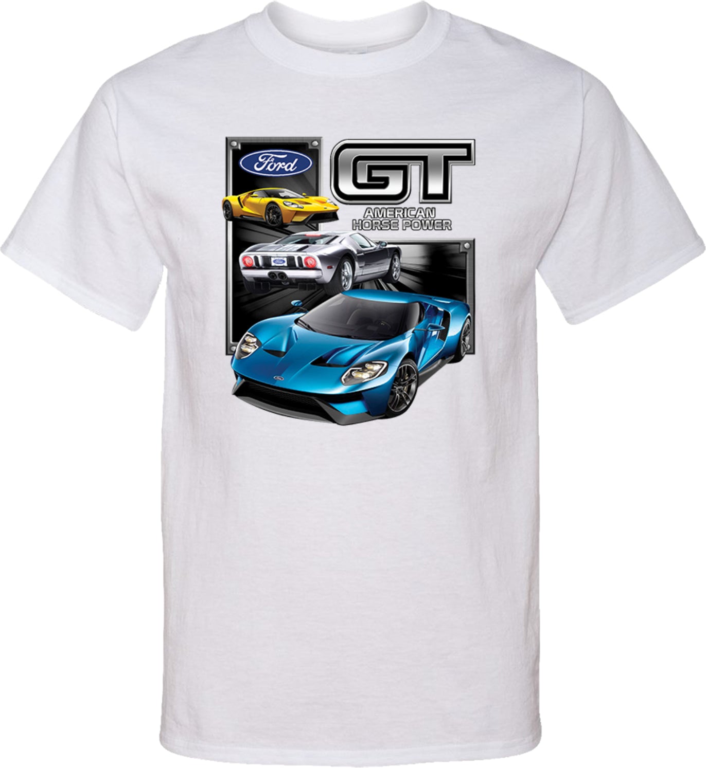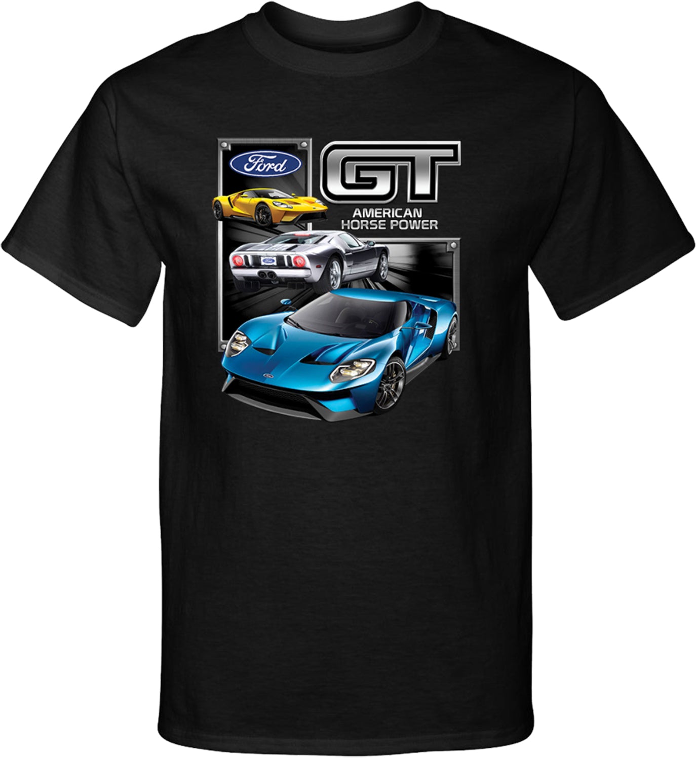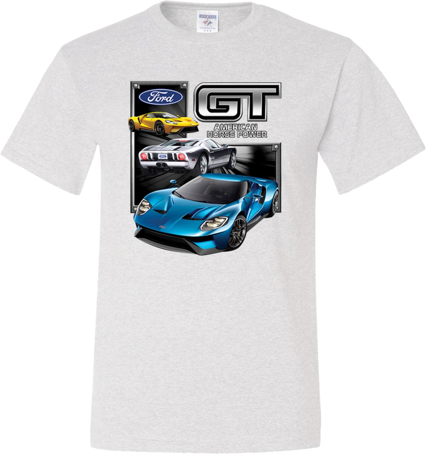 - A tall t-shirt featuring a collage of the Ford GT Supercar