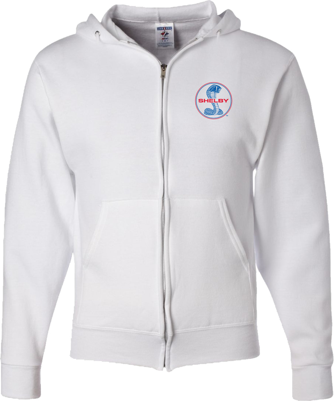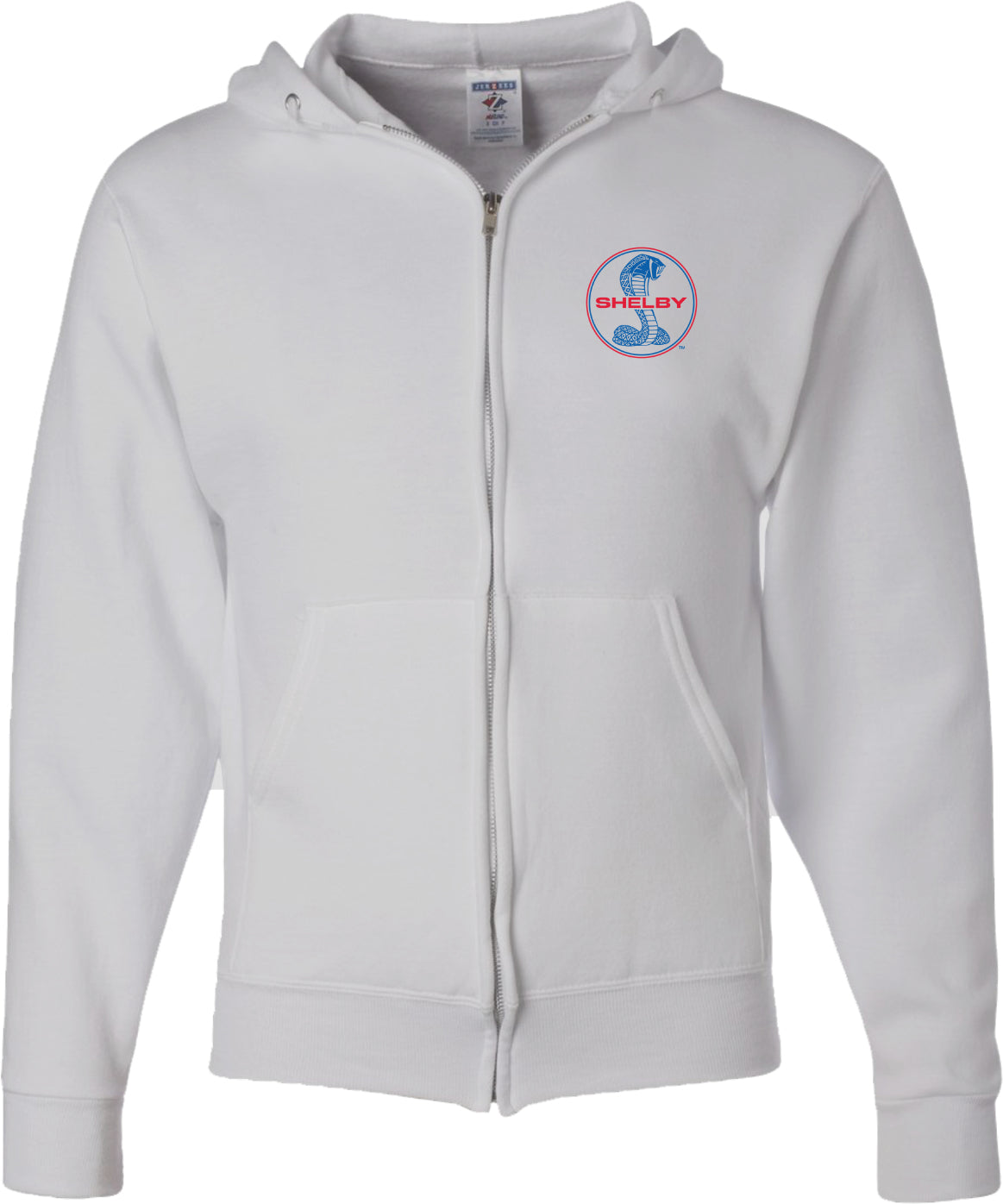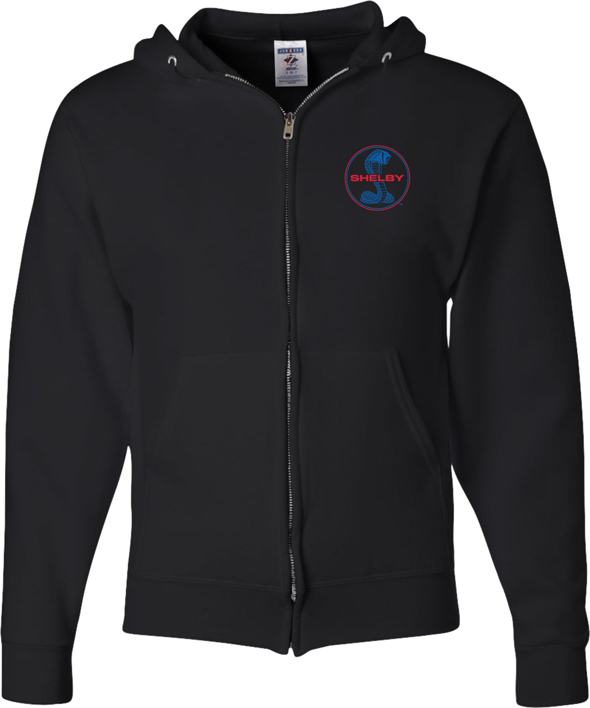 - A full zip hoodie featuring a blue and red Ford Mustang Shelby logo as a pocket print