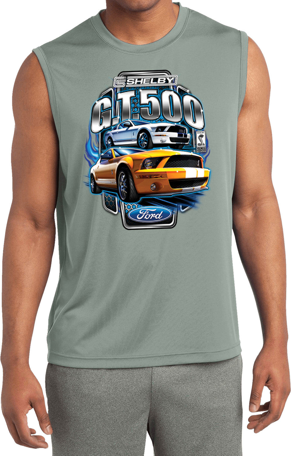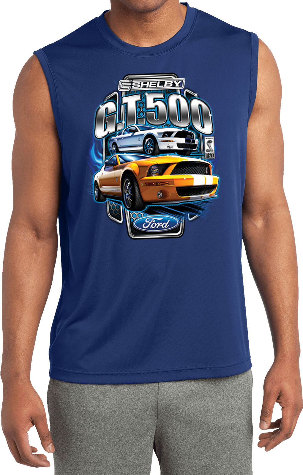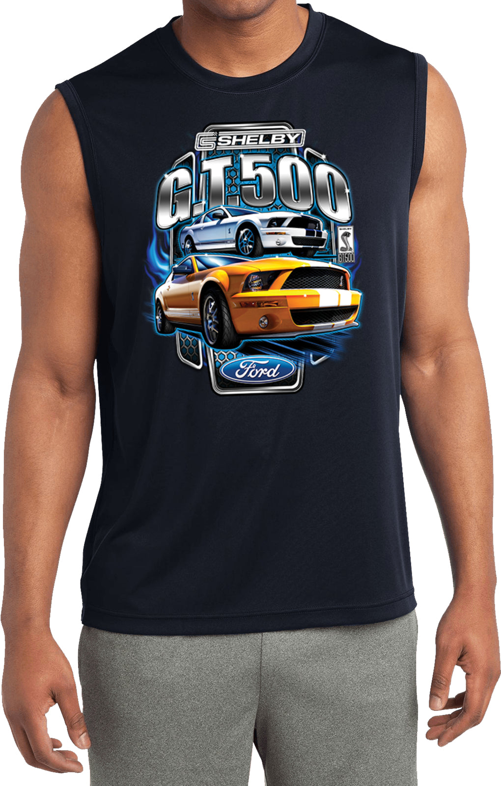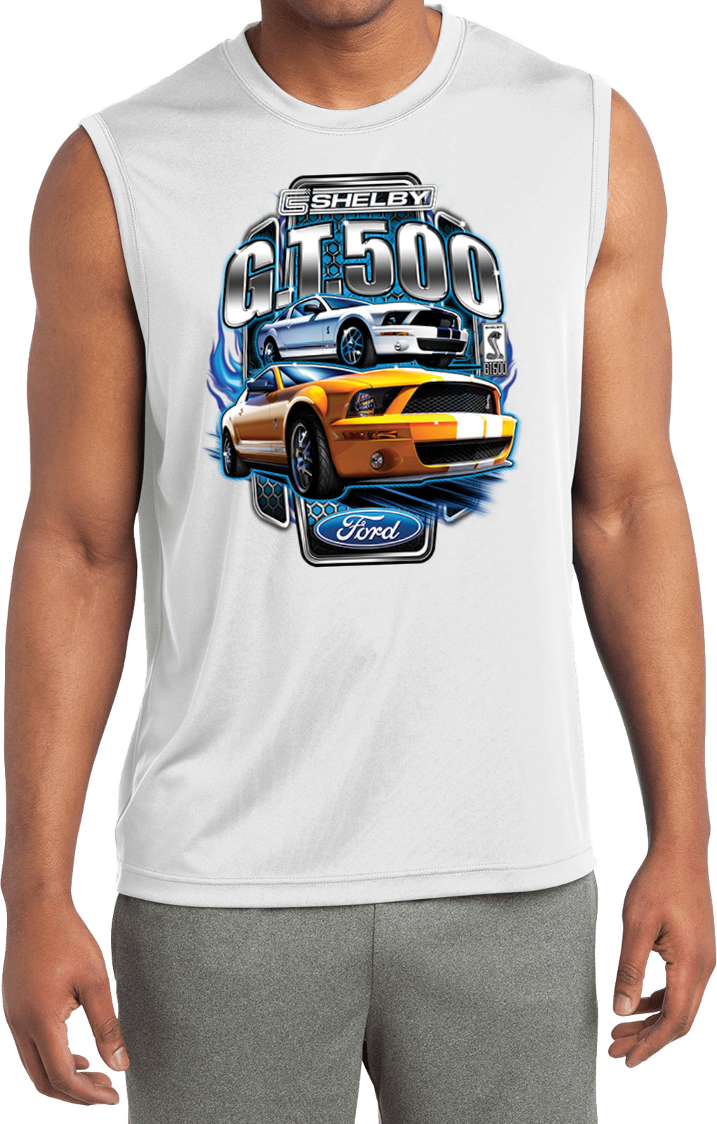 - A mens Ford dry wicking muscle shirt featuring a yellow and white Mustang Shelby GT500