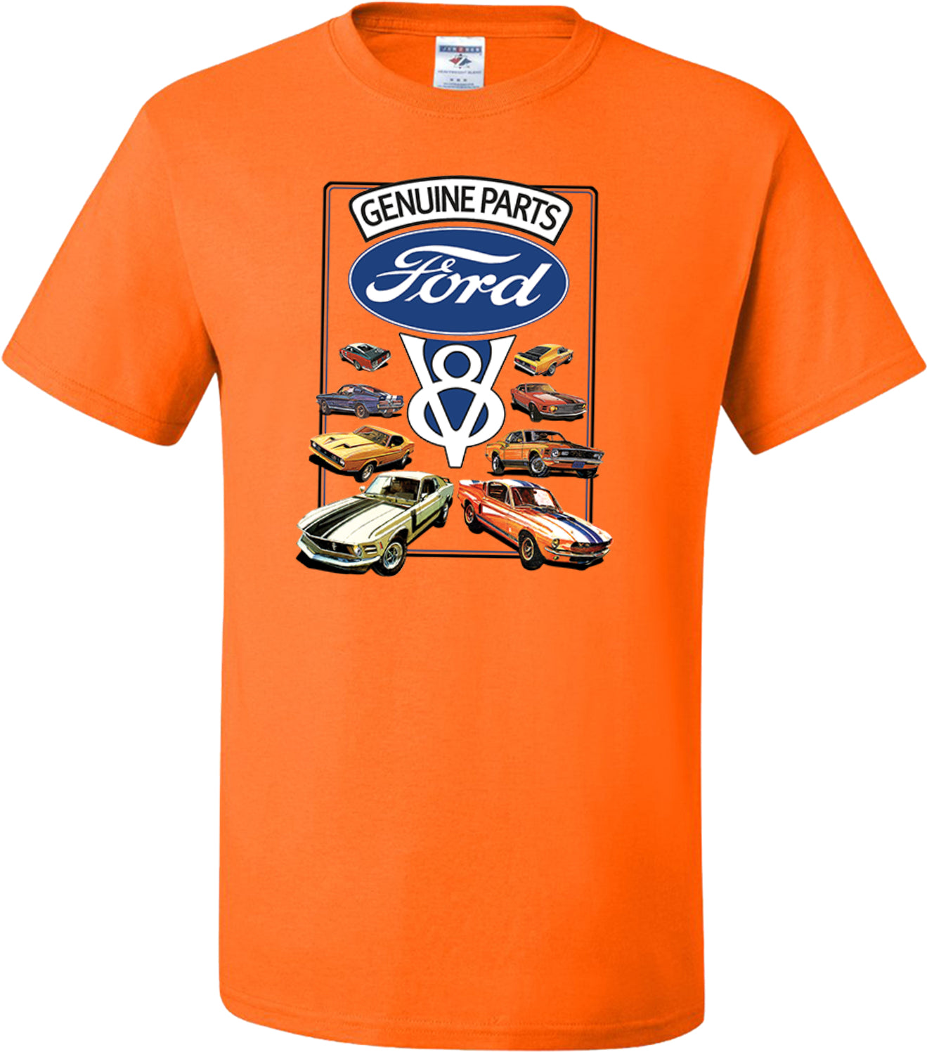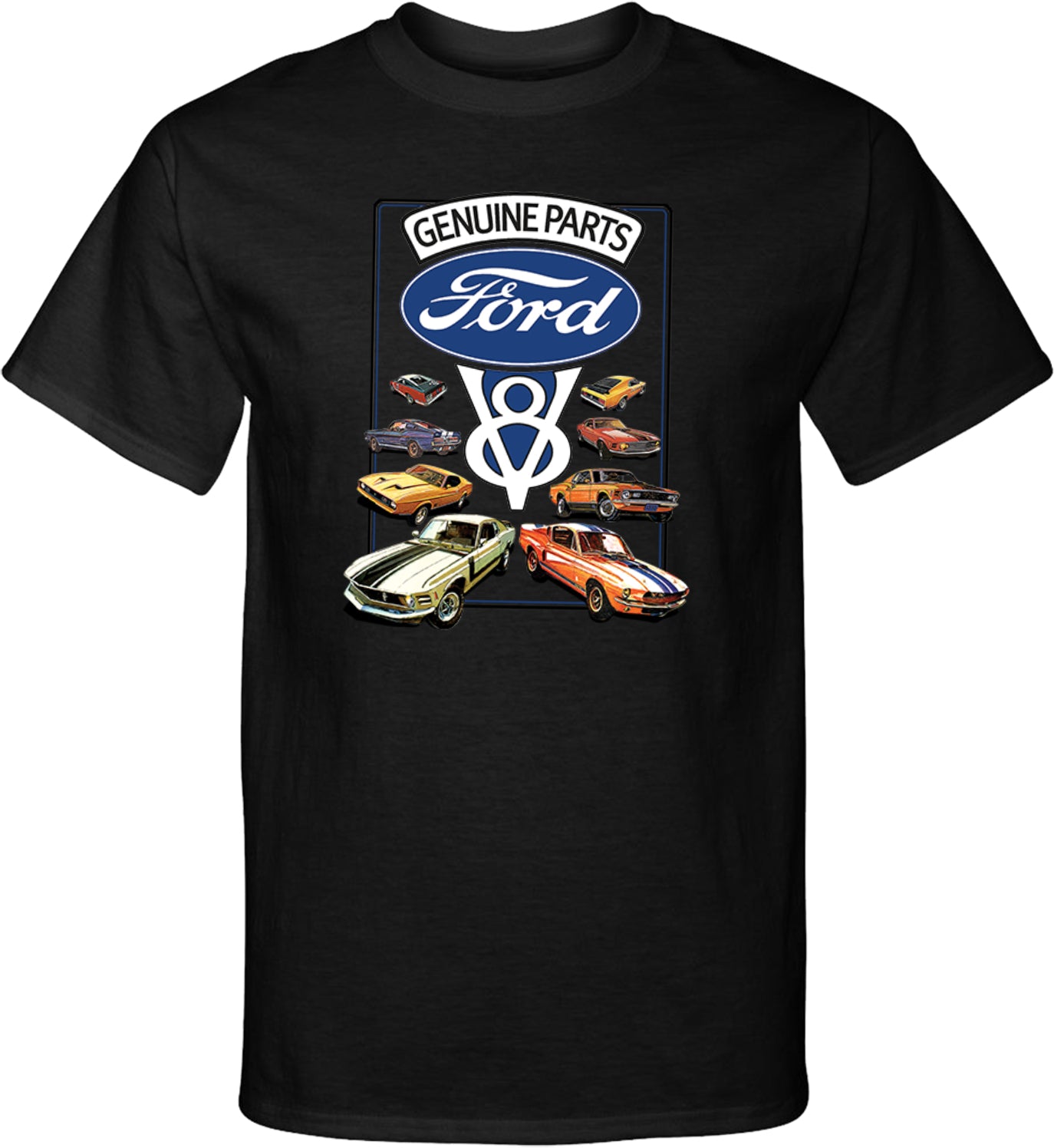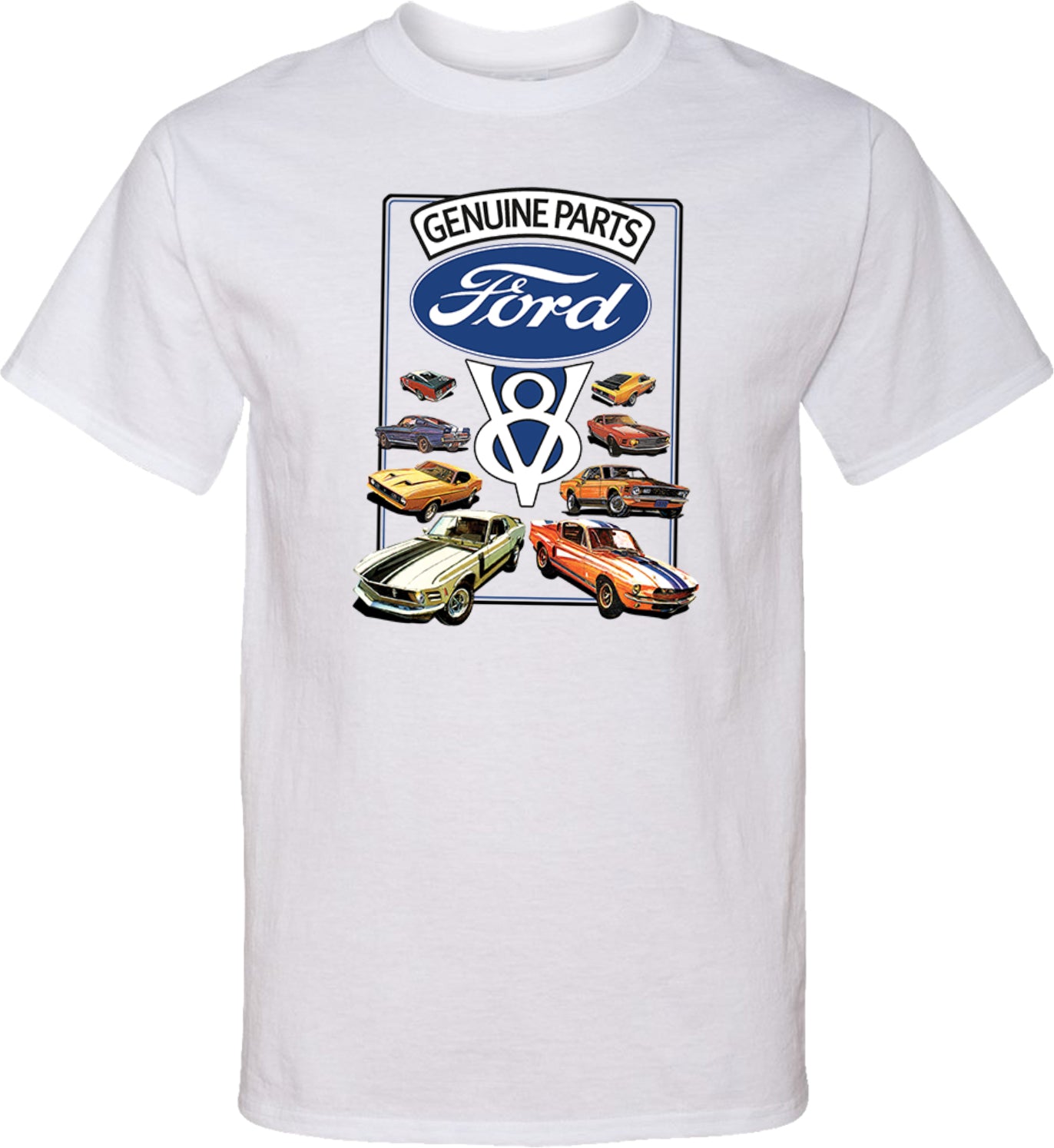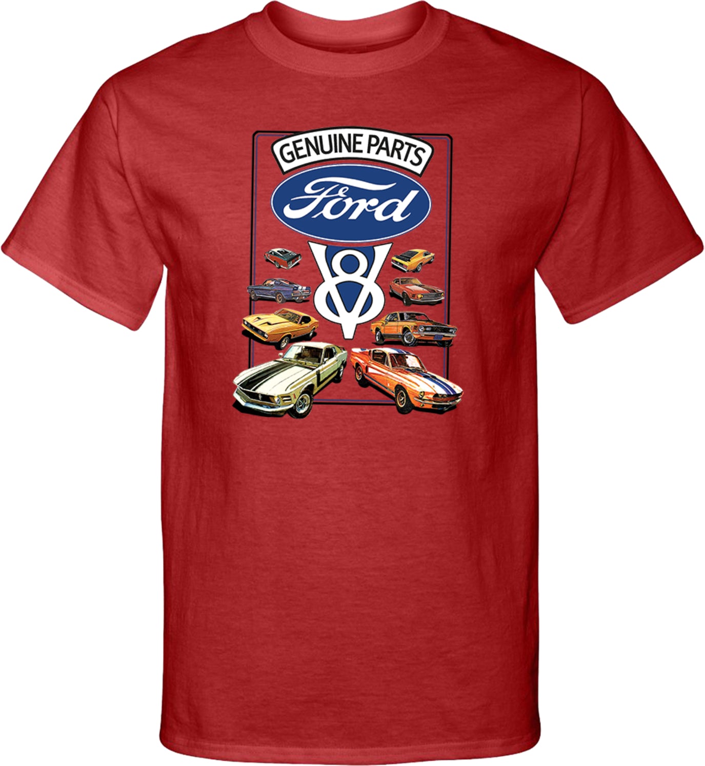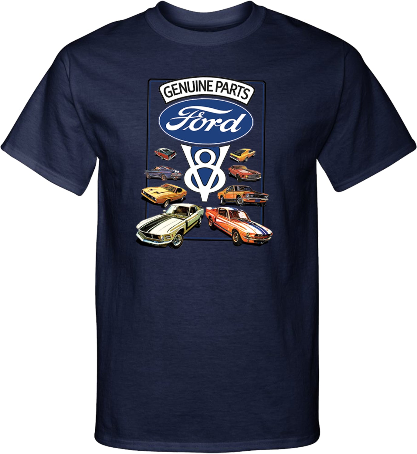 - A mens tall t-shirt featuring a collection of classic Ford Mustangs: Genuine Parts V8